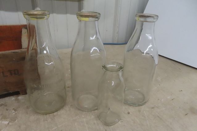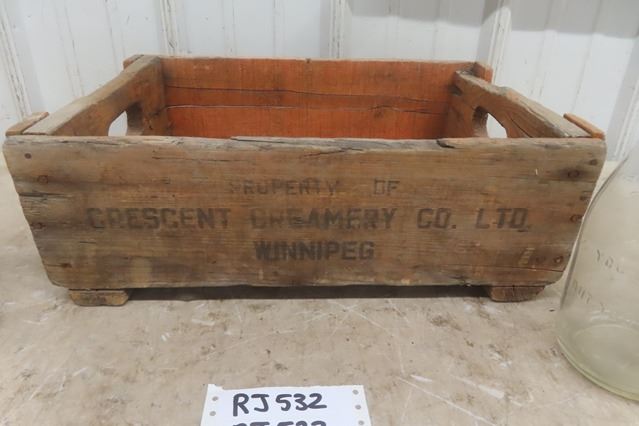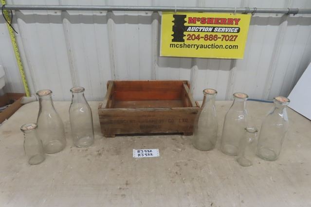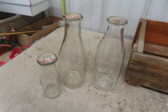 5 Milk Bottles, 2 Cream Bottles, Wooden Crescent Creamery Box