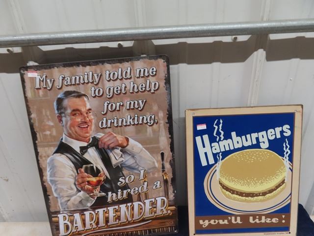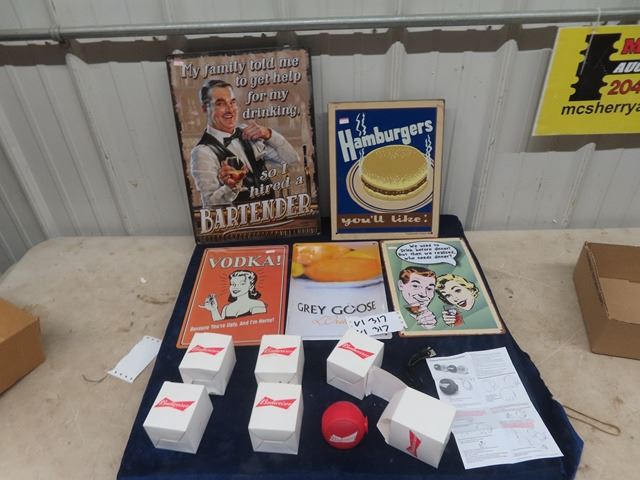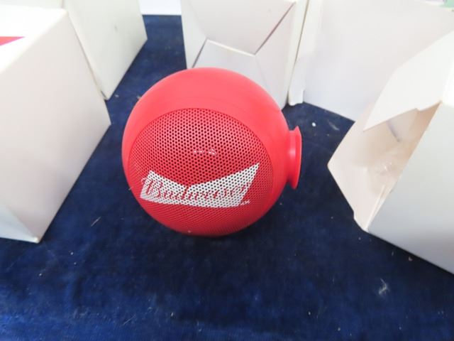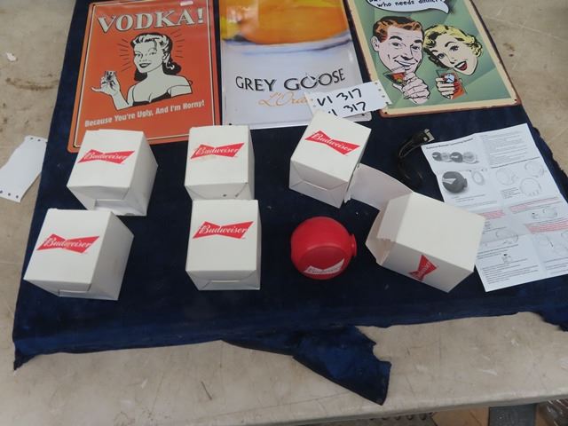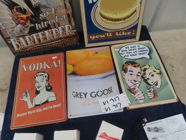 5 Modern Metal Signs- Bartender/Booze & 6 New Budweiser Blue Tooth Speakers