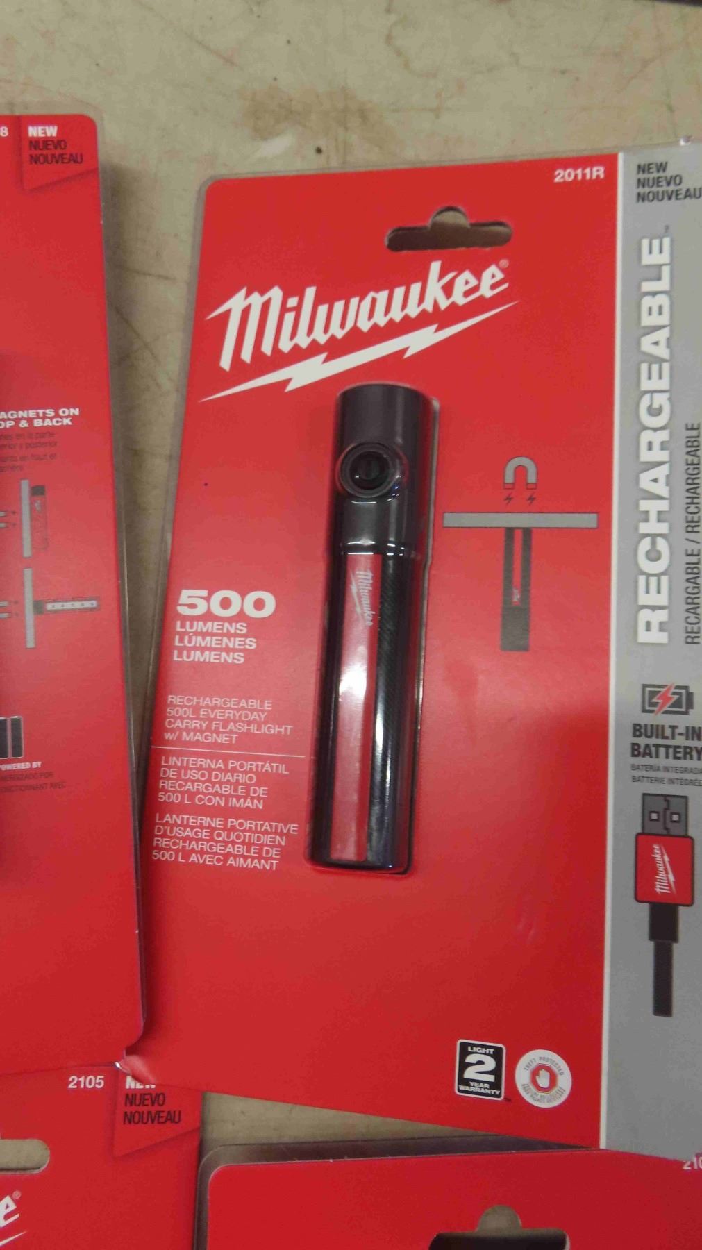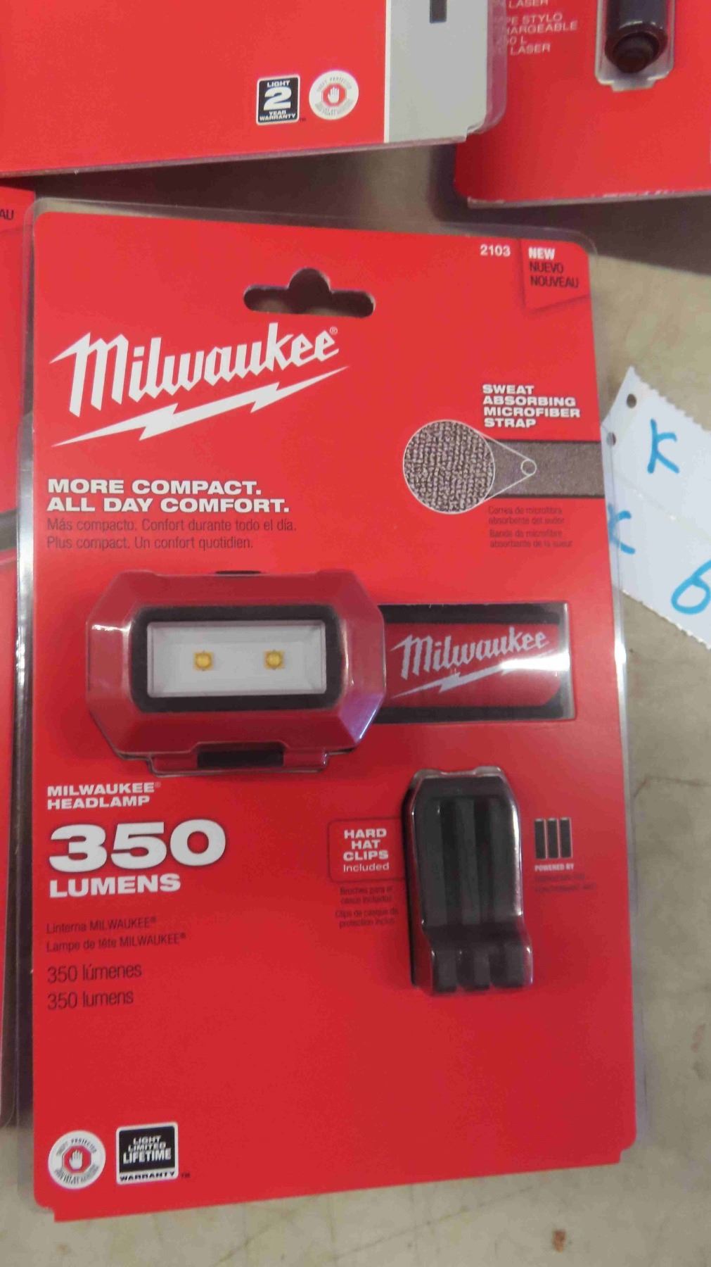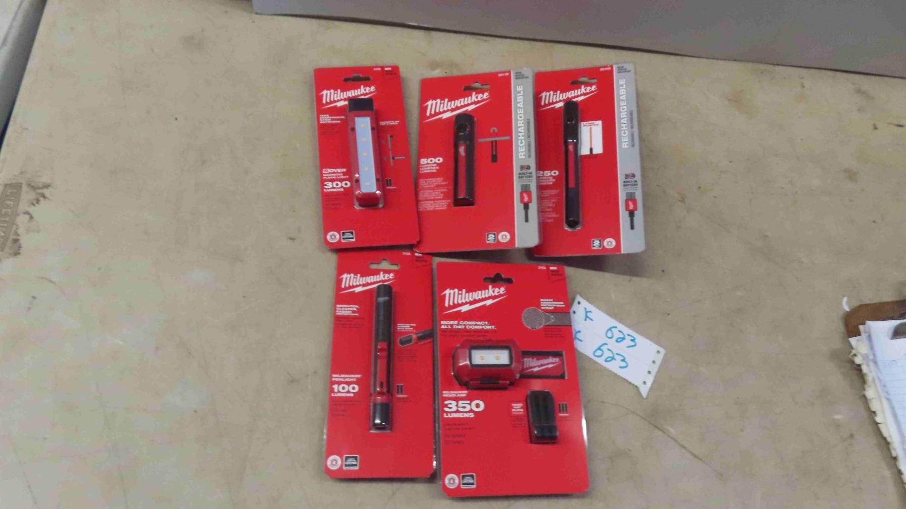 5 New in Package Milwaukee Lights: 350 Lumen Head Lamp , 500 Lumen Rechargable Flashlight, 250 Lumen Pen Light with Laser , 300 Lumen Magnetic Flood Light, 100 Lumen Pen Light