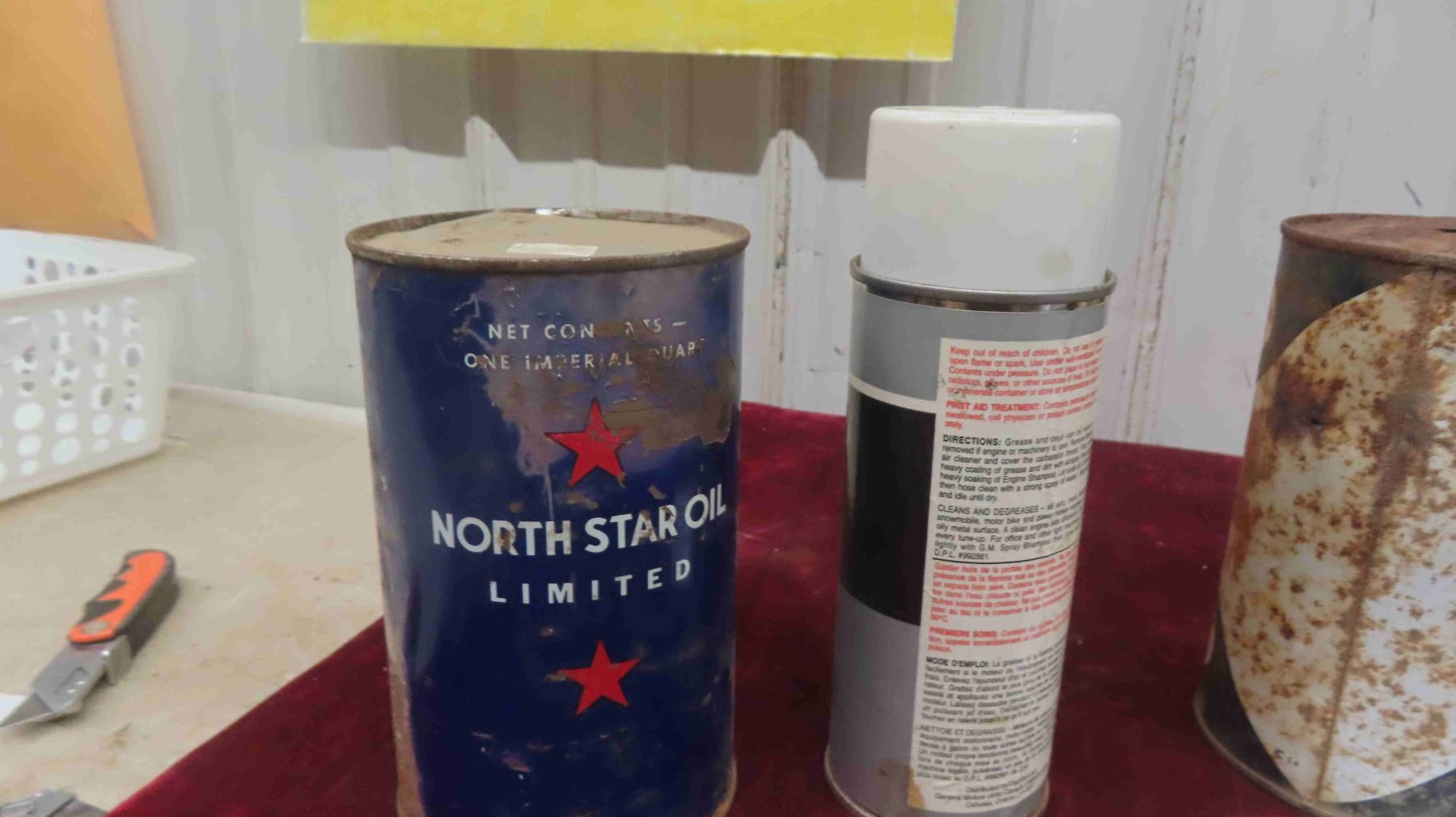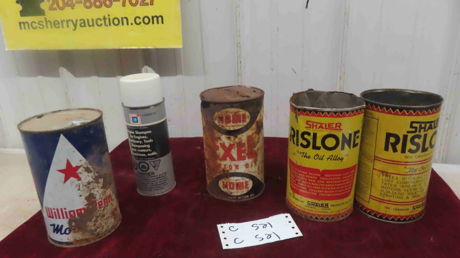 5 Oil Cans : North Star , (2) Shaler Rislone Quart, Rusty Exel , GM Engine Spray