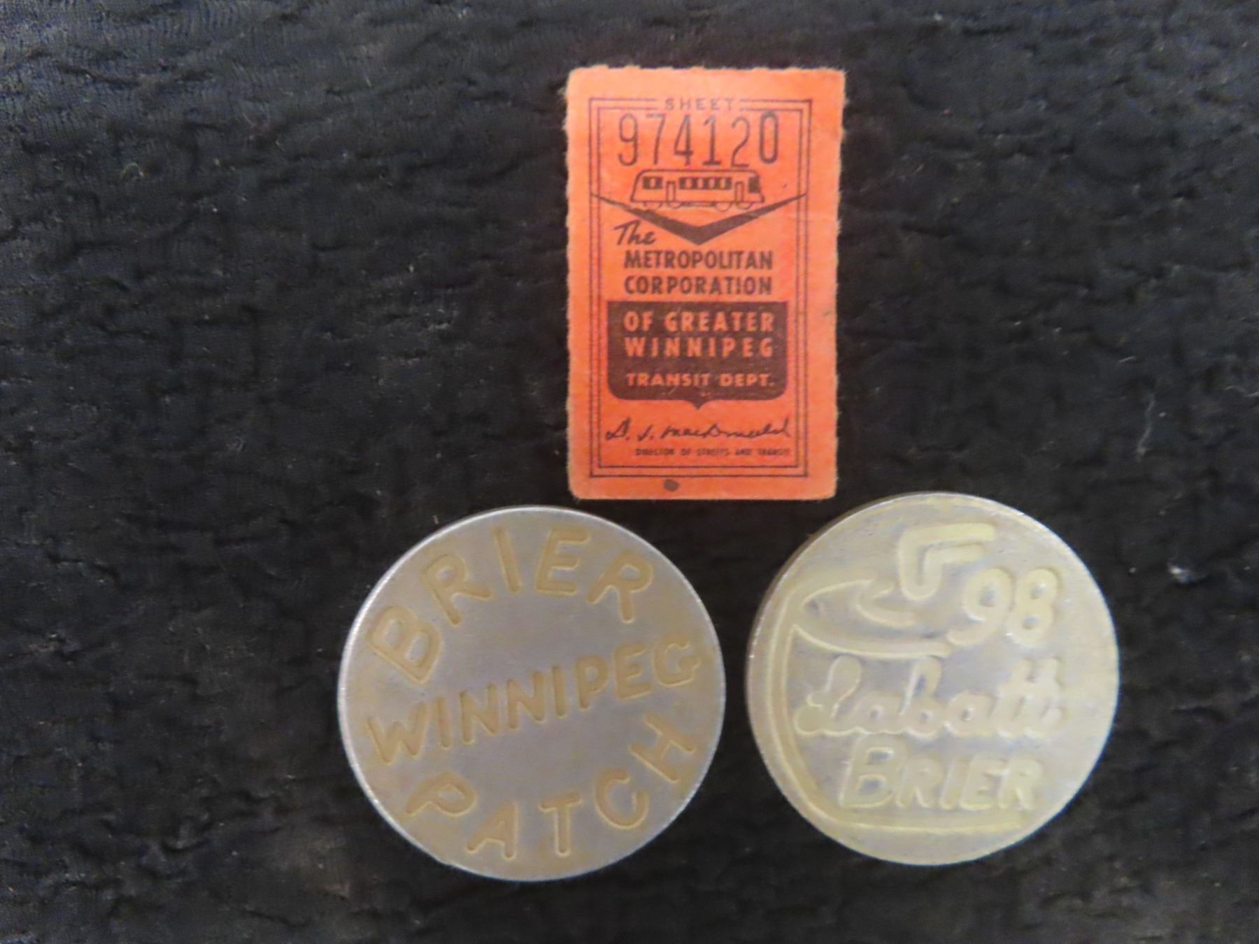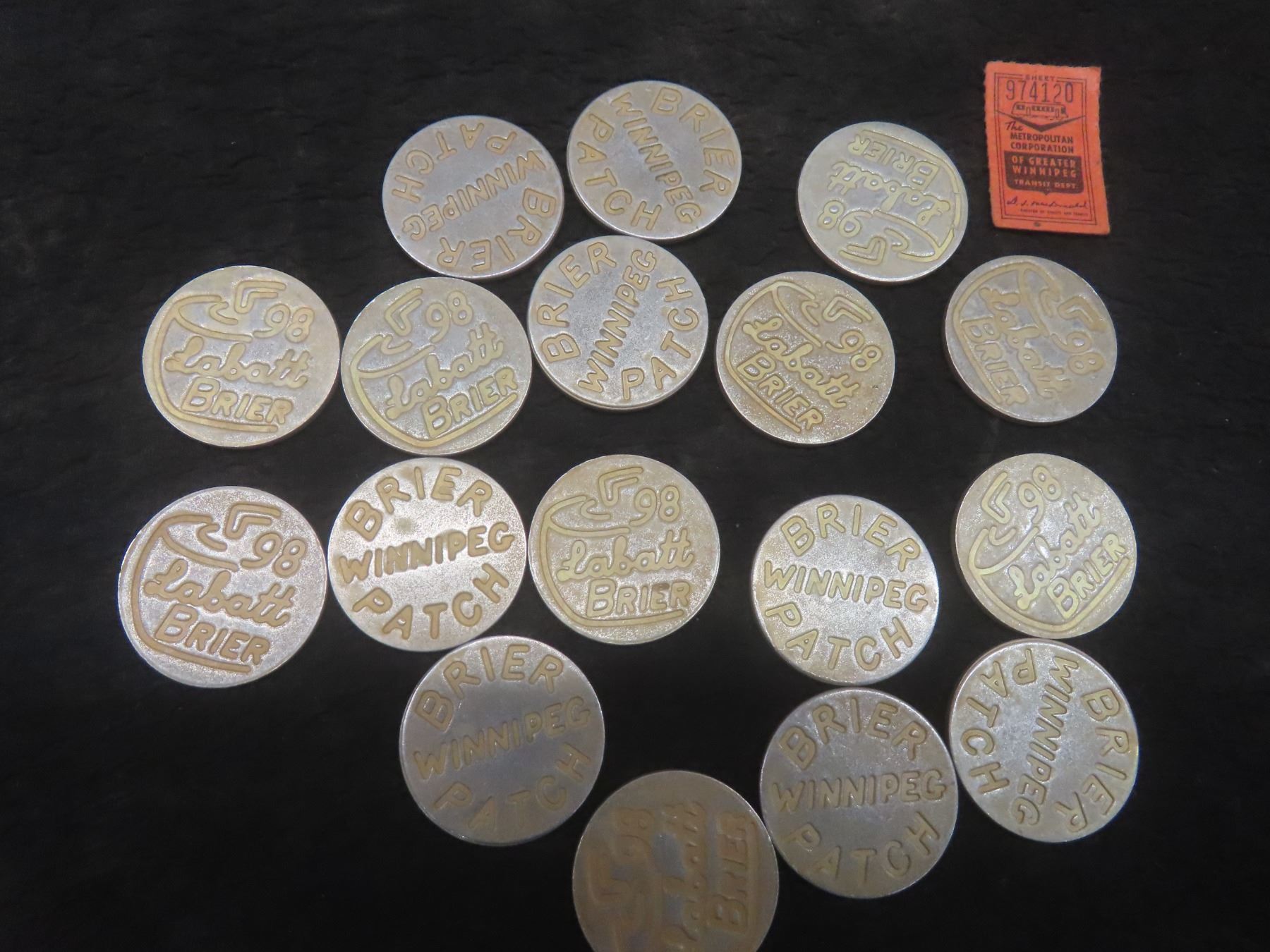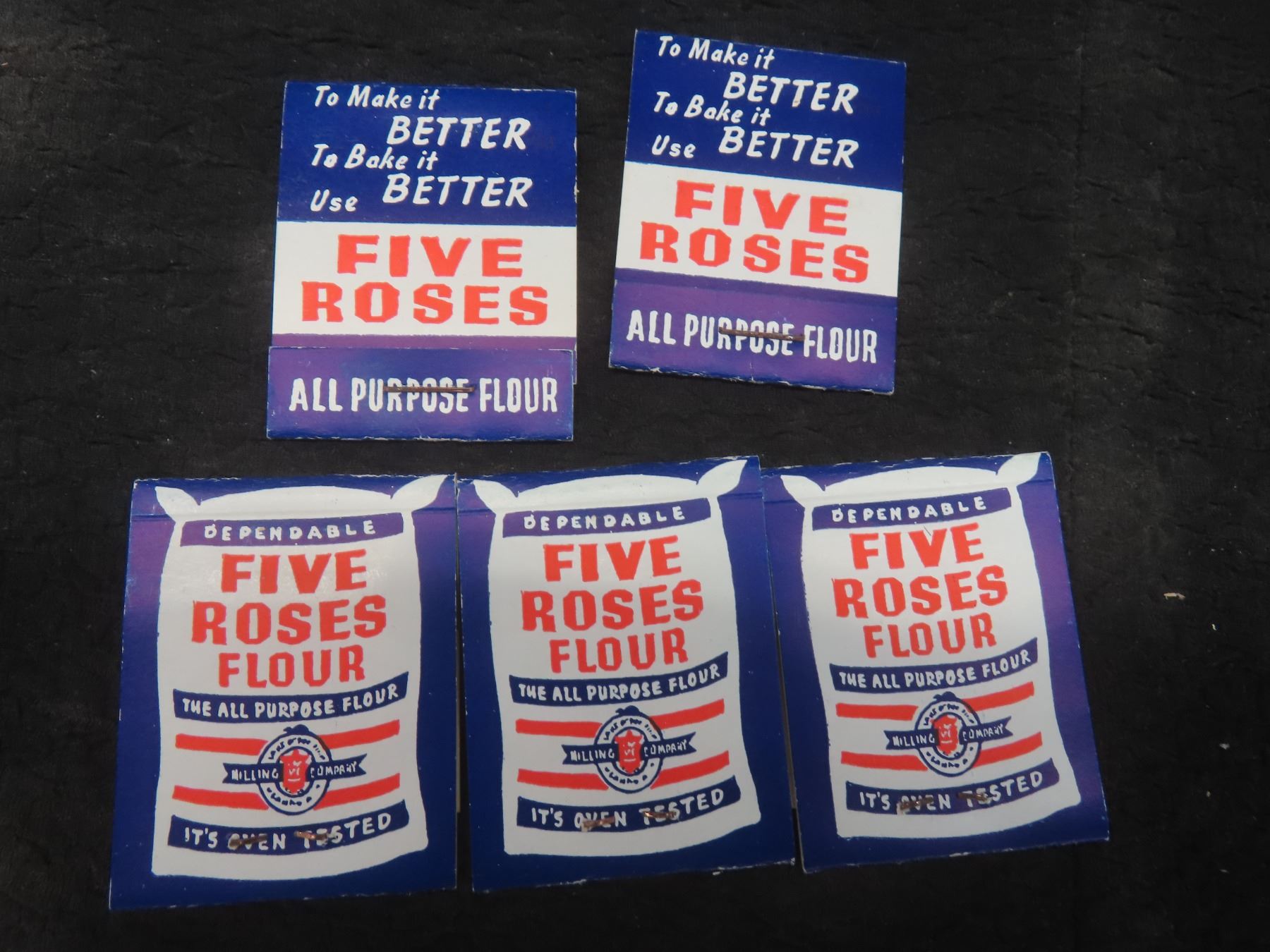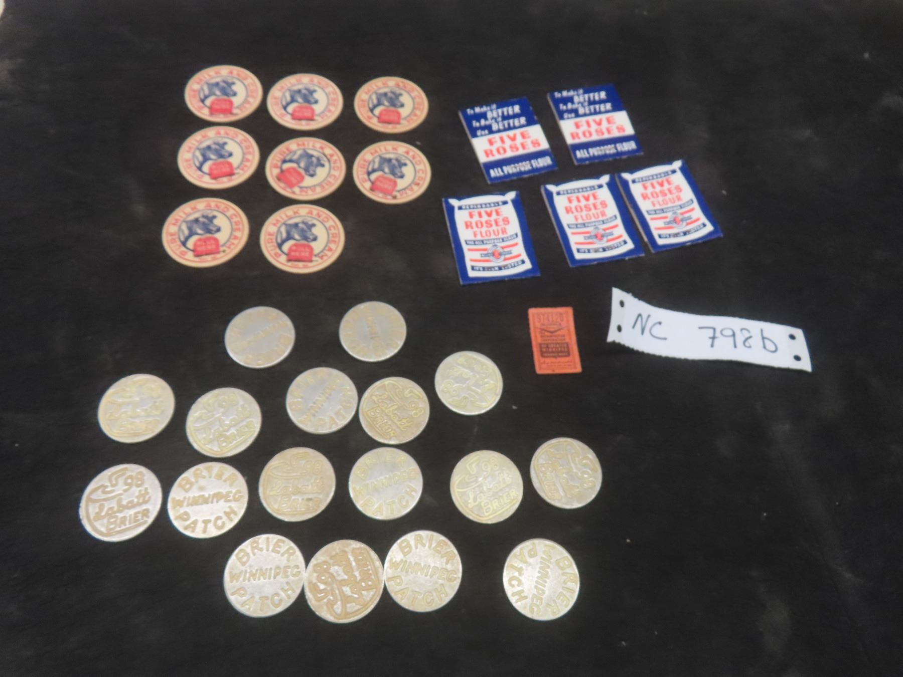 5 Packages Five Roses Flour Filled with Needles, 8 Milk/Cream Lids and 17 Winnipeg Labatt Brier Patch 98 Tokens