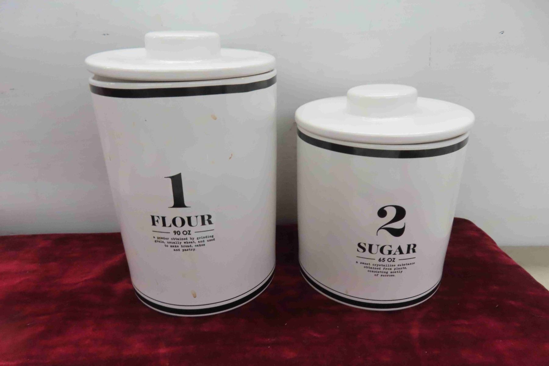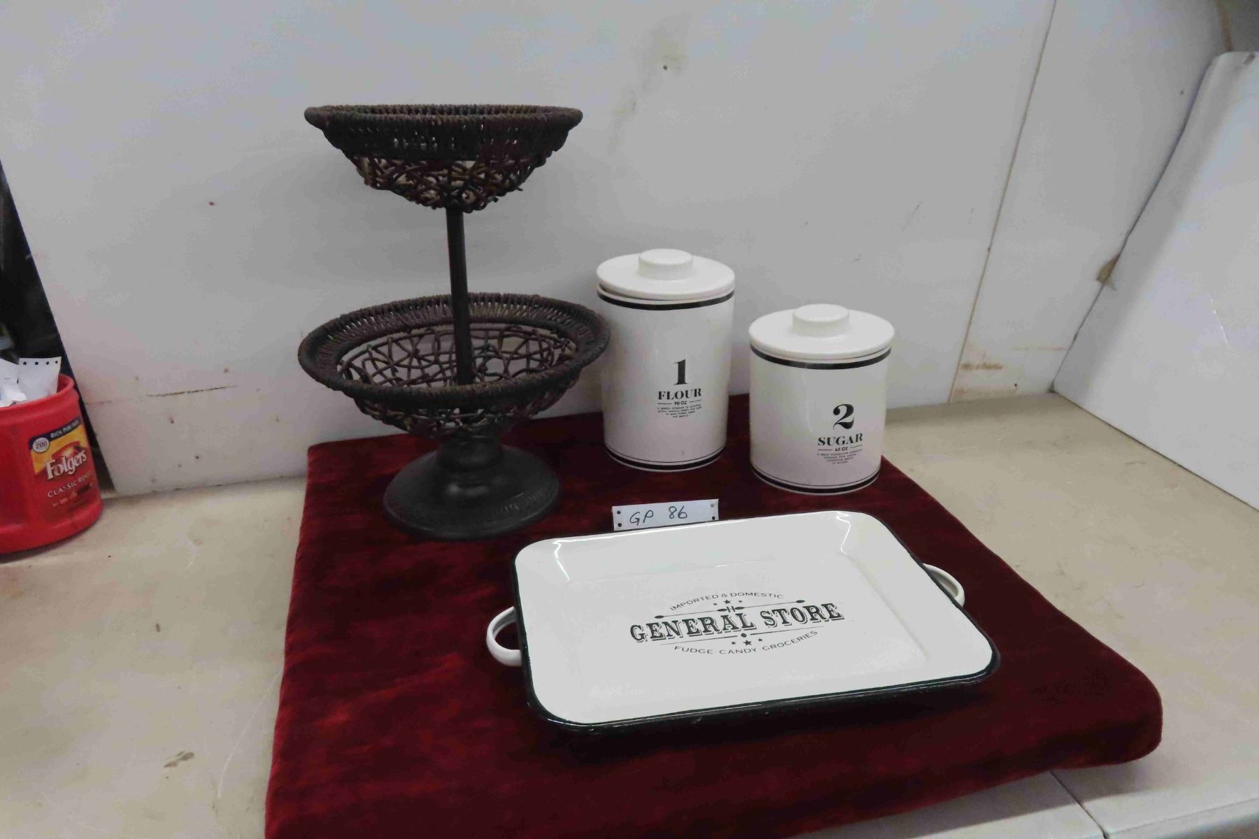 5 Pc. Farmhouse Style Kitchen Décor Wrought Iron Fruit Stand, 2 Pc. Ceramic Cannister and Tray