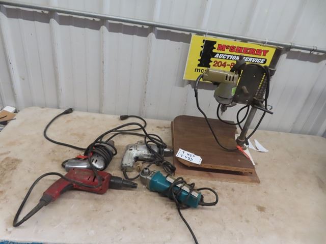 5 Power Tools; 3 Drills - 1 Press, Miwaukee Dry Wall Gun, Makita Angle Drill