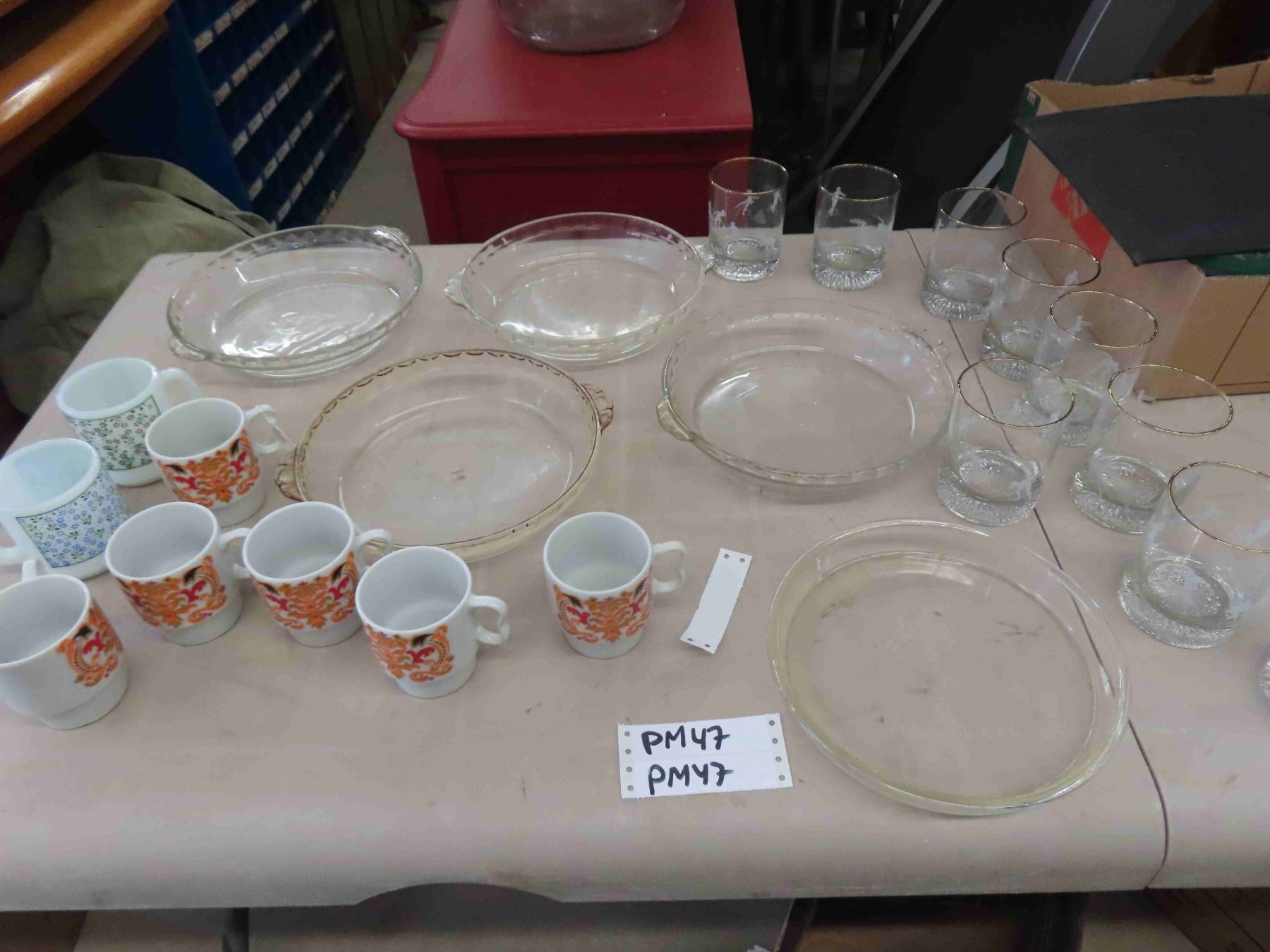 5 Pyrex Pie Plates, Assorted Coffee Cups, 9 Heavy Base Glasses