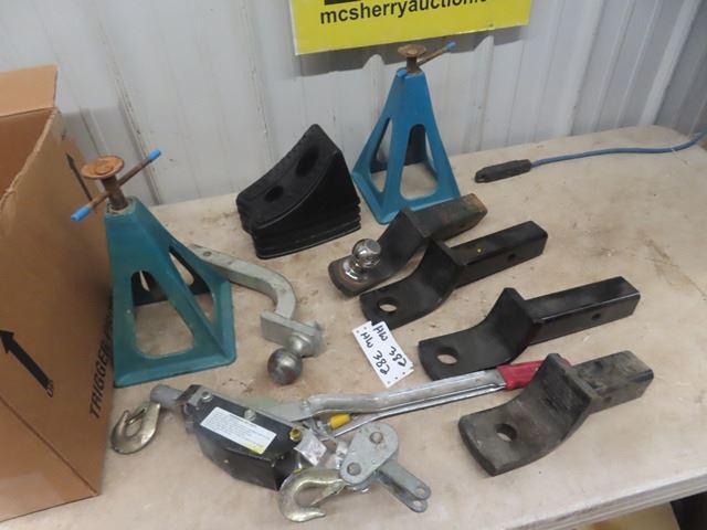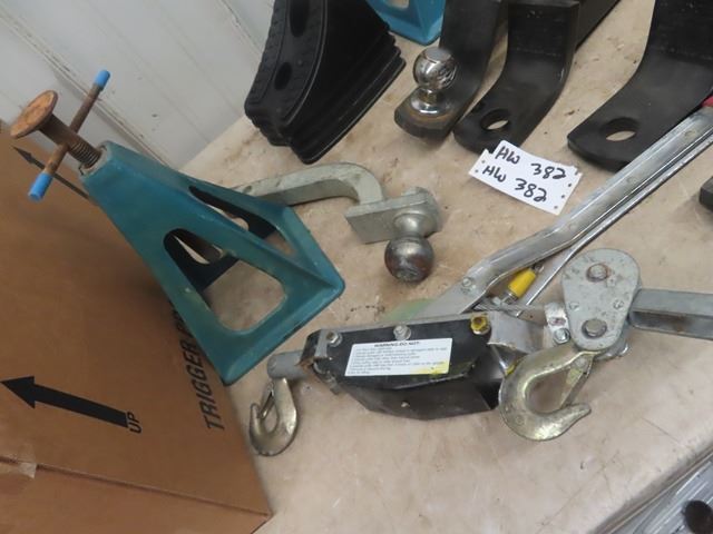 5 Receiver Hitches, half with Balls - Some New, 2 Stabilizing Jacks, Come-Along