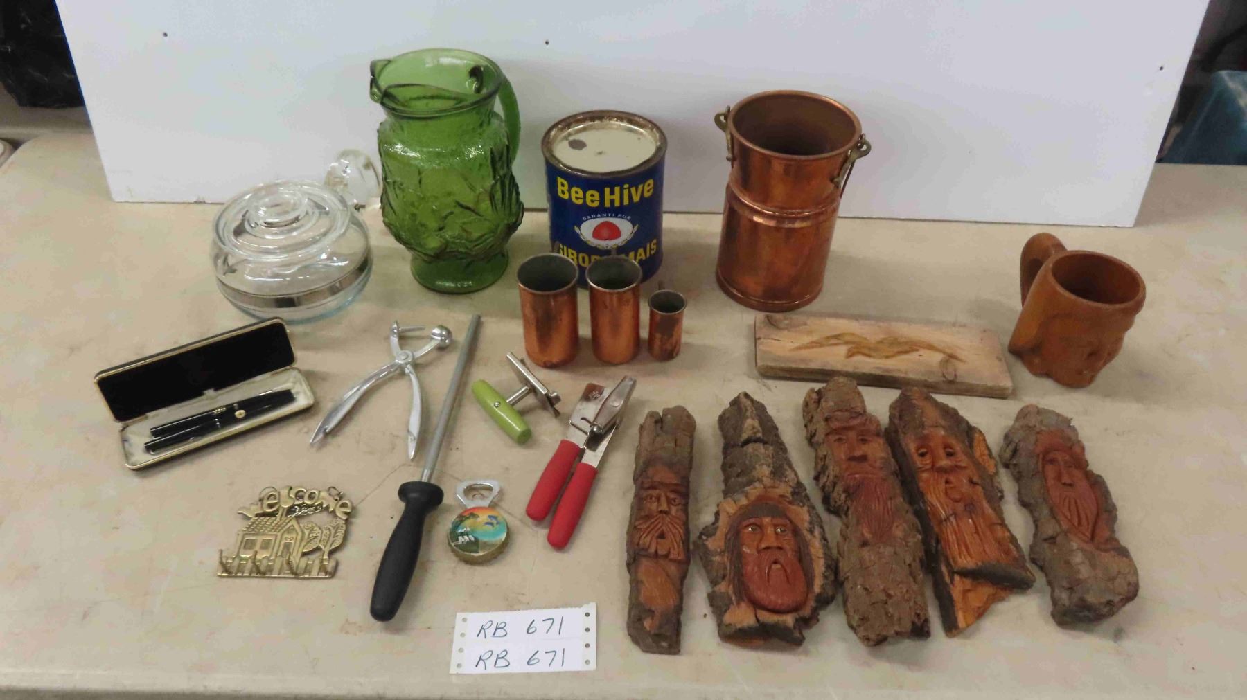 5 Signed Tree Carvings , Mug, Copper Ware, Pitcher, Coffee Carafe, plus more
