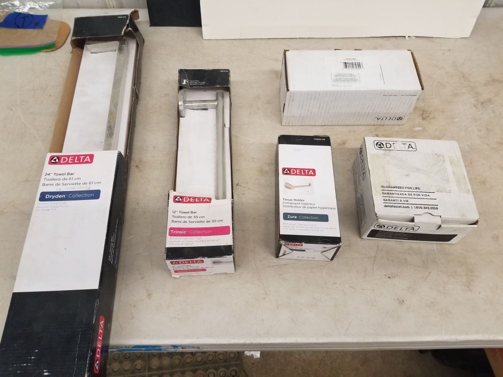 5 Various Delta Bathroom Fixtures : Towel Bars, Tissue Holder, Tub Spout, Trim