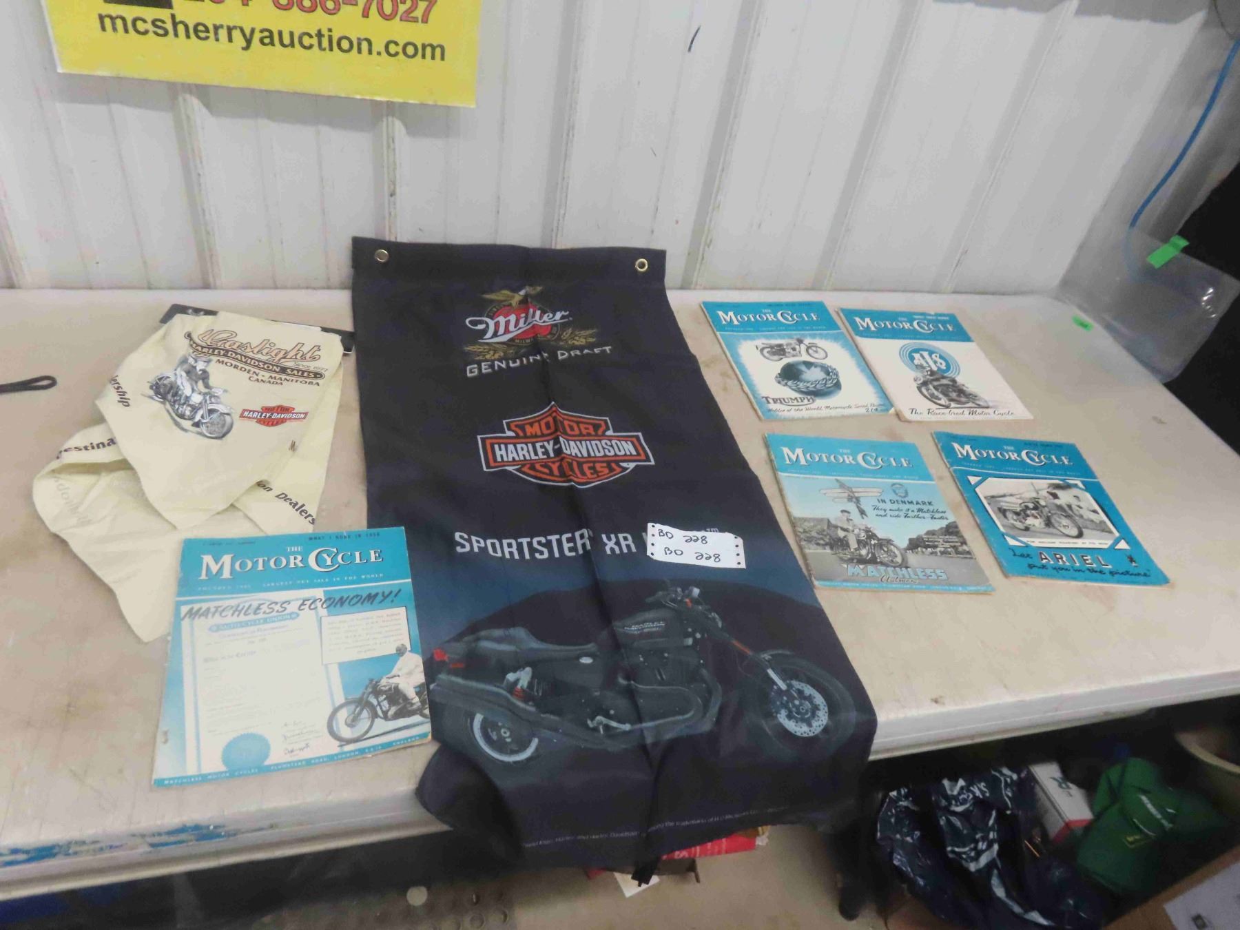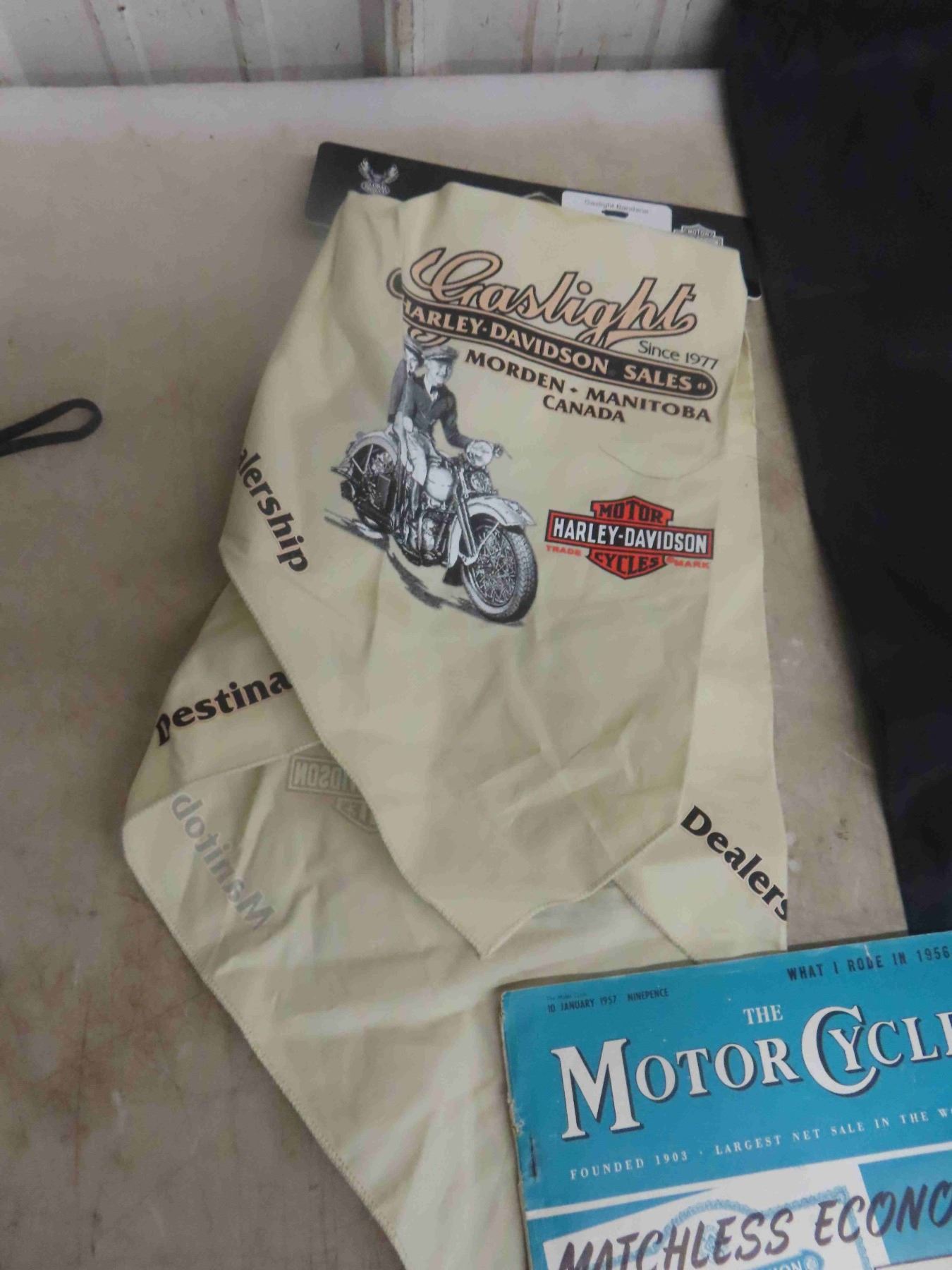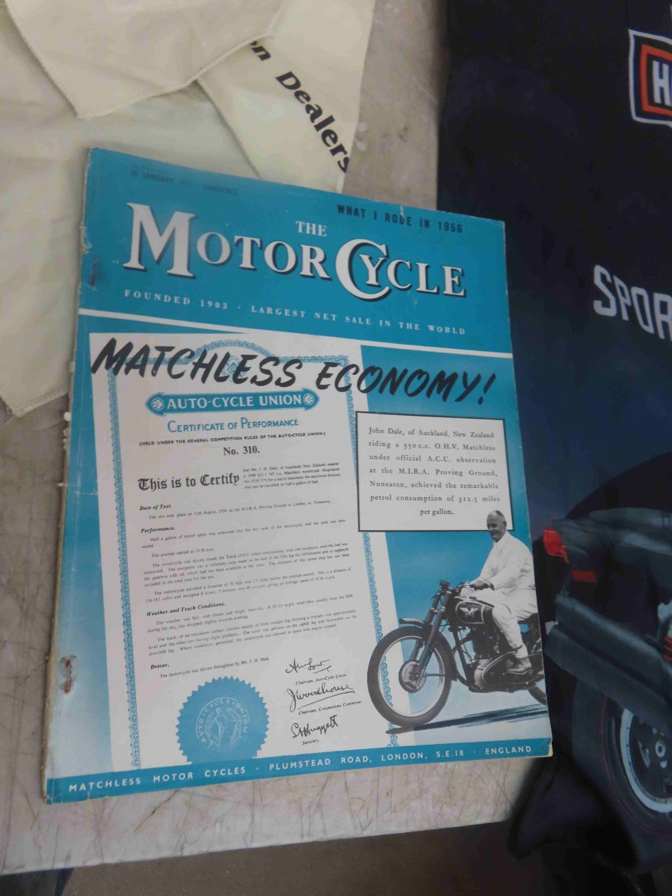 5 Vintage 1950s 'The Motorcycle' Magazines and Harley Davidson Banner.