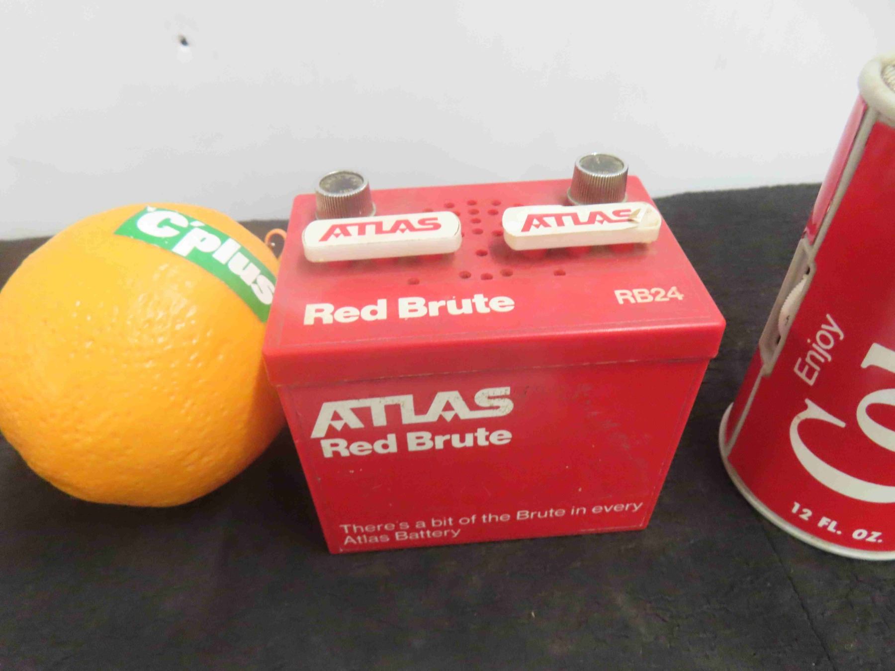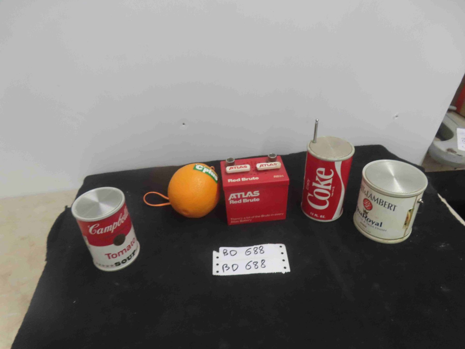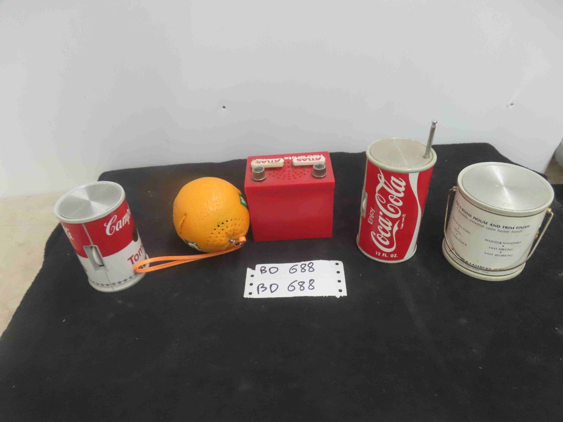 5 Vintage Advertising Transistor Radios ; Coke, Atlas, Batteries, Campbells Soup,
