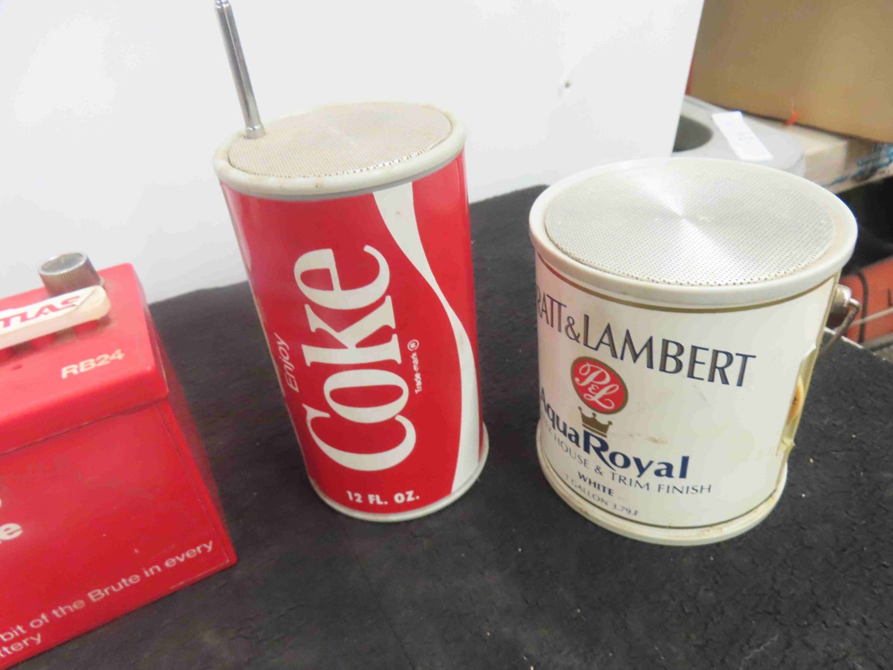 5 Vintage Advertising Transistor Radios ; Coke, Atlas, Batteries, Campbells Soup, Pratt + Lambert Paint, C Plus