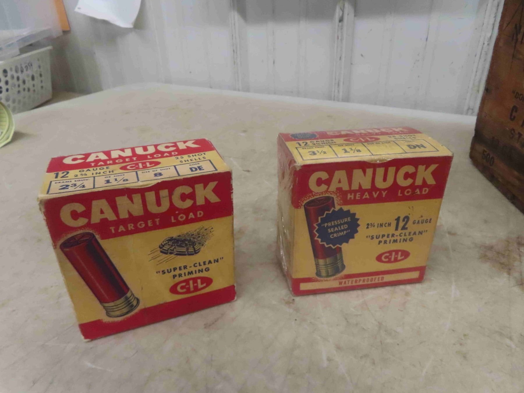 (5) Vintage Canuck Shotshell Boxes 10 , 12 & 16 Gauge , Wood Canuck Ammo Box 14'' x 9'' x 9.5''