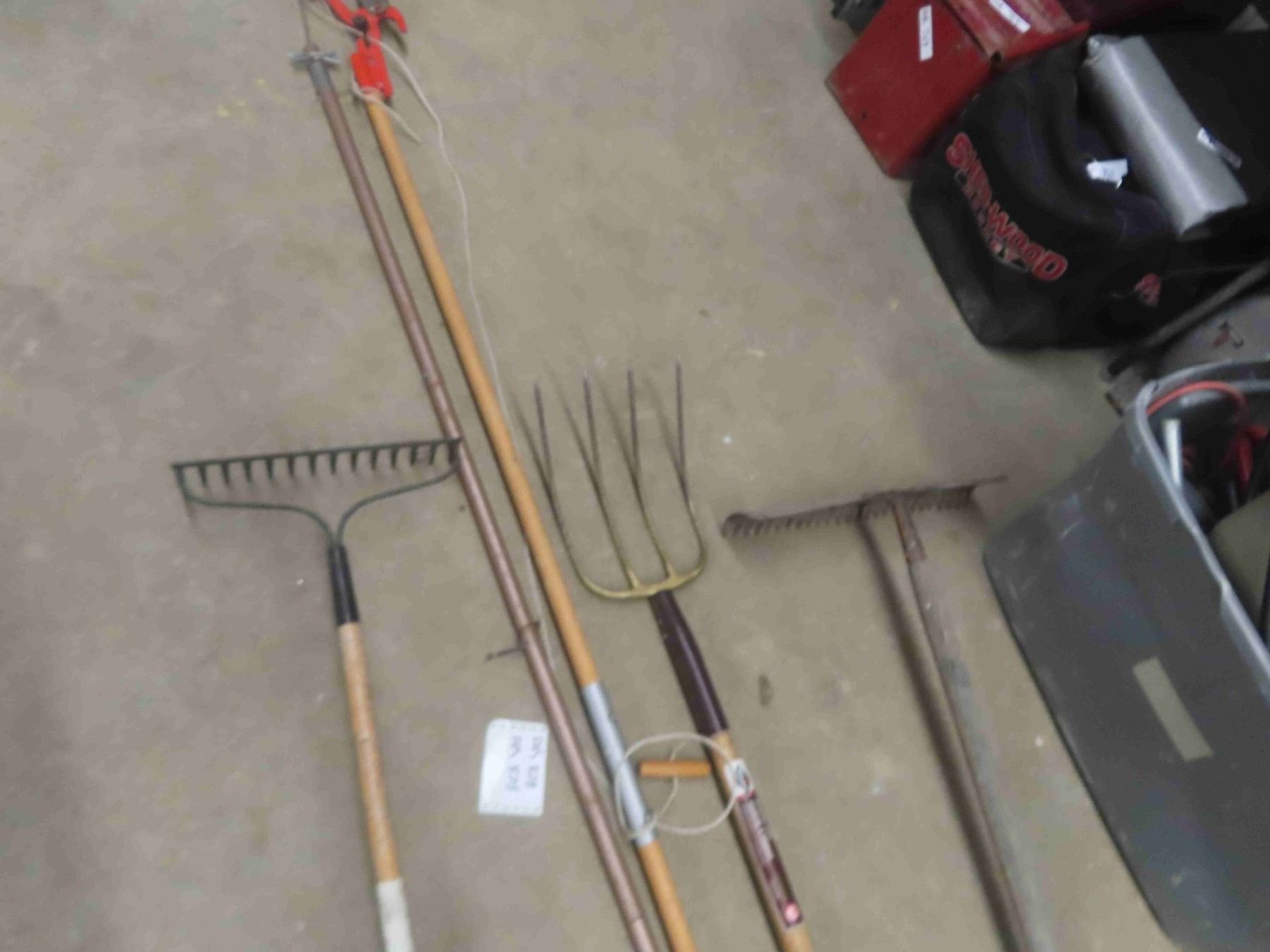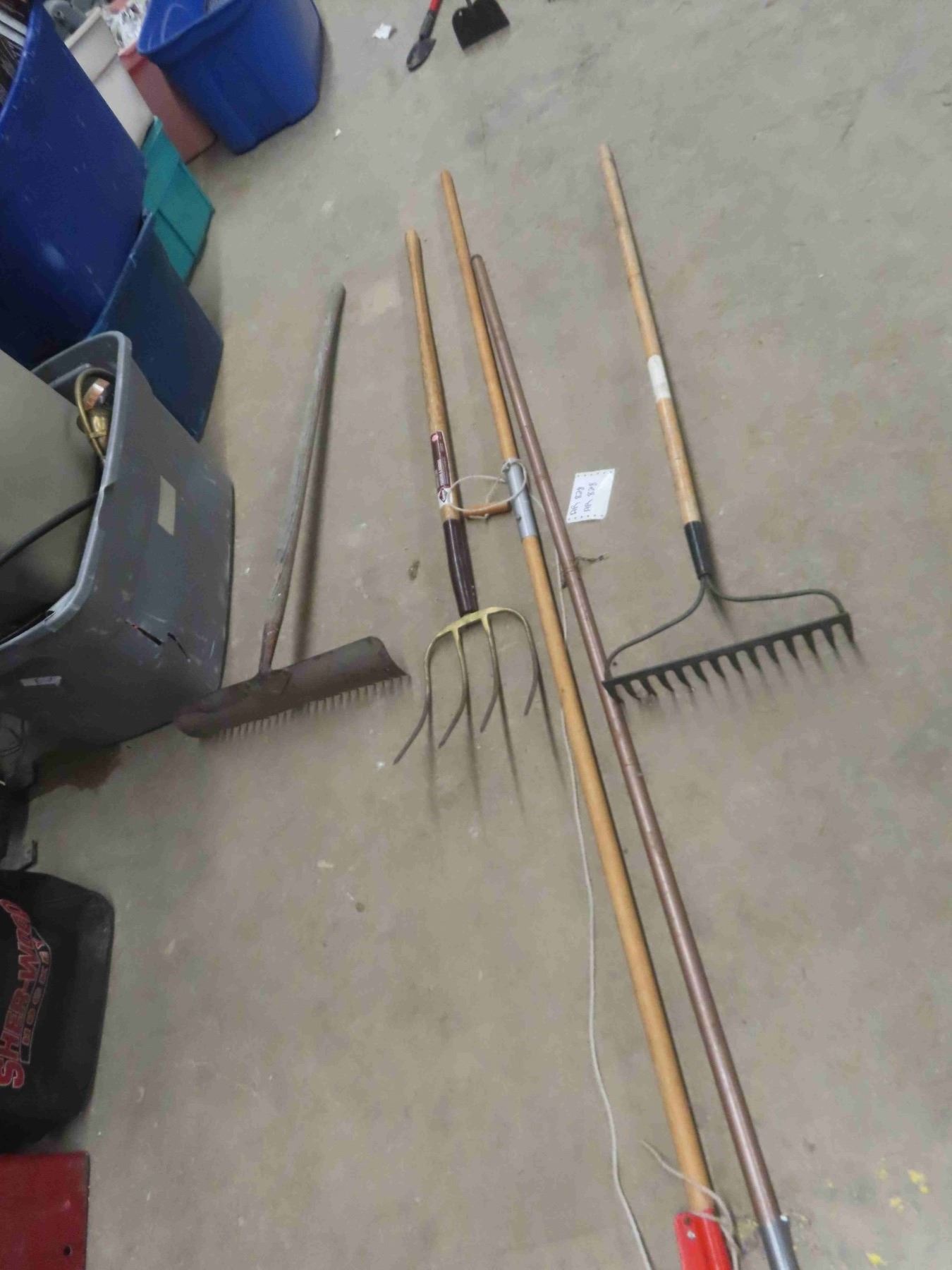 5 Yard Tools ; Fork, 2 Rakes, Tree Branch Cutter, Hook