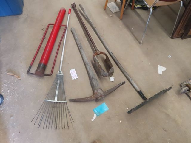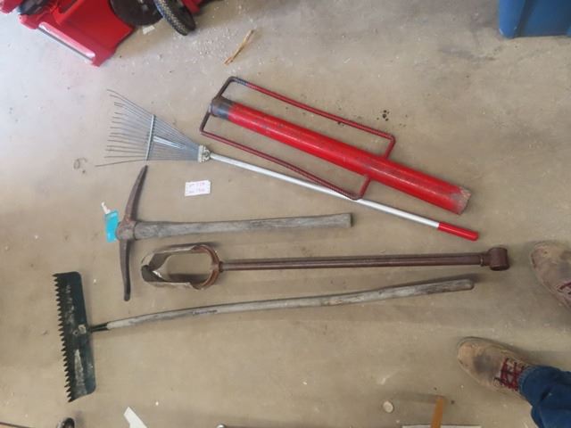 5 Yard Tools ; Post Pounder, 2 Rakes, Pick, Post Hole Digger
