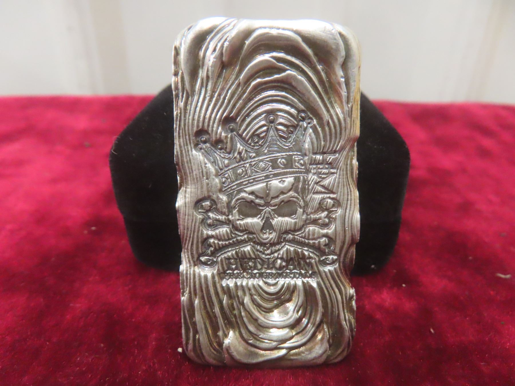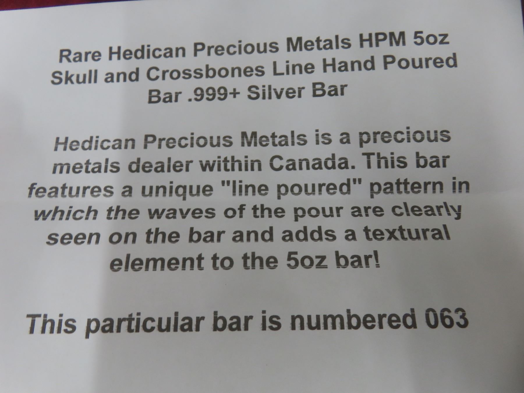 5 oz .999+ Silver Bar by Hedican Precious Metals, Skull & Crossbones Line, Hand Poured, #63