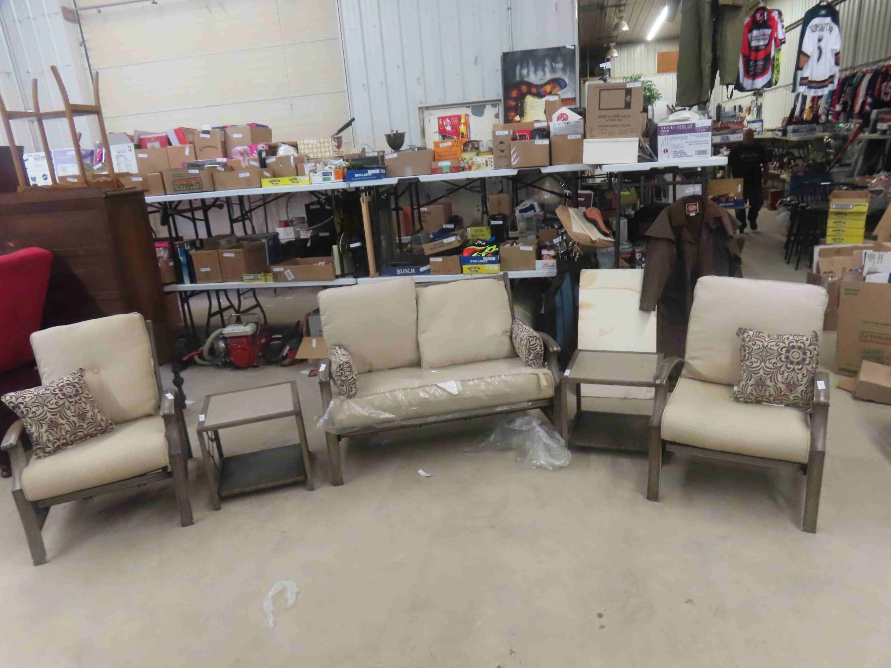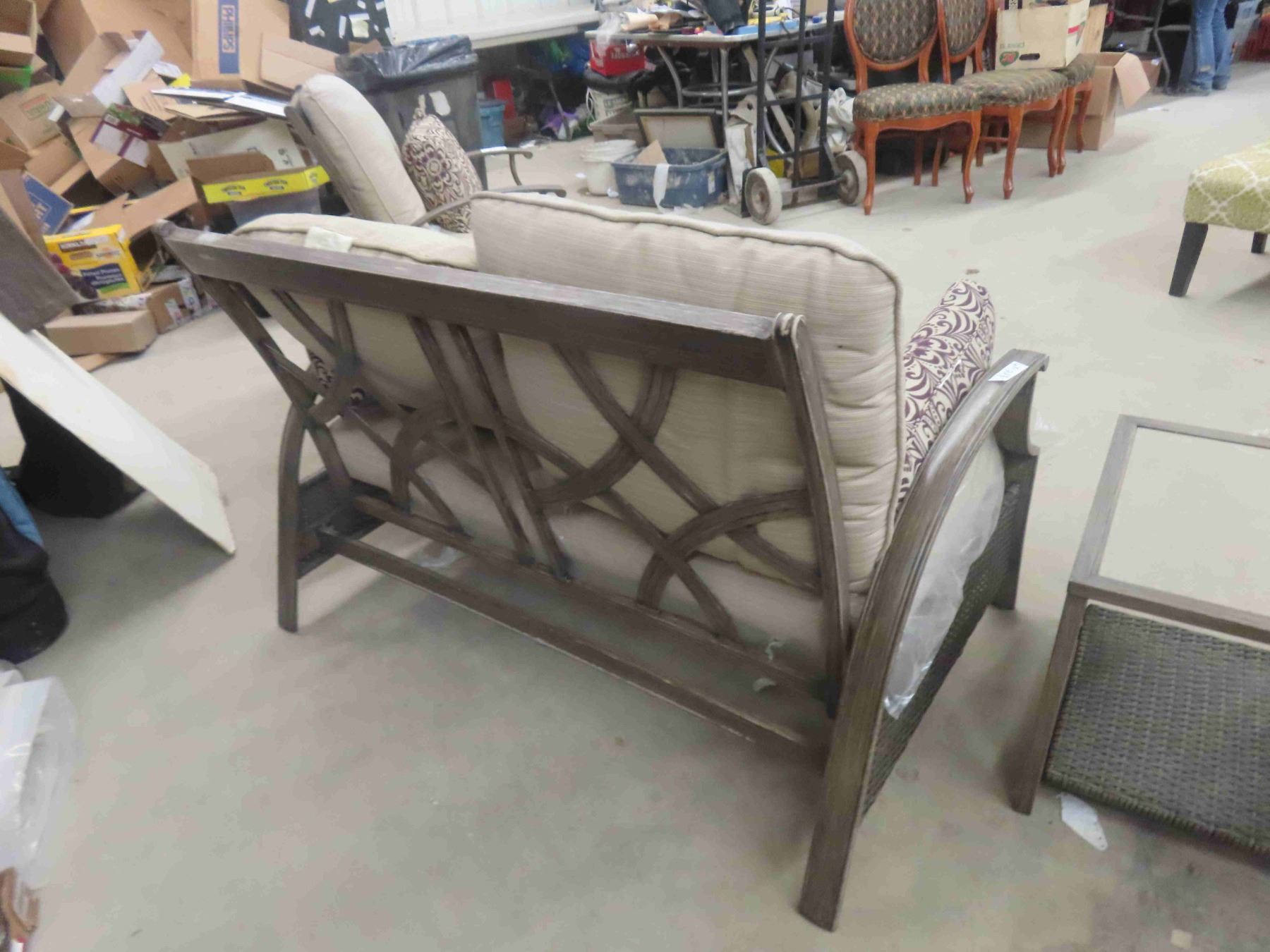 5 pc Patio Set ; Settee 52" wide, 2 Chairs, 2 Stands ; 18" x 20" x 20" & Umbrella