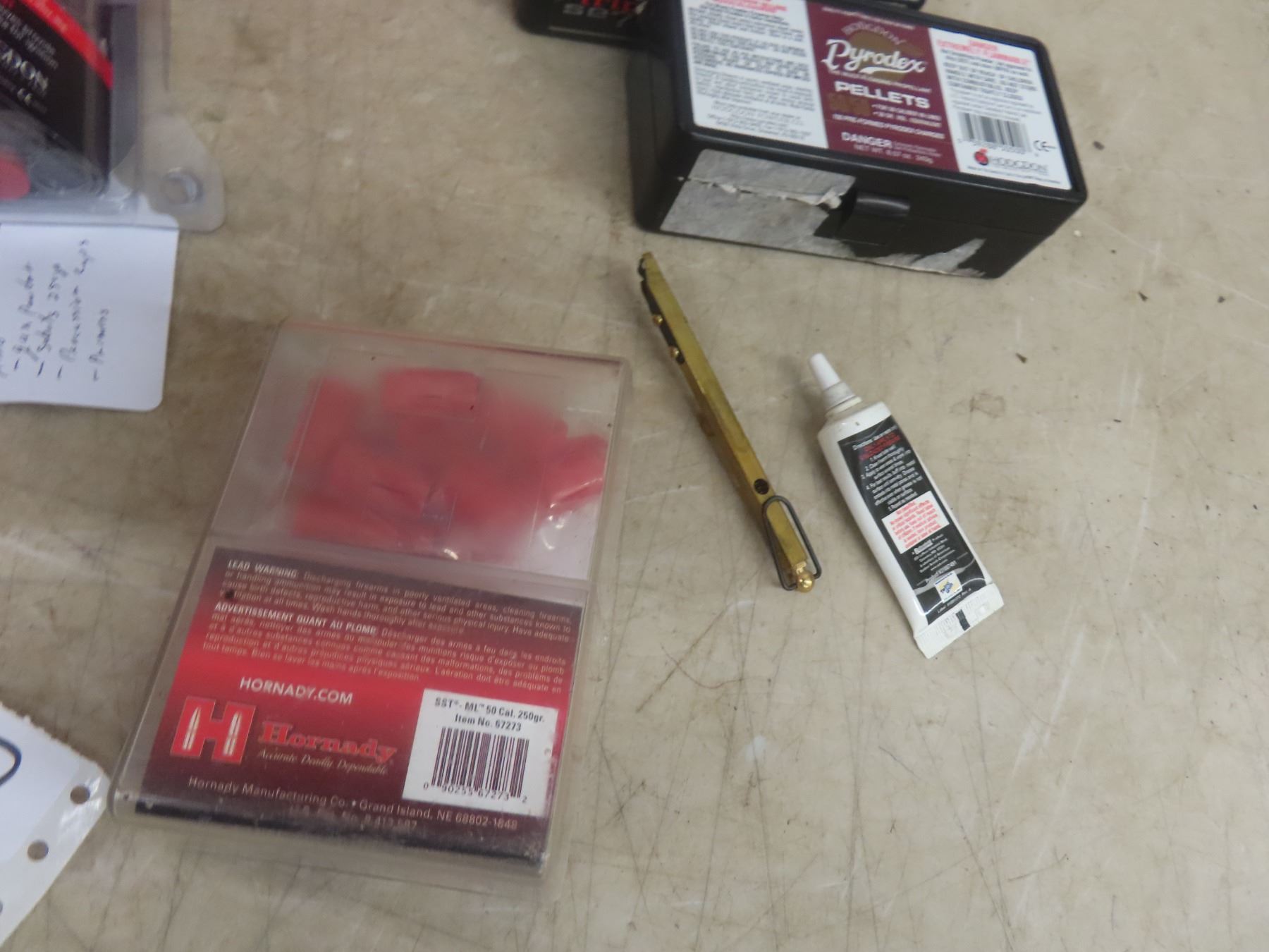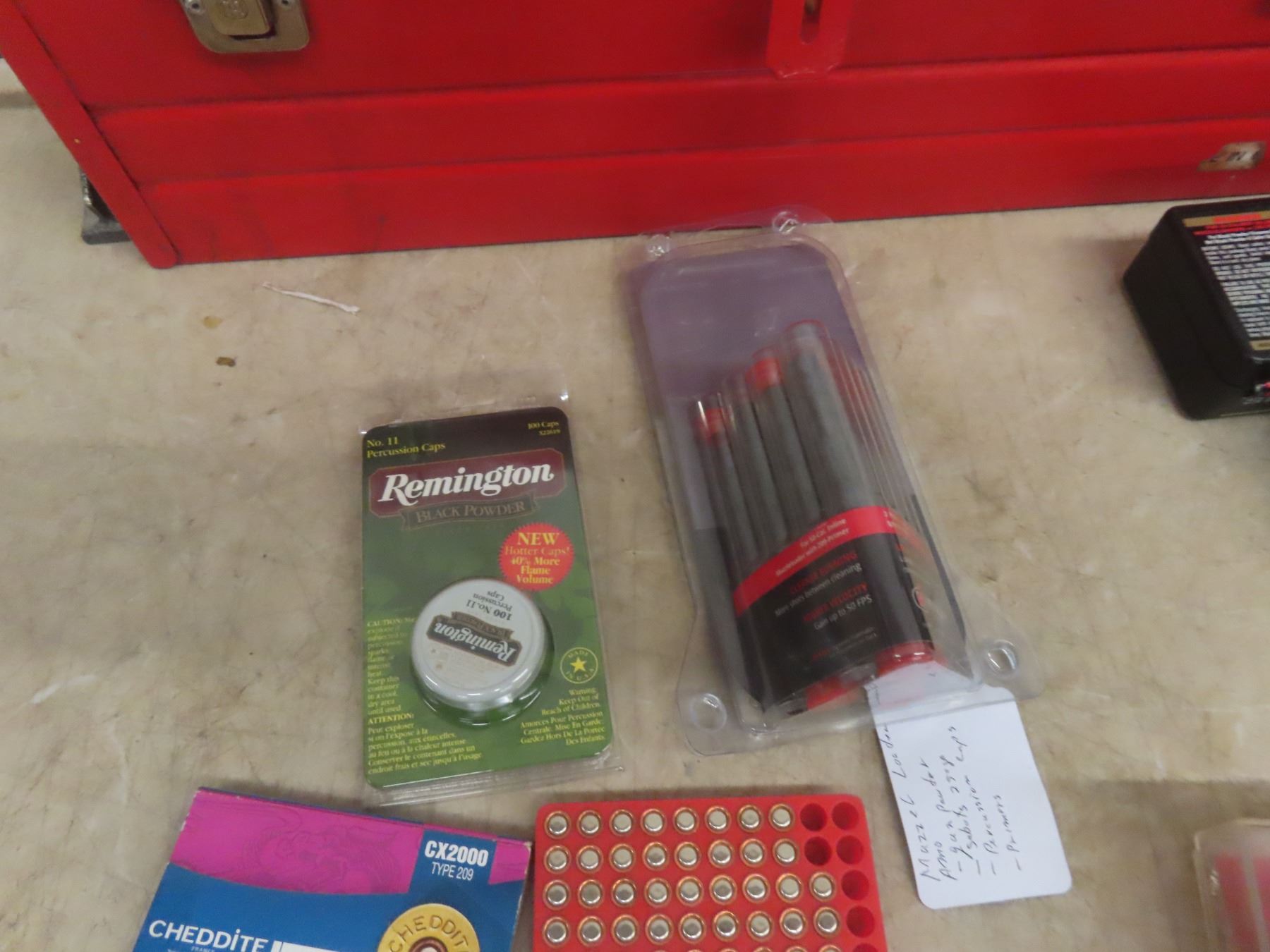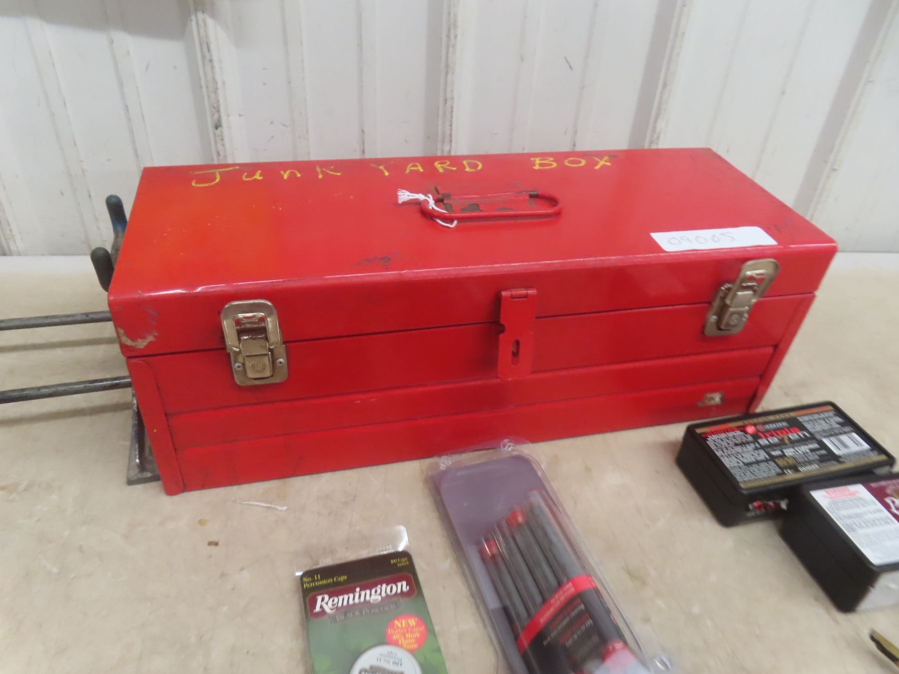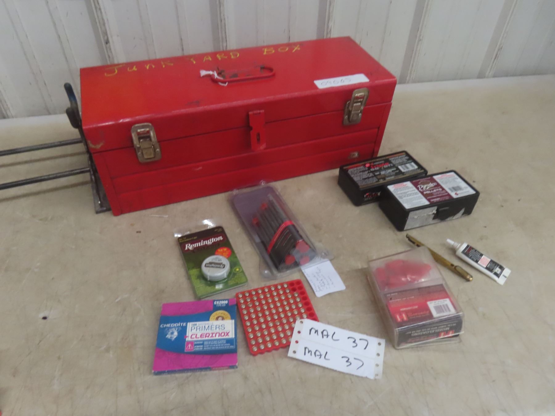 50 Cal Bullet, Powder, Primers + Other Reload Accessories with Metal Tool Box **MUST HAVE VALID PAL TO PURCHASE. WE WILL NOT SHIP AMMO. IF YOU PURCHASE AMMO (&NEED SHIPPING), YOU WILL BE RESPONSIBLE TO PAY FOR IT AND RESELL IT UNDER YOUR OWN CONSIGNMENT IN THE NEXT GUN SALE. THANK YOU.