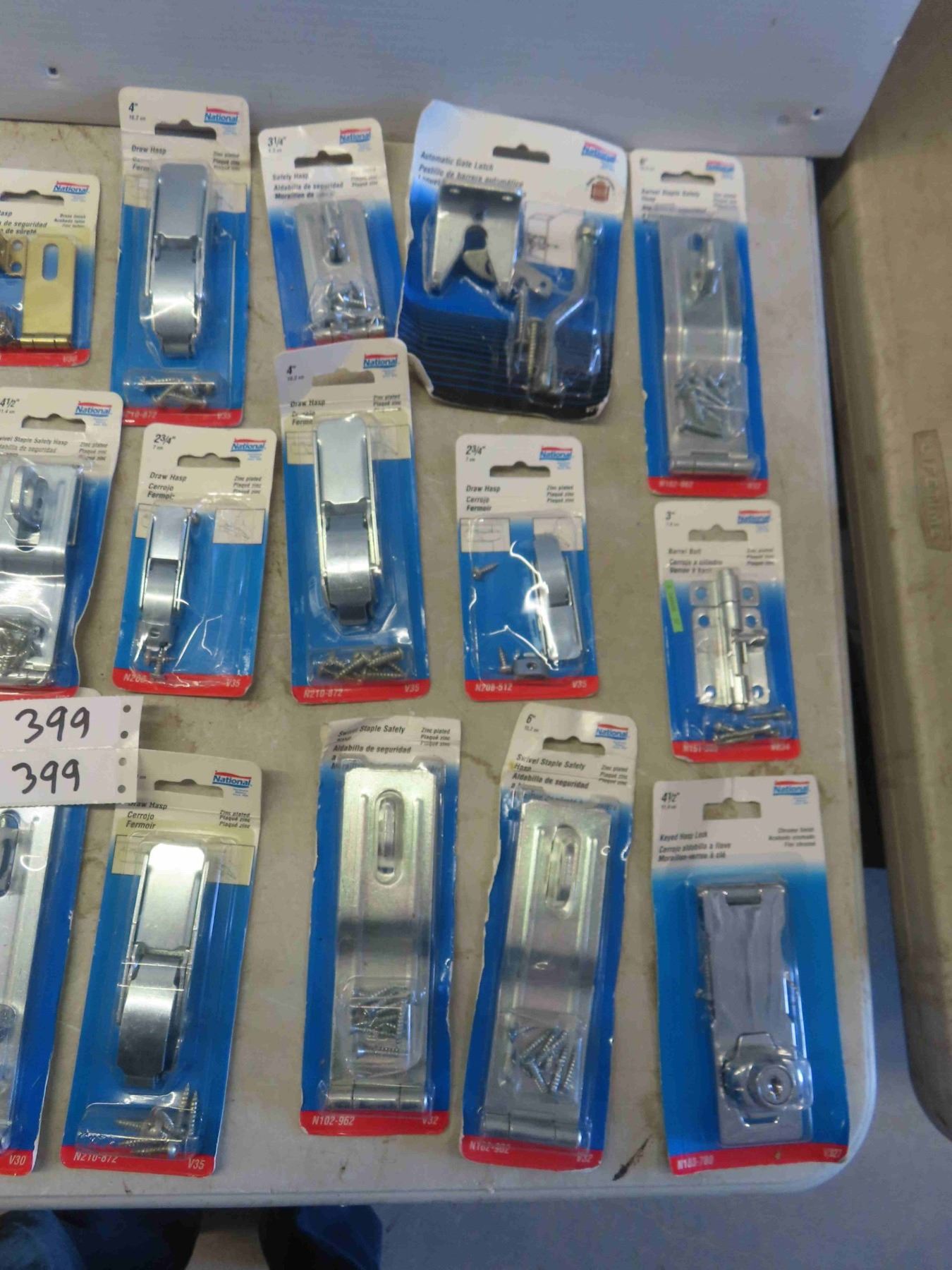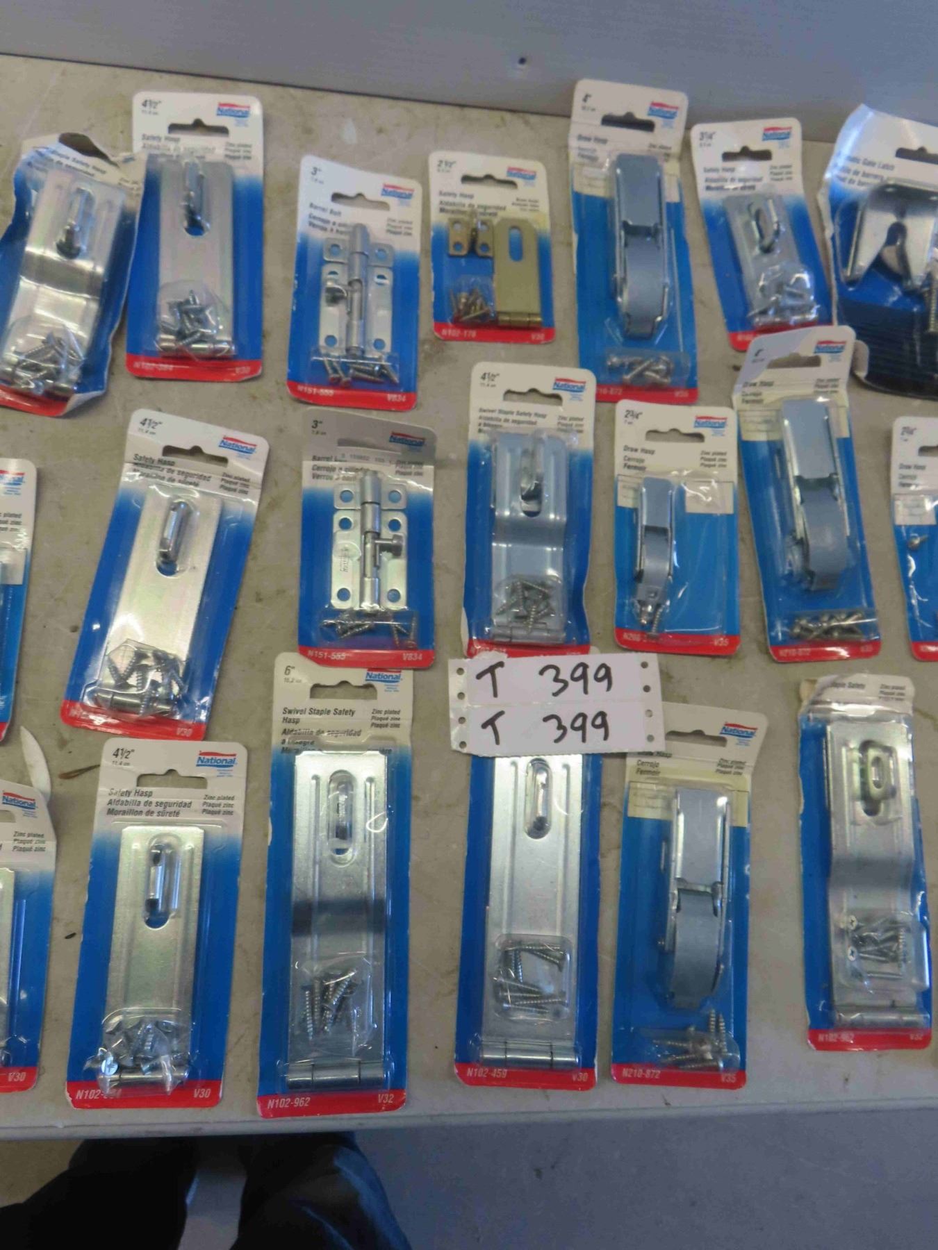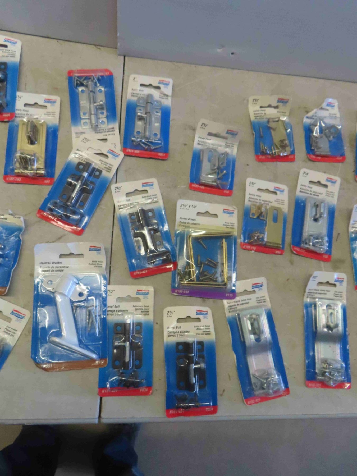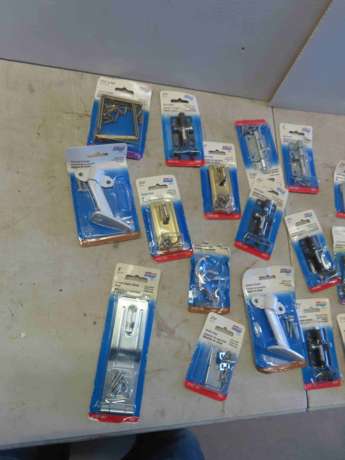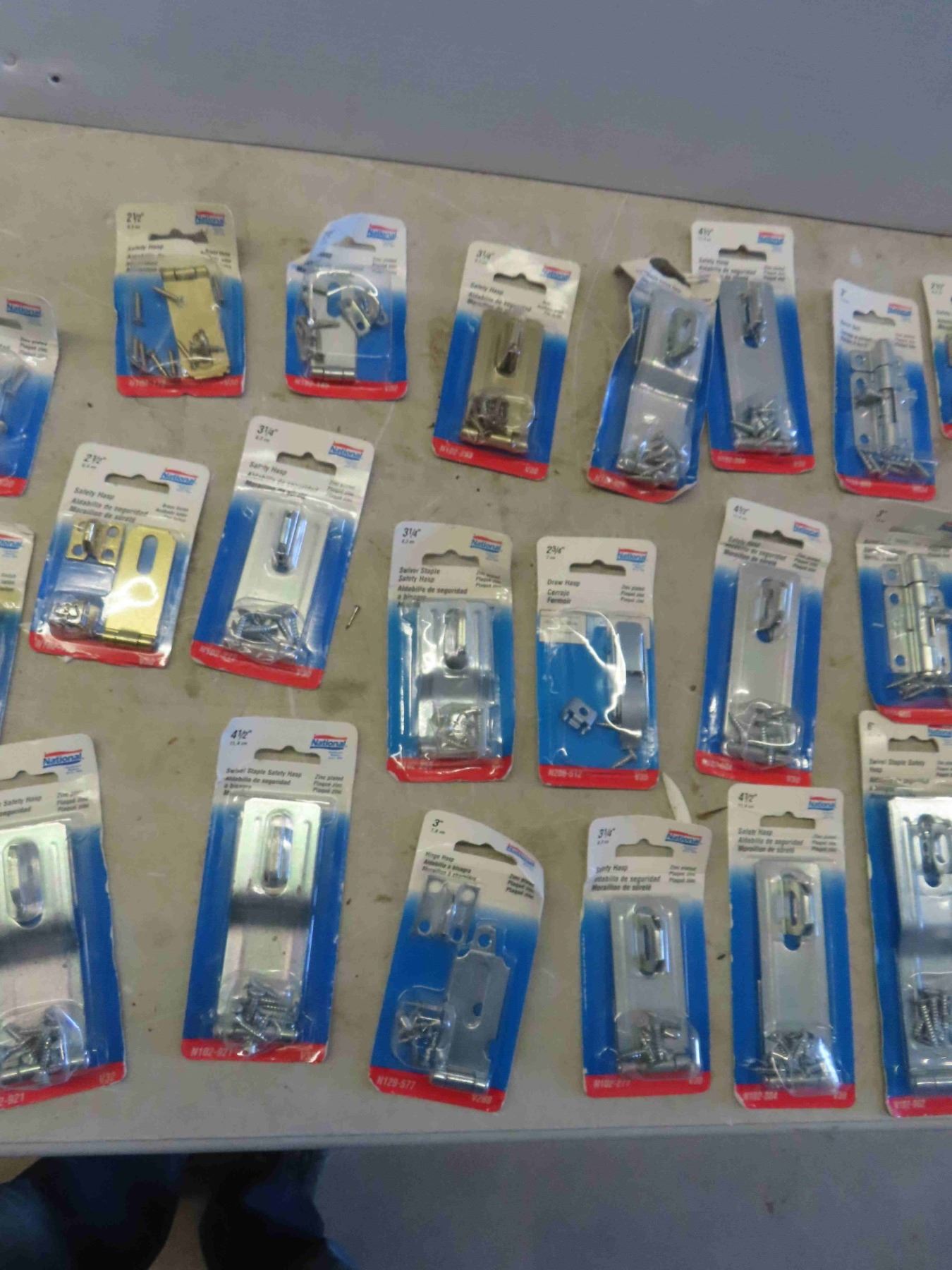 50 New Packs of Hardware: Gate Latch, Barrel Bolt, Corner Brackets, Safety Hasp Lock, Draw Hasp, Plus