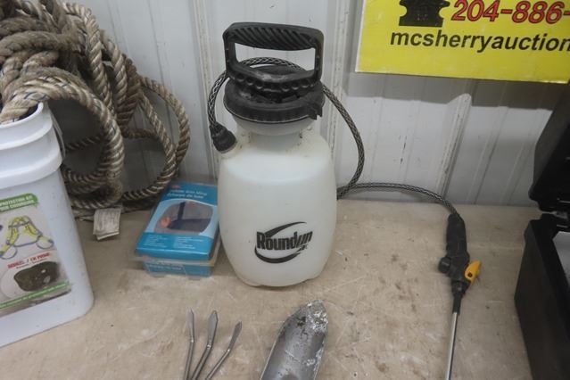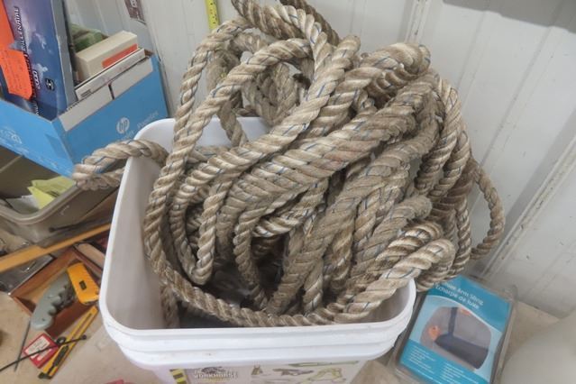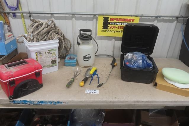 50' Rope with Snap Hook at one End, Simoniz 10" Orbital Polisher - new, Cooler with Radio, Sprayer, Garden Hand Tools