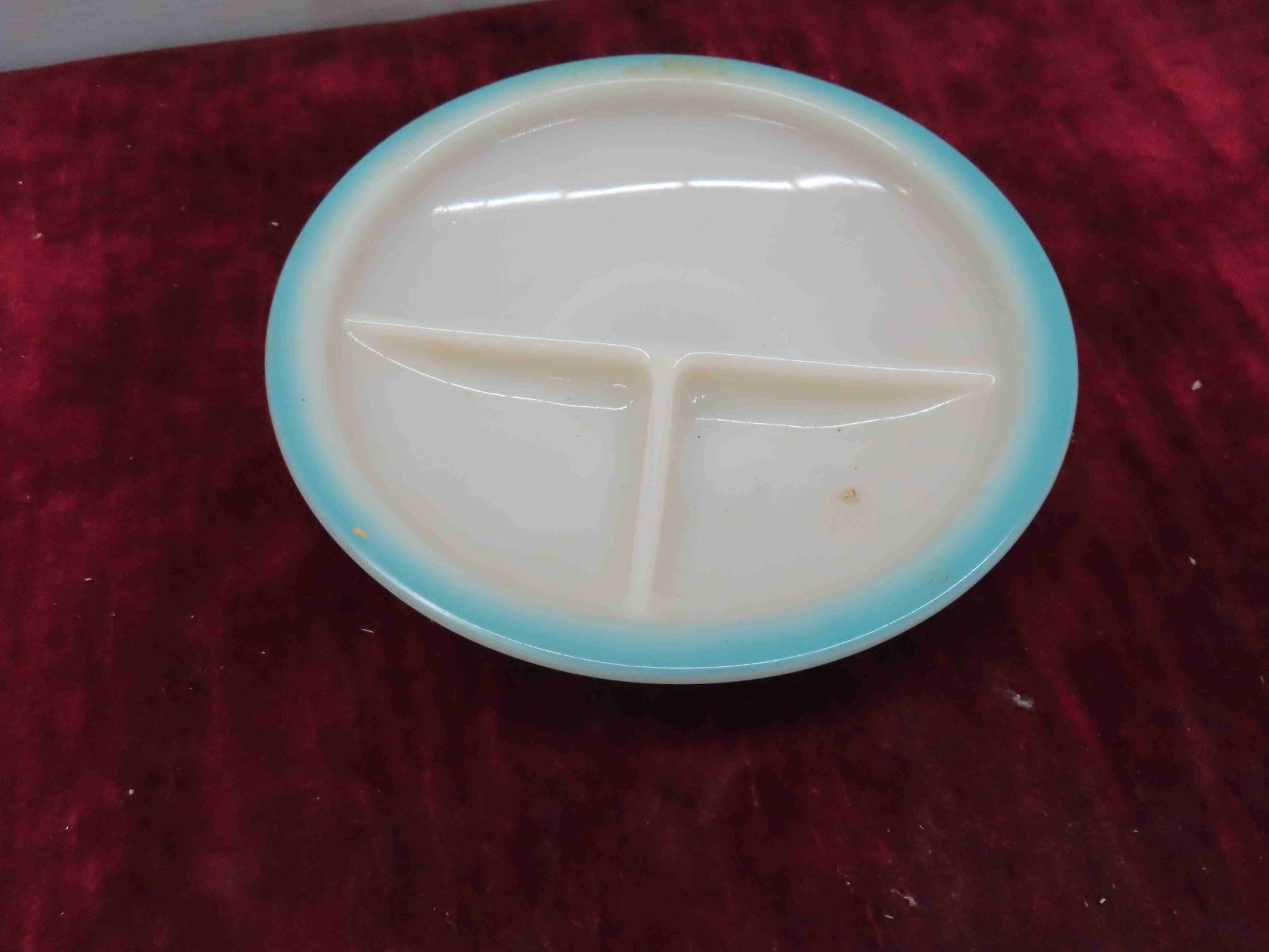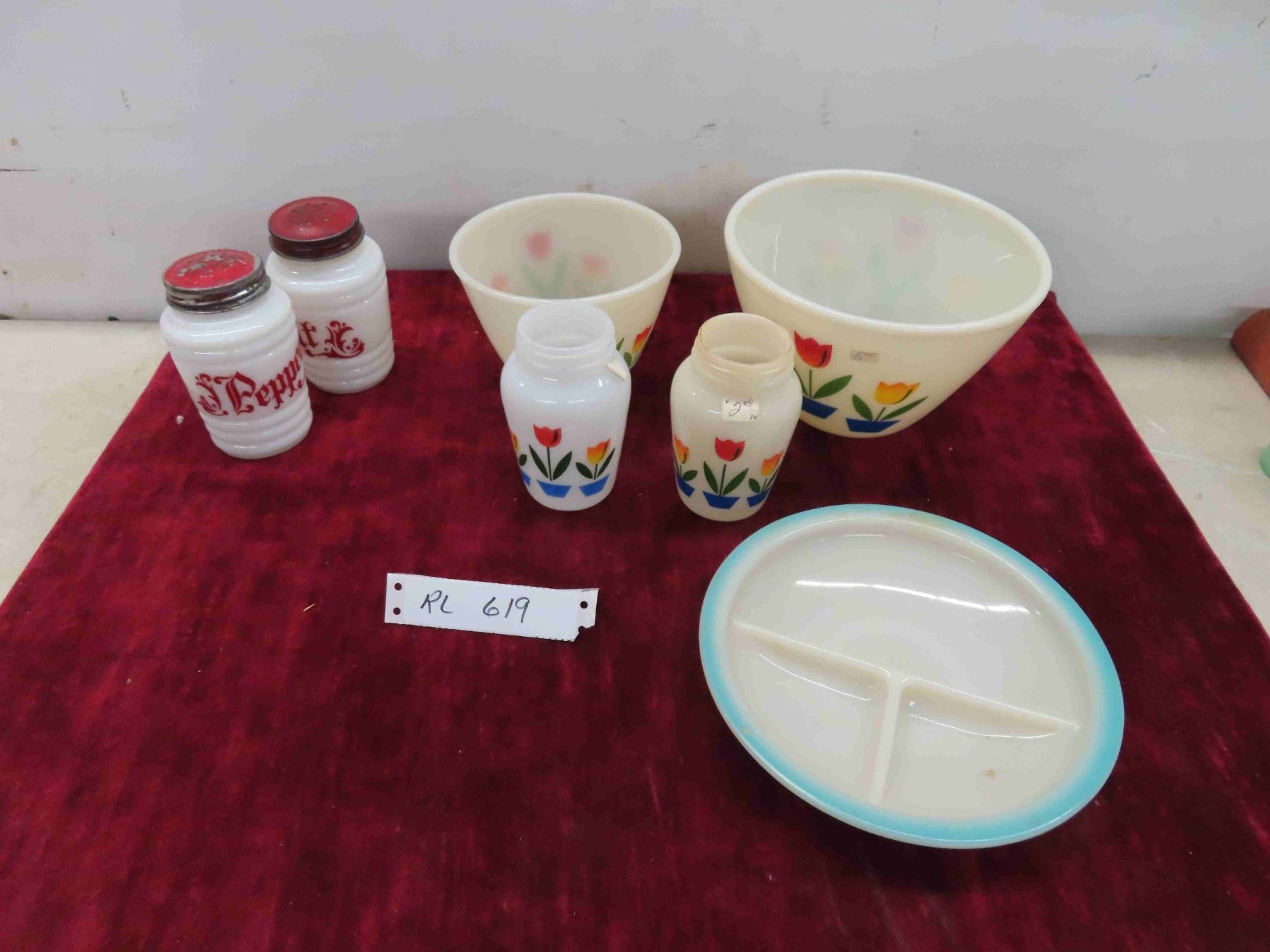 5pcs Fireking Mixing Bowls, Plate, 2 Shakers with No Lids, 2 Milk Glass Salt and Peppers