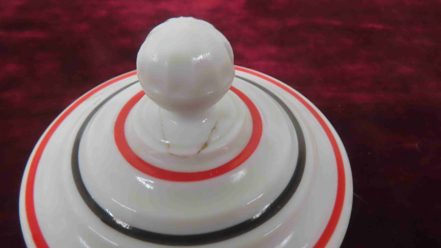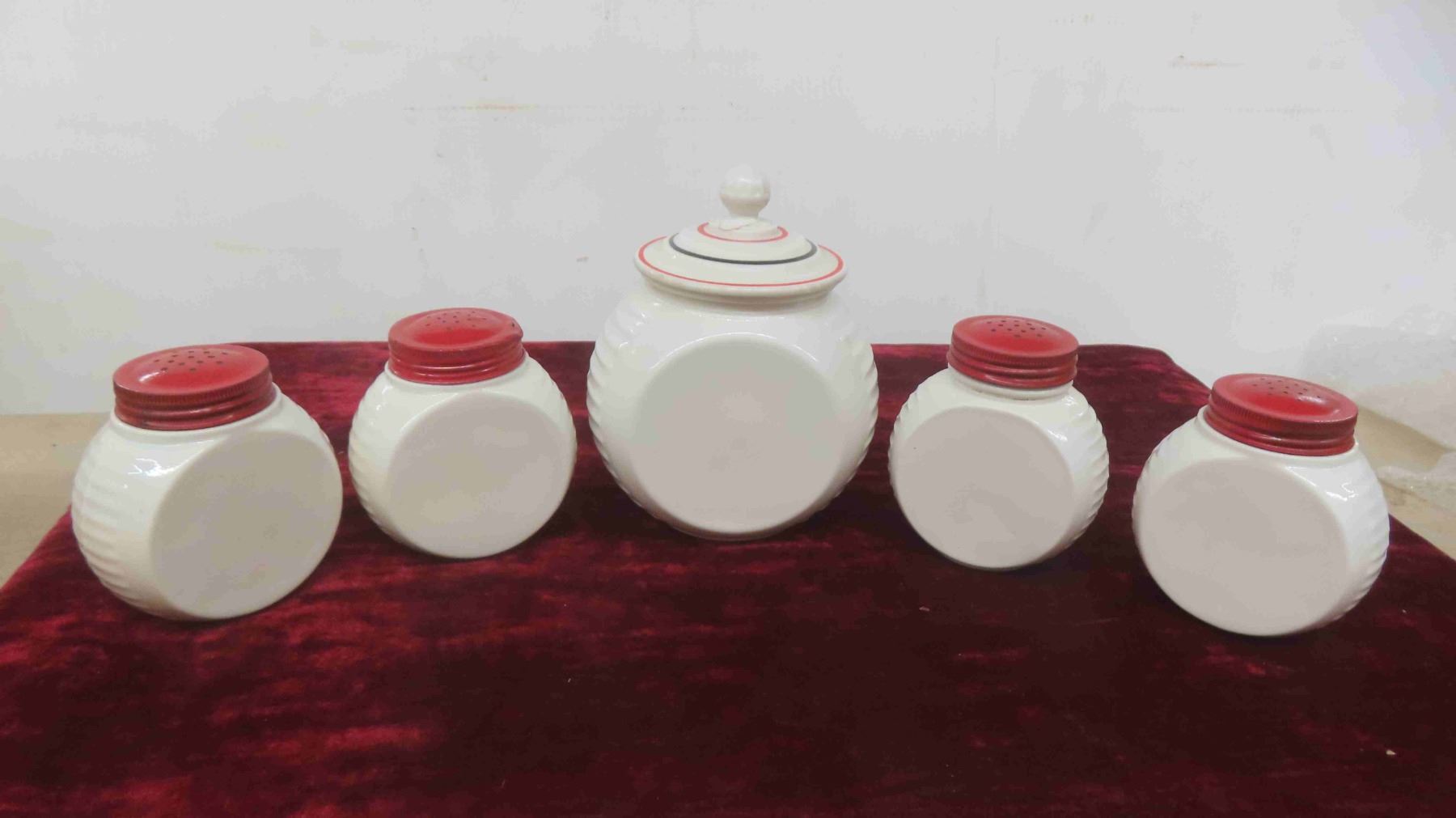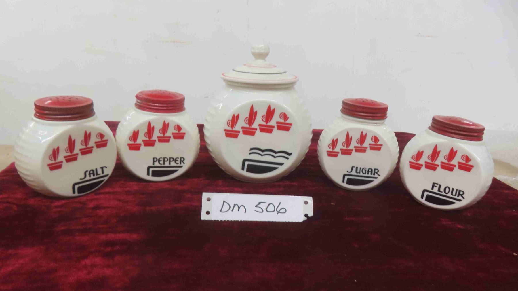 5pcs Milk Glass : Salt, Pepper, Flour, Sugar (Knob on Large Piece Has Been Repaired, Pictured)