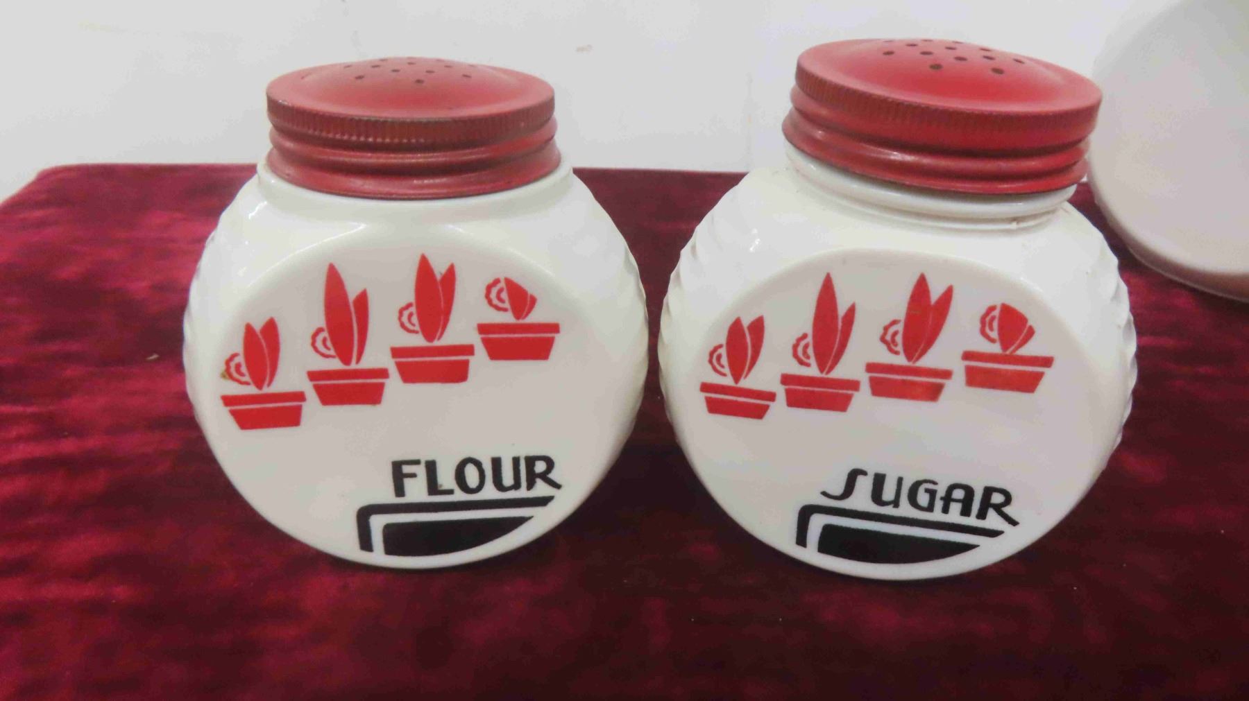 5pcs Milk Glass : Salt, Pepper, Flour, Sugar (Knob on Large Piece Has