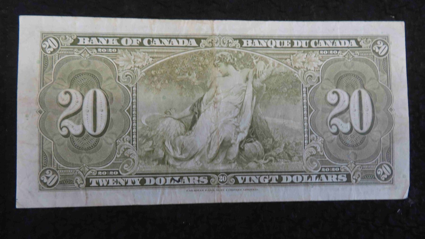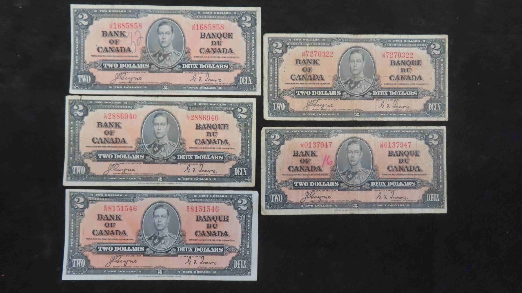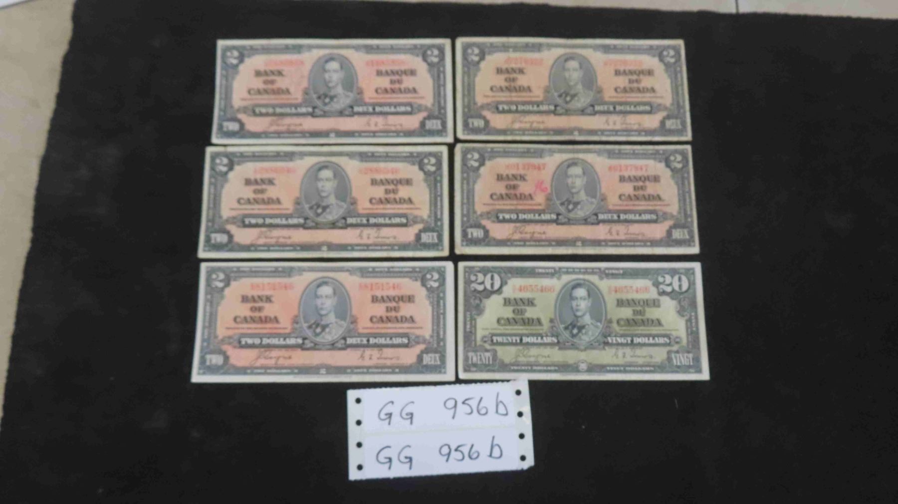 (6) 1937 Canadian Bills : (5) $2 Bills , (1) $20 Bill