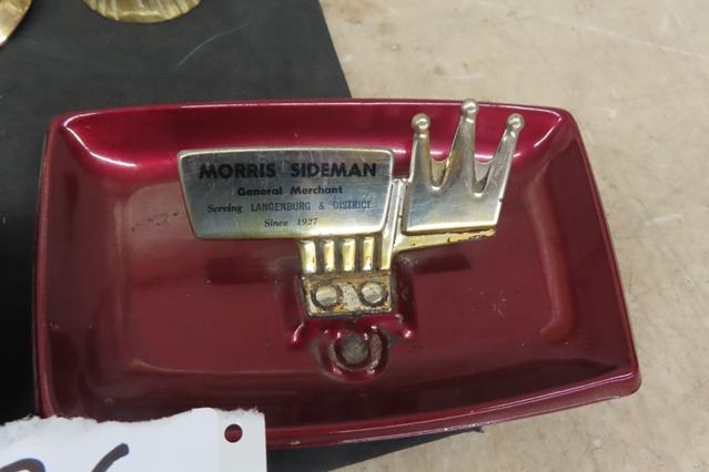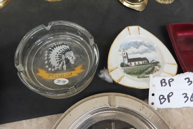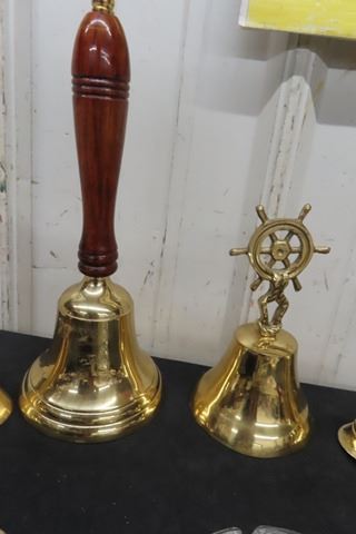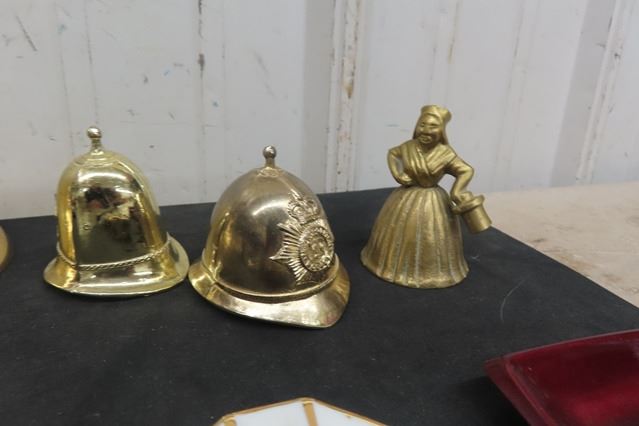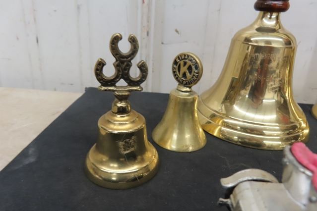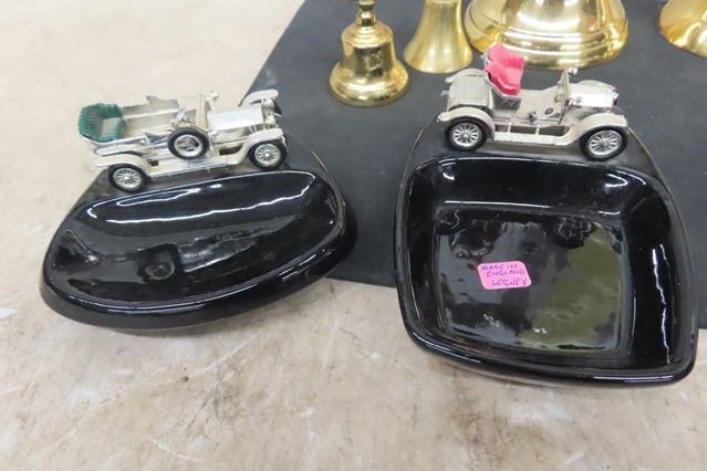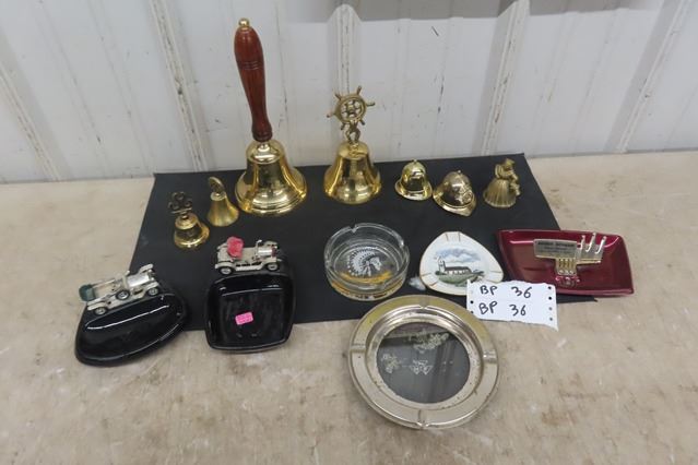 6 Ashtrays with Advertising ; Massey Fergusson, Made in England, Lesney, plus others & 7 Brass Bells