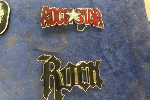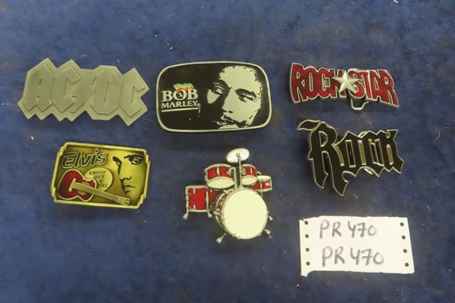 6 Belt Buckles: Rock n Roll- AC/ DC, Bob Marley, Elvis, Drums