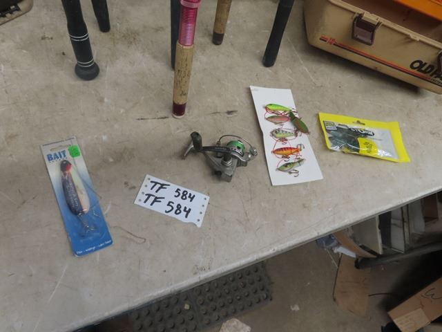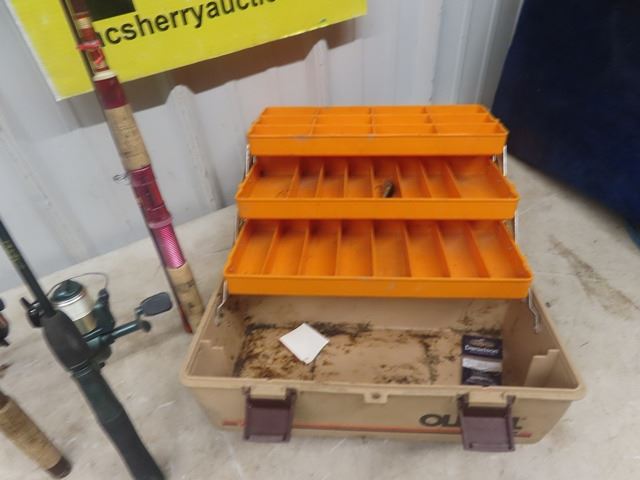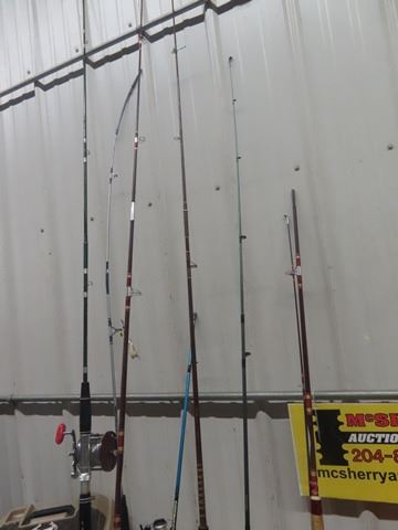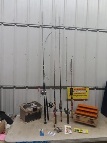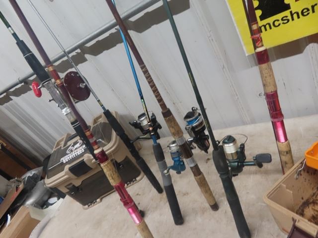 6 Fishing Rods, 5 Reels, 2 Tackle Boxes with some