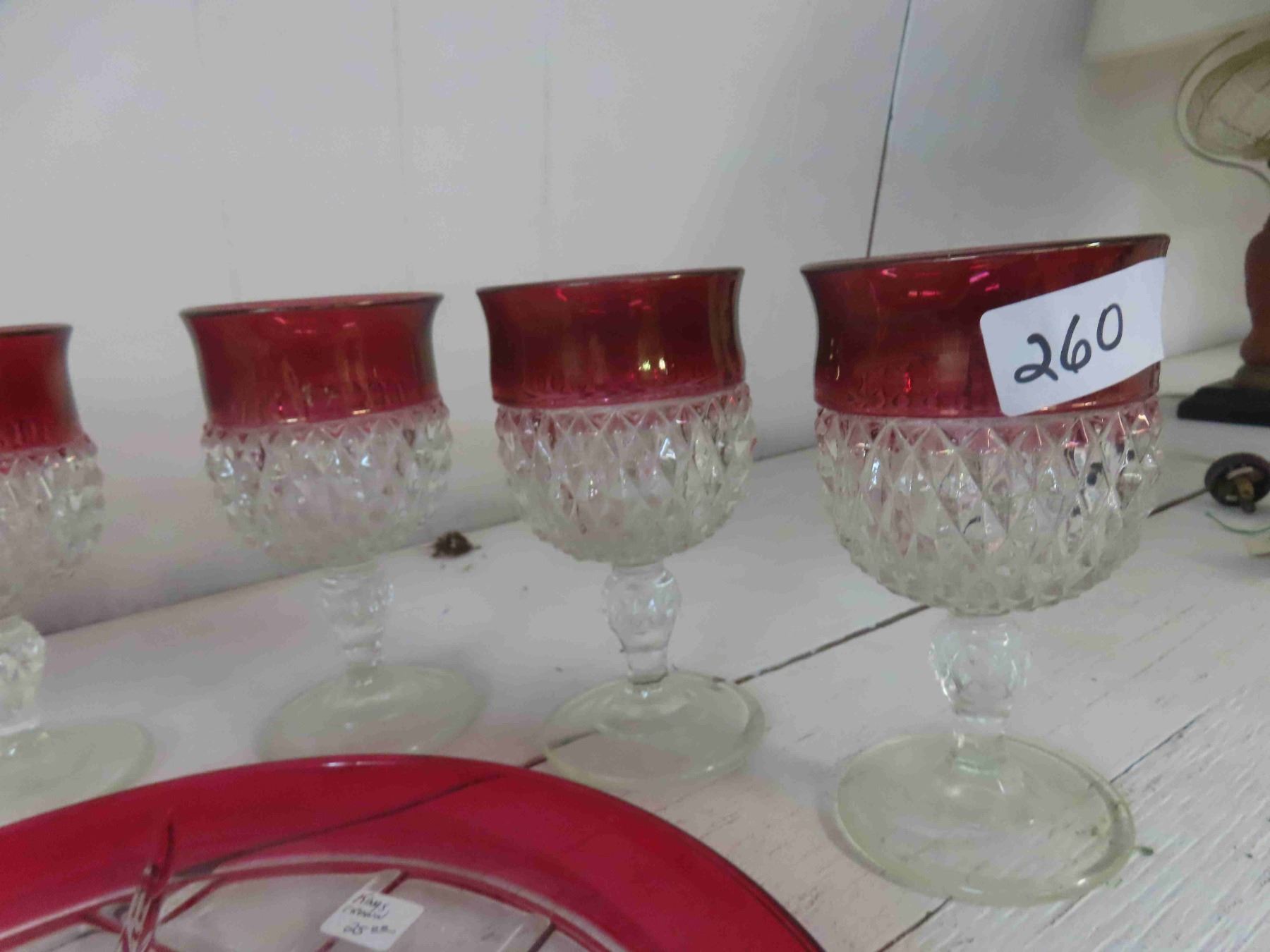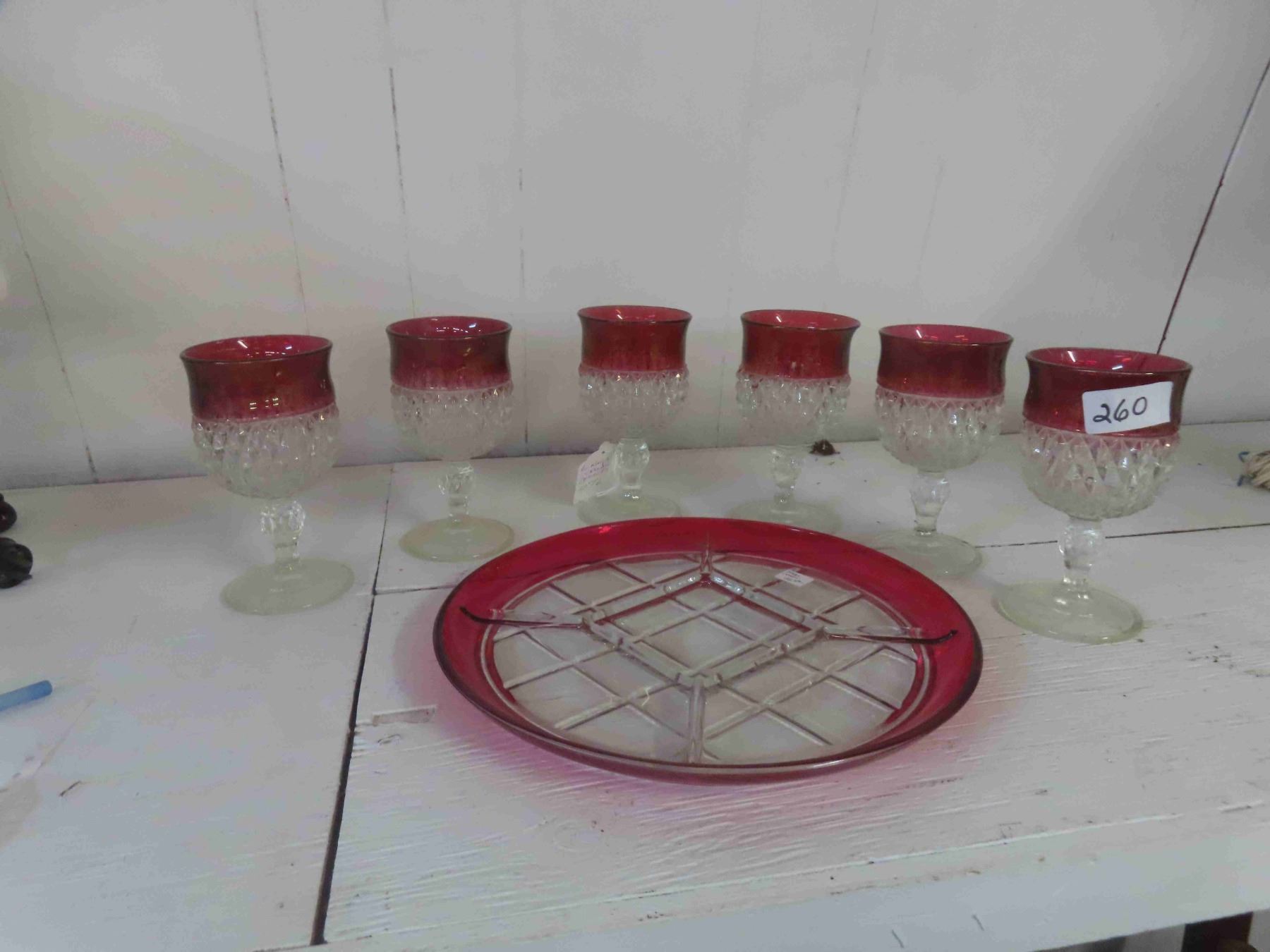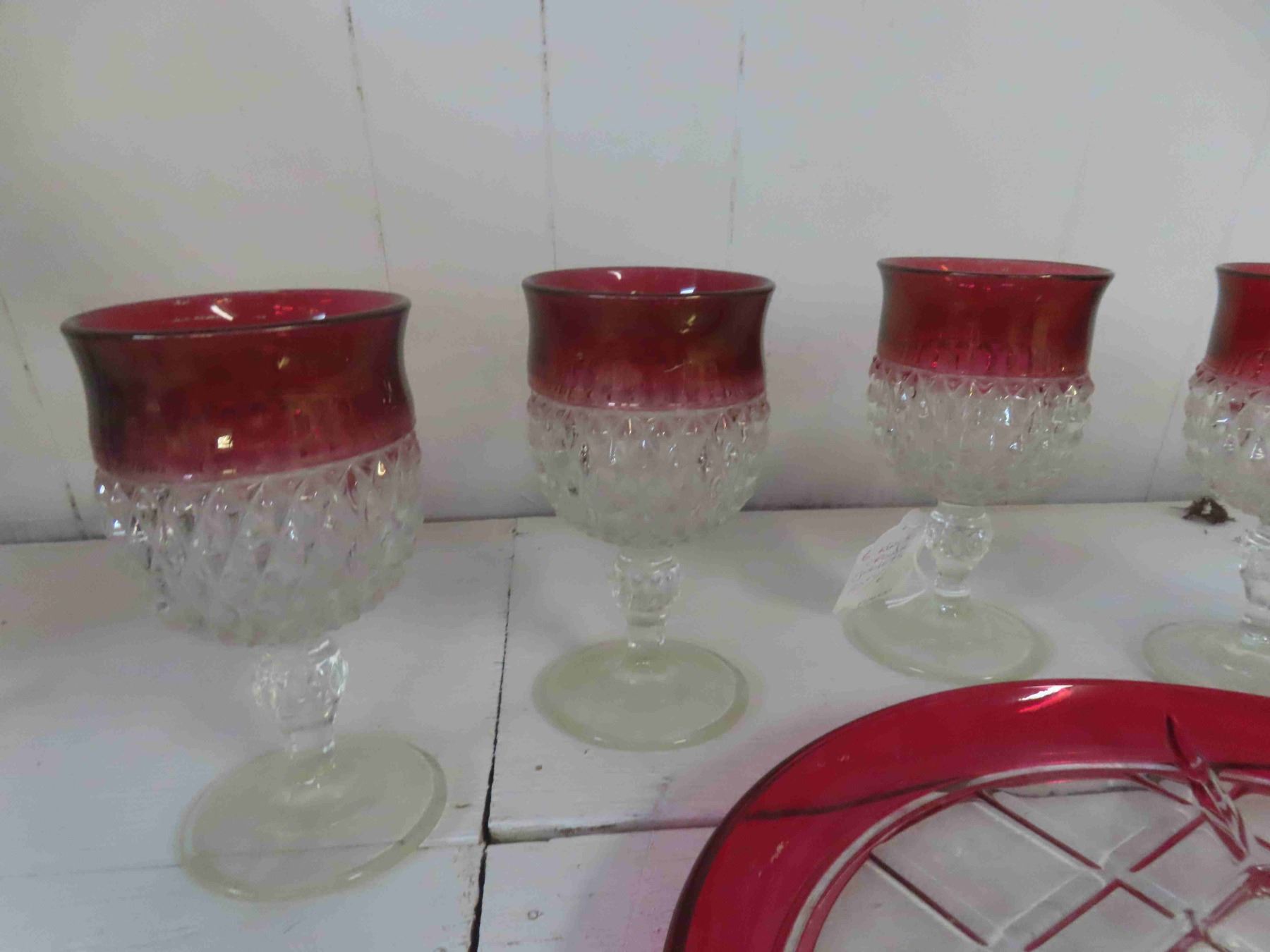 6 Kings Crown Crystal with Cranberry Trim Goblets + Cheese Tray