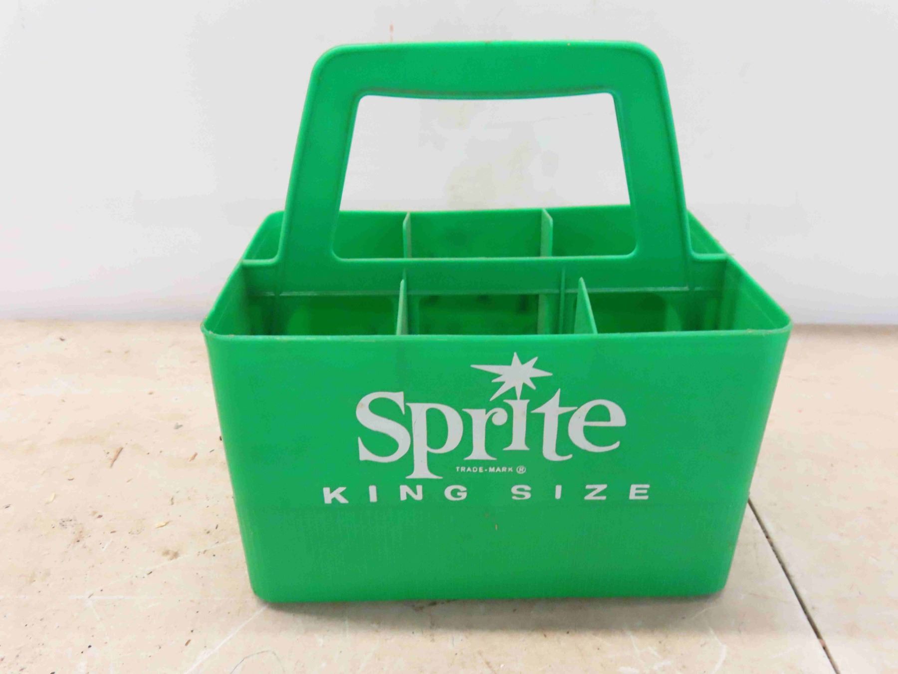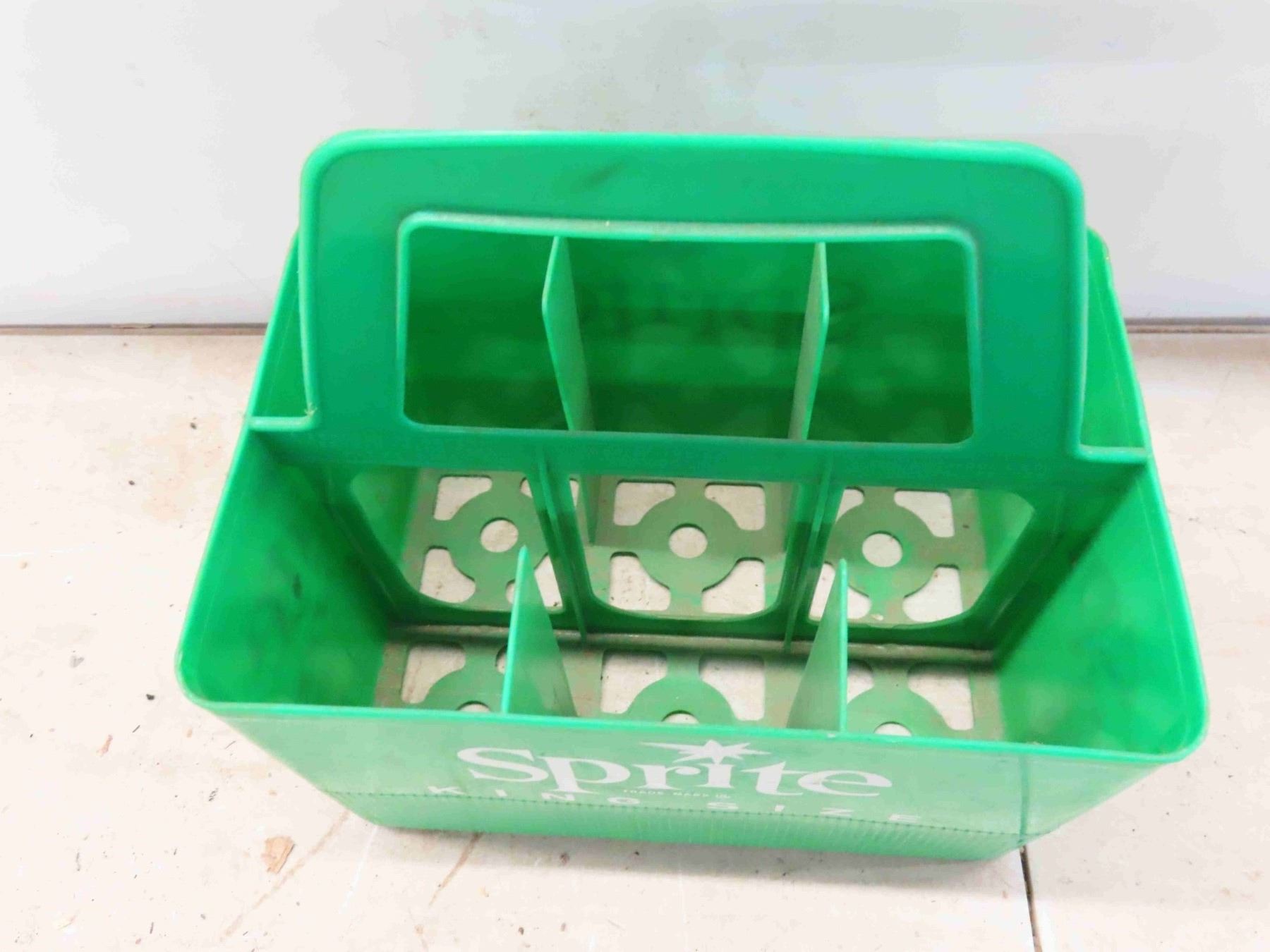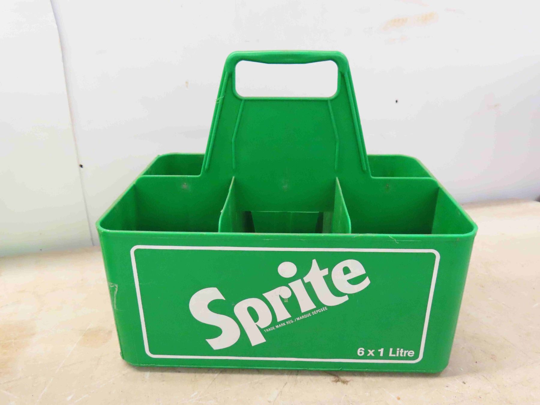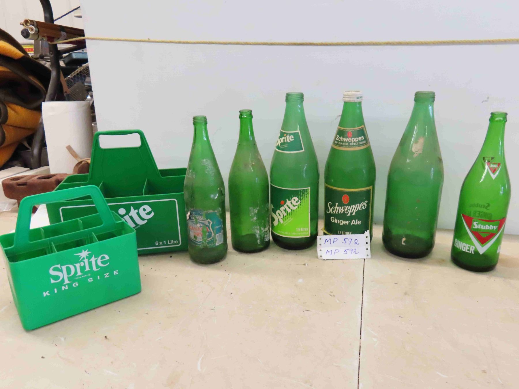 6 Large Green Bottles Some with Paper Labels : Sprite, Stubby, Schweppes & 2 Plastic Carriers
