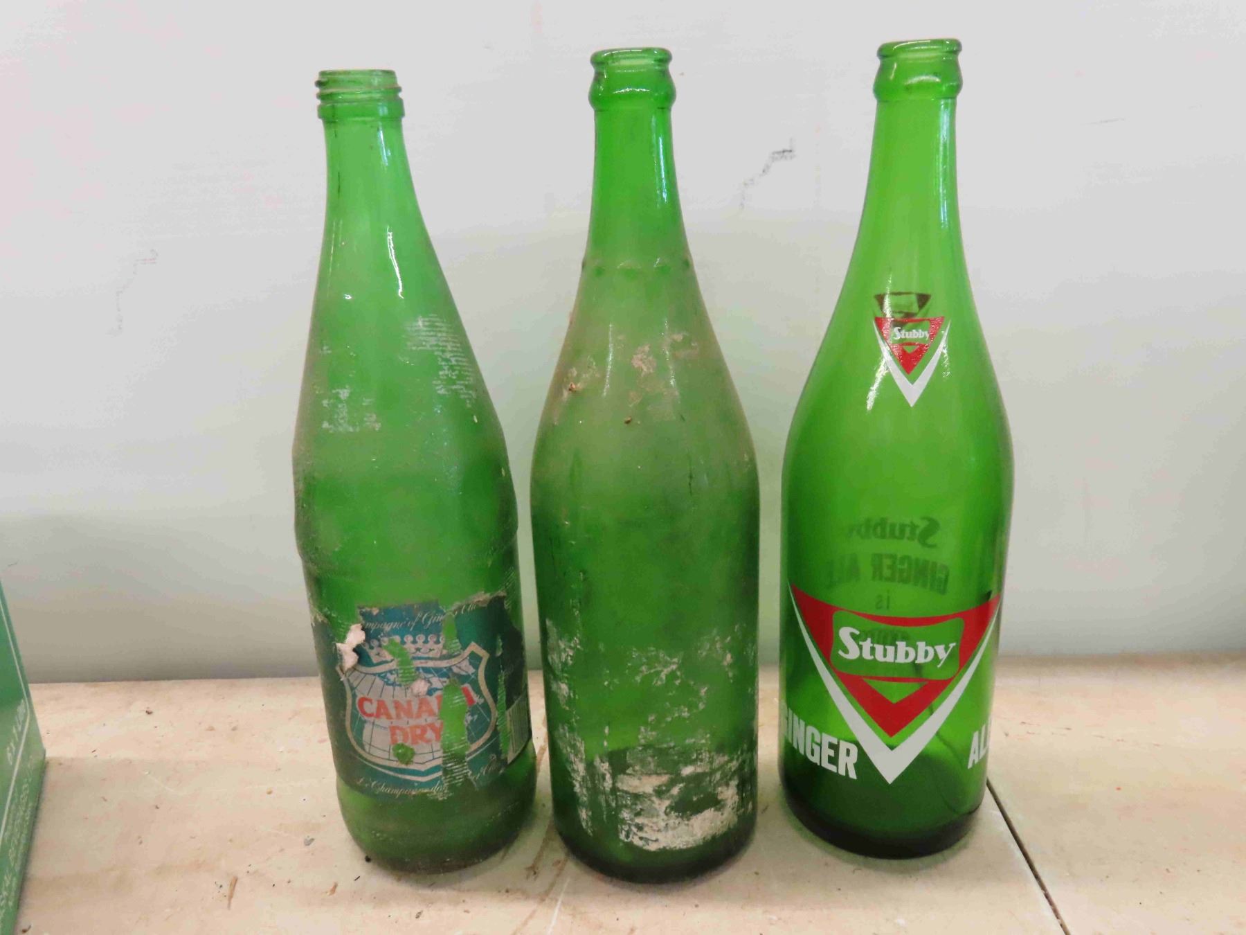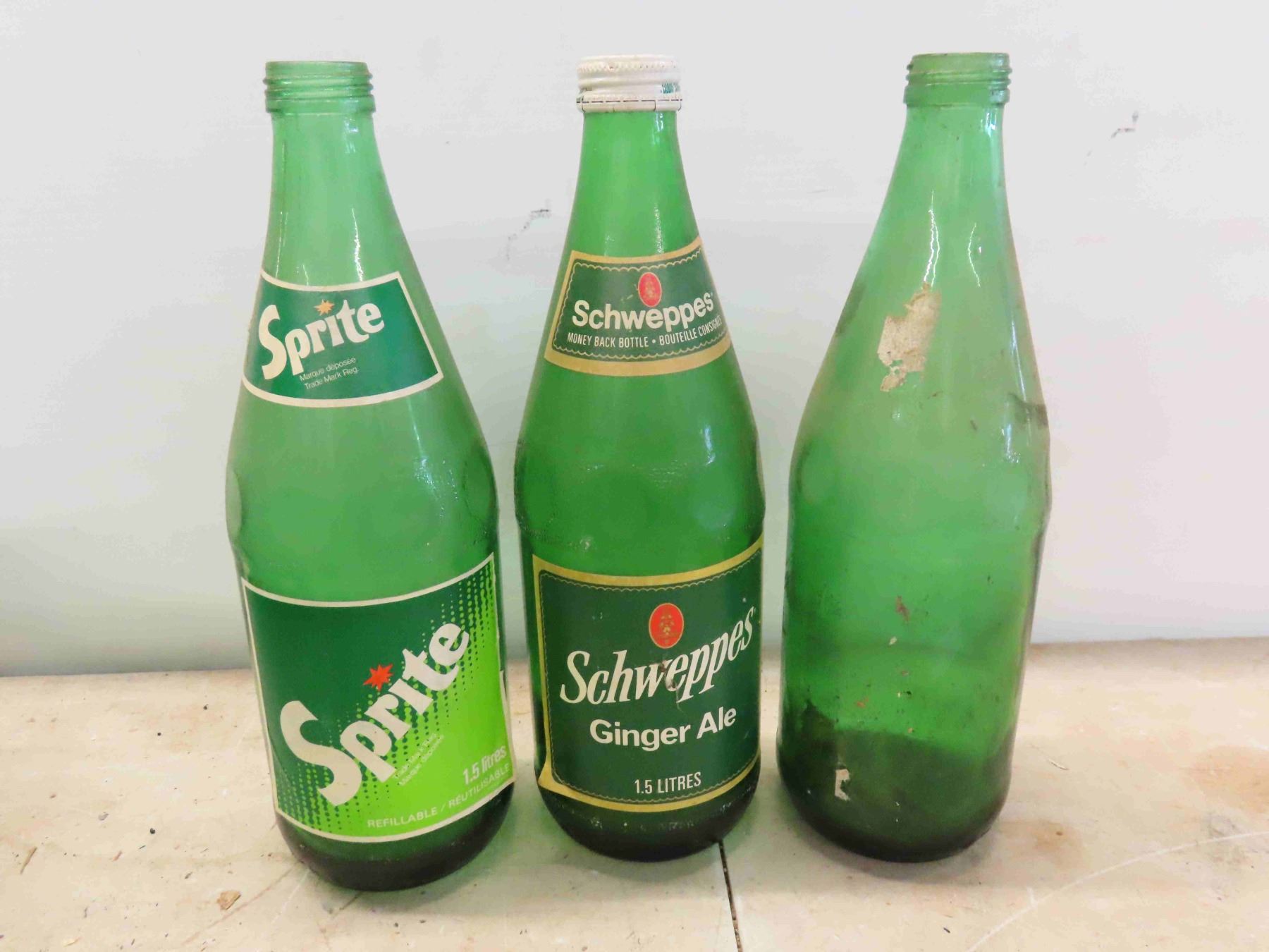 6 Large Green Bottles Some with Paper Labels : Sprite, Stubby,