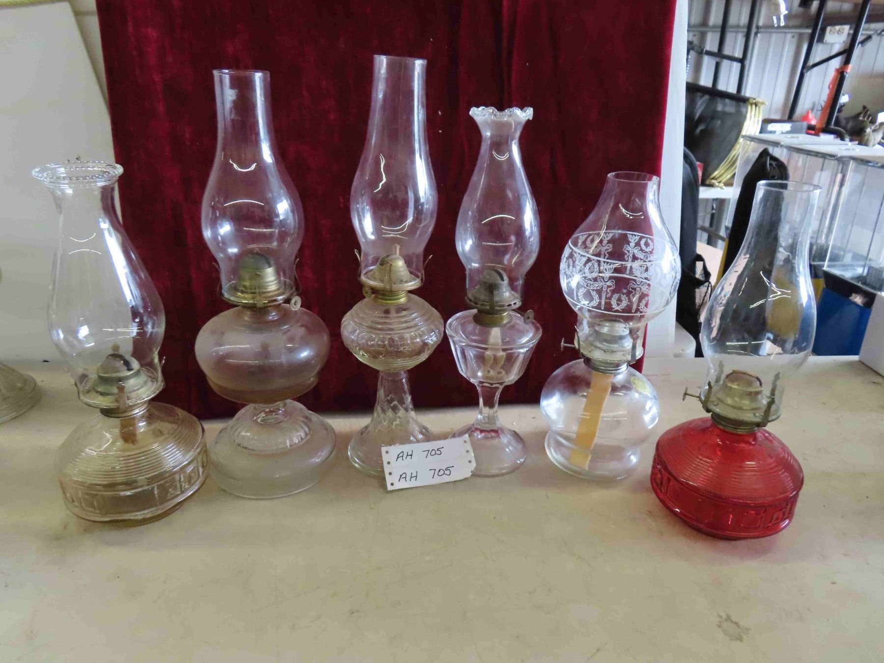 6 Oil Lamps with Chimneys - 1 with Red Base