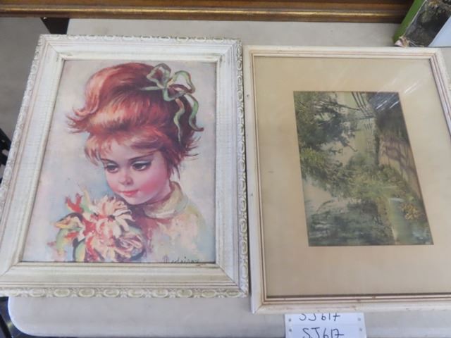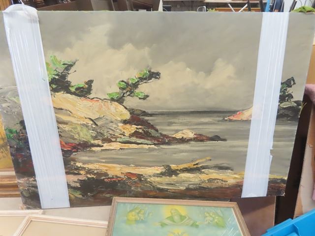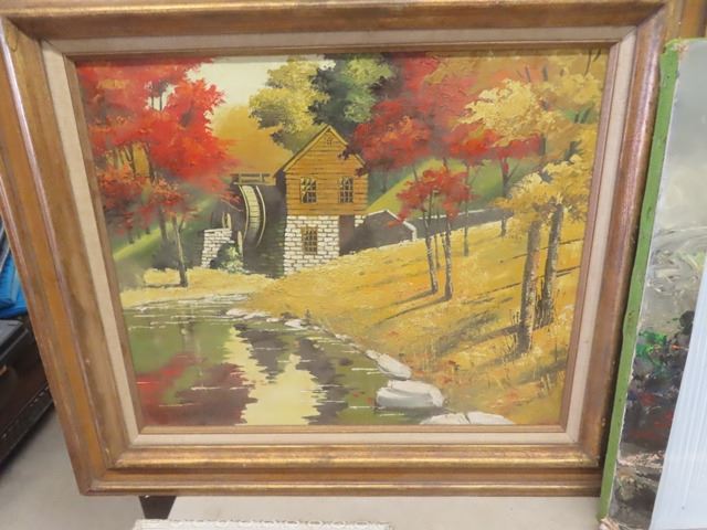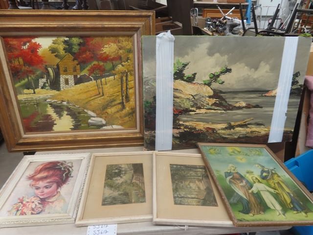 6 Old Pictures; Large Framed Oil on Canvas, Mill, Oil on Canvas Lake Scene, 1 Religious, 3 Smaller F