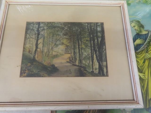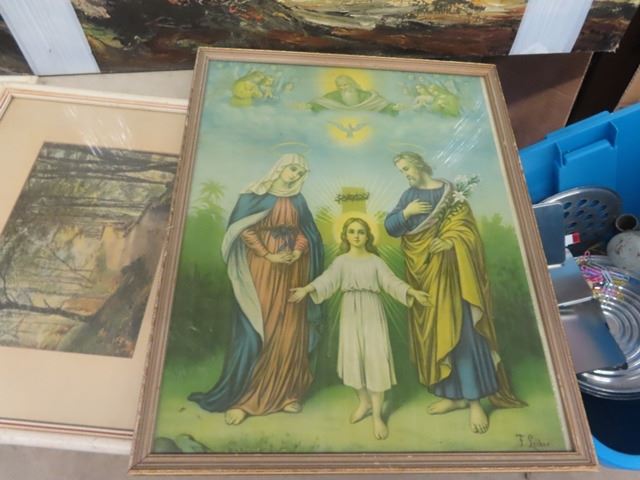 6 Old Pictures; Large Framed Oil on Canvas, Mill, Oil on Canvas Lake Scene, 1 Religious, 3 Smaller Framed Pictures