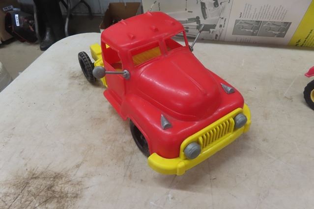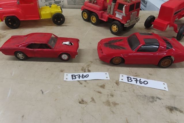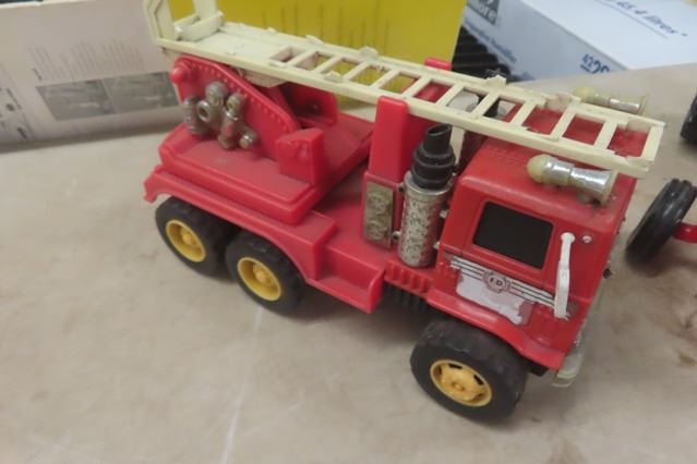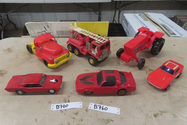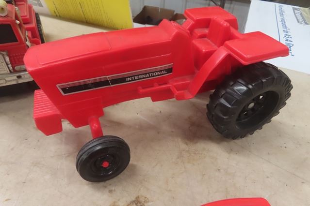 6 Plastic Toy Vehicles ; IH Tractor, Firetruck, Semi Truck Cab, 3 Cars