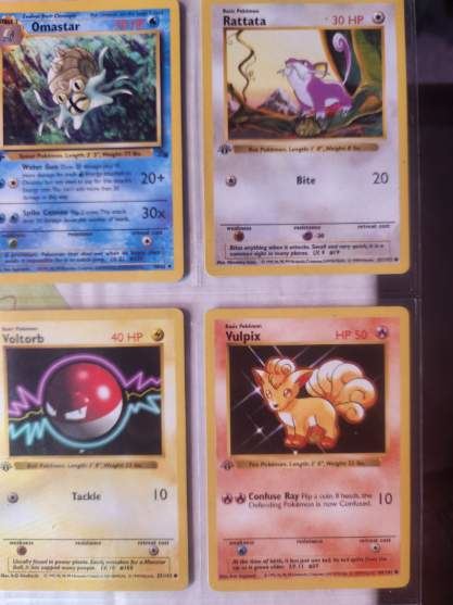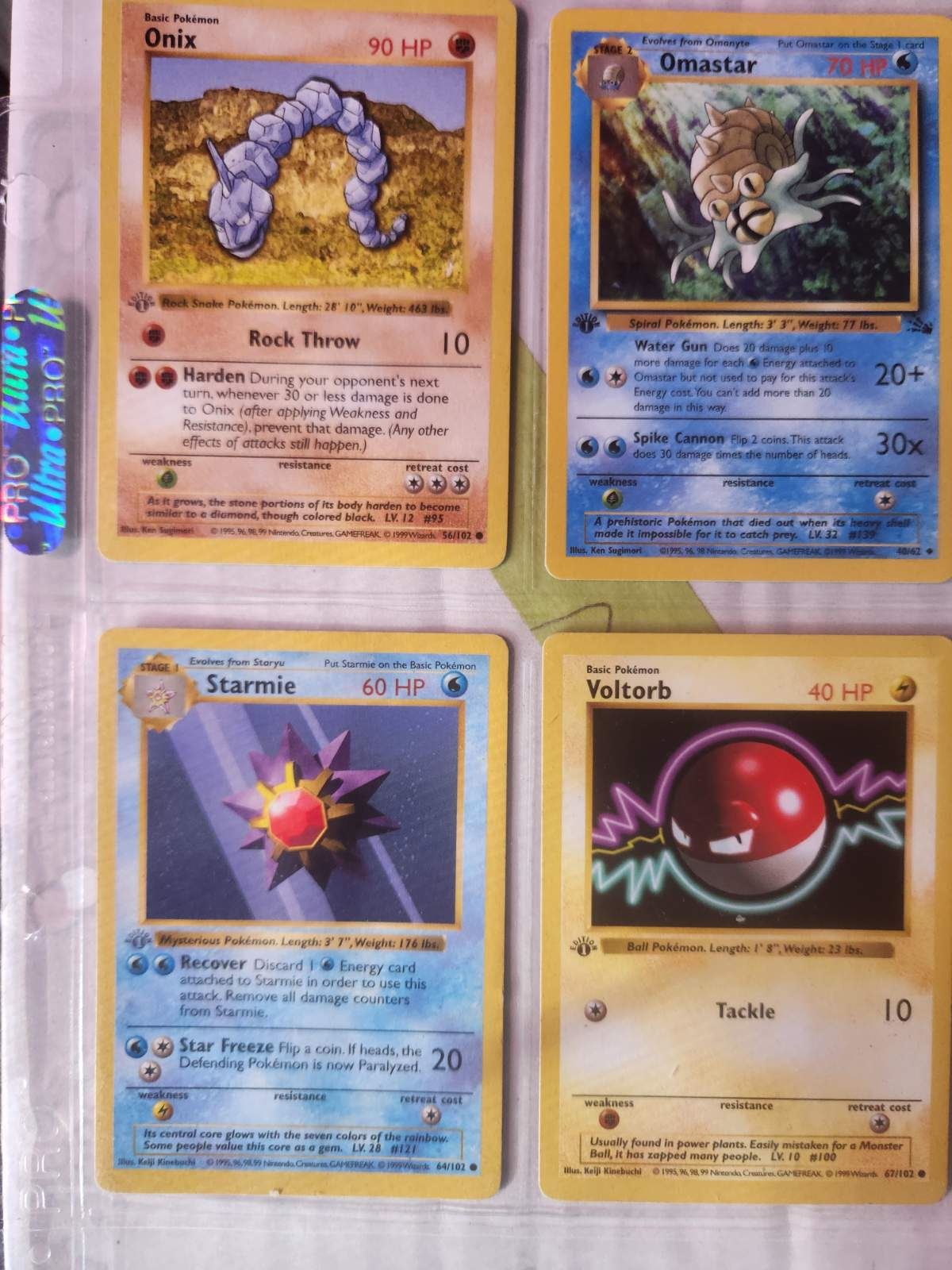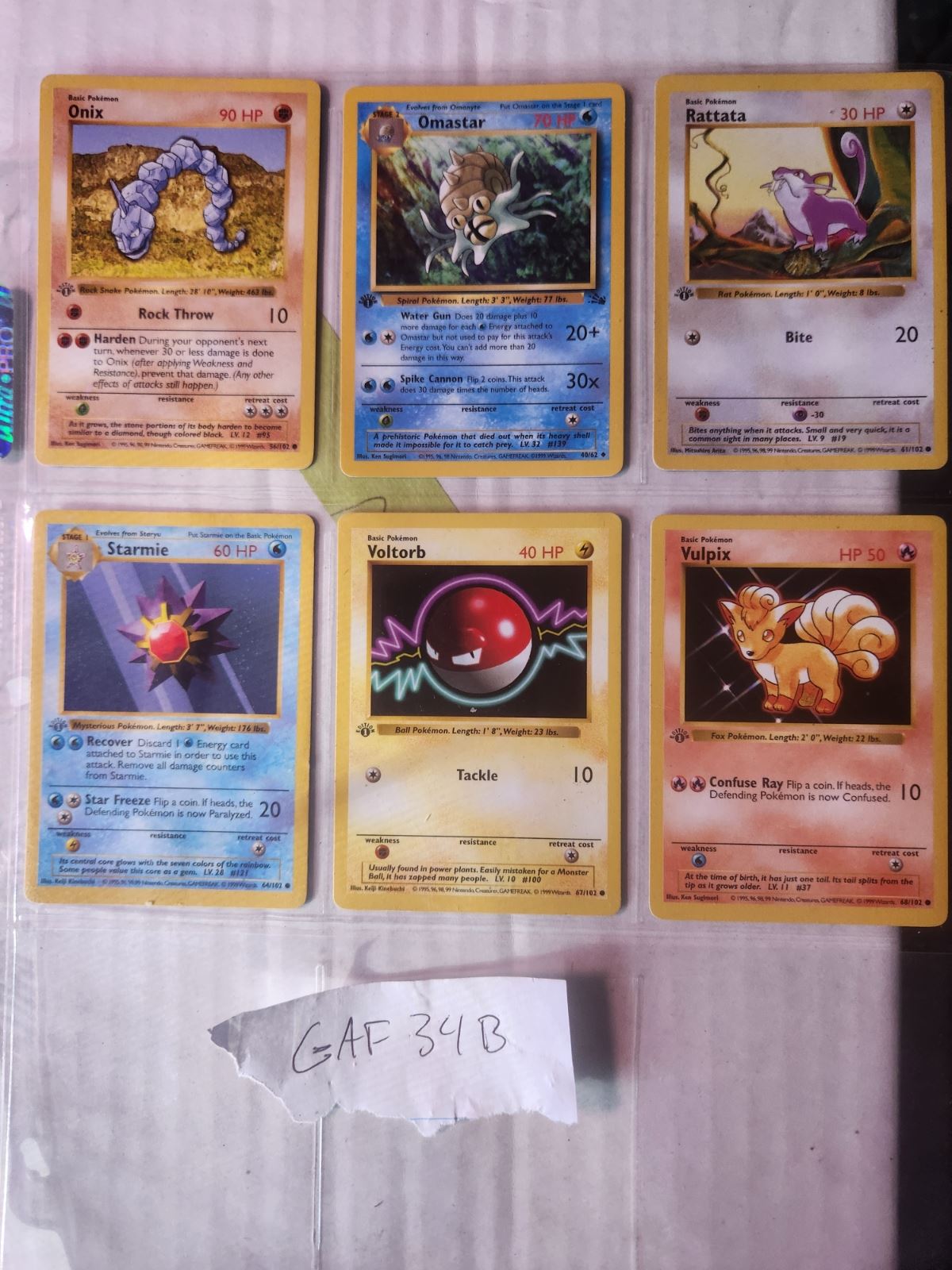 6 Pokemon cards. All 1st editions! Onix, Omastar, Rattata, Starmie, Voltorb, Vulpix