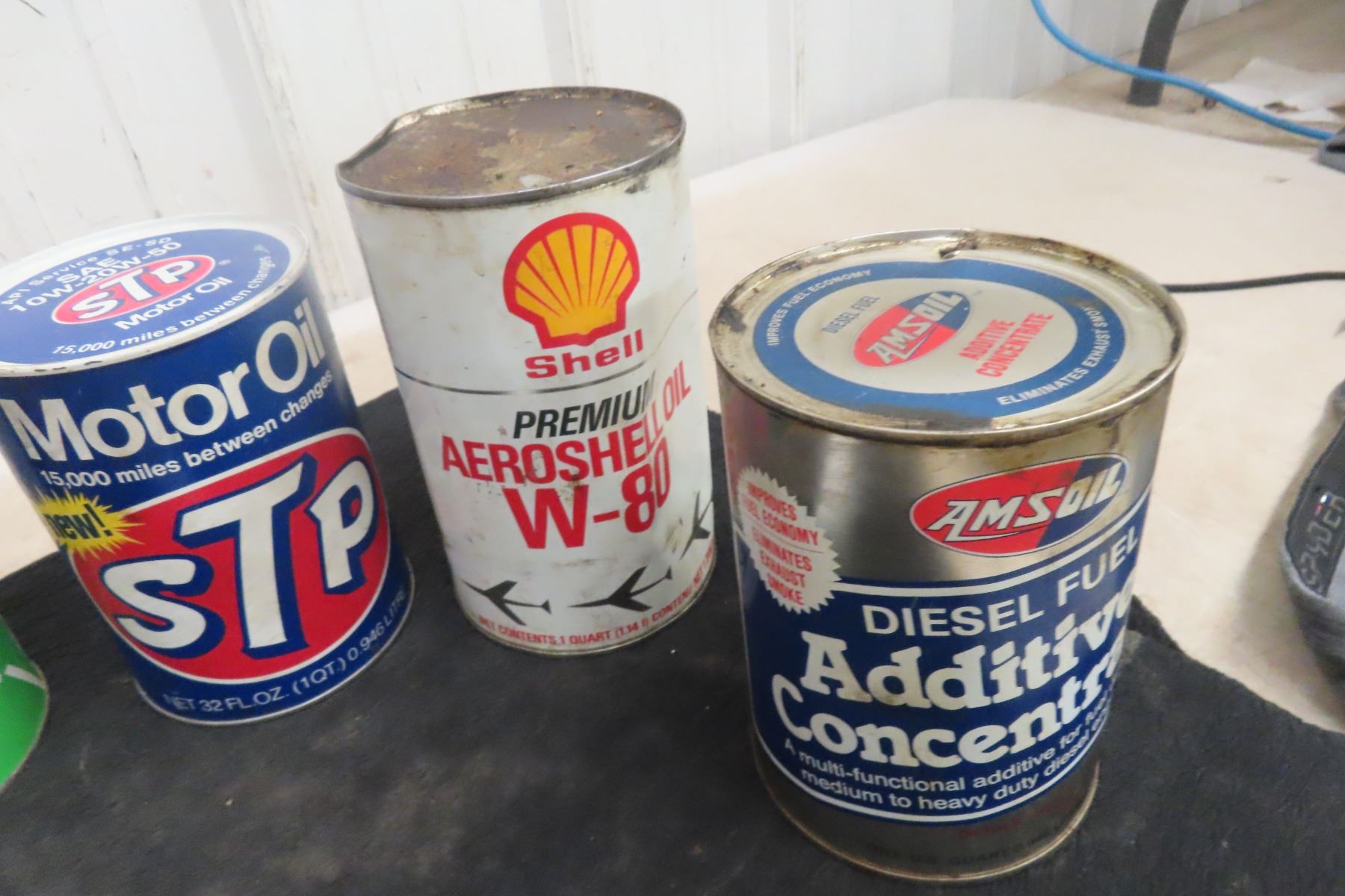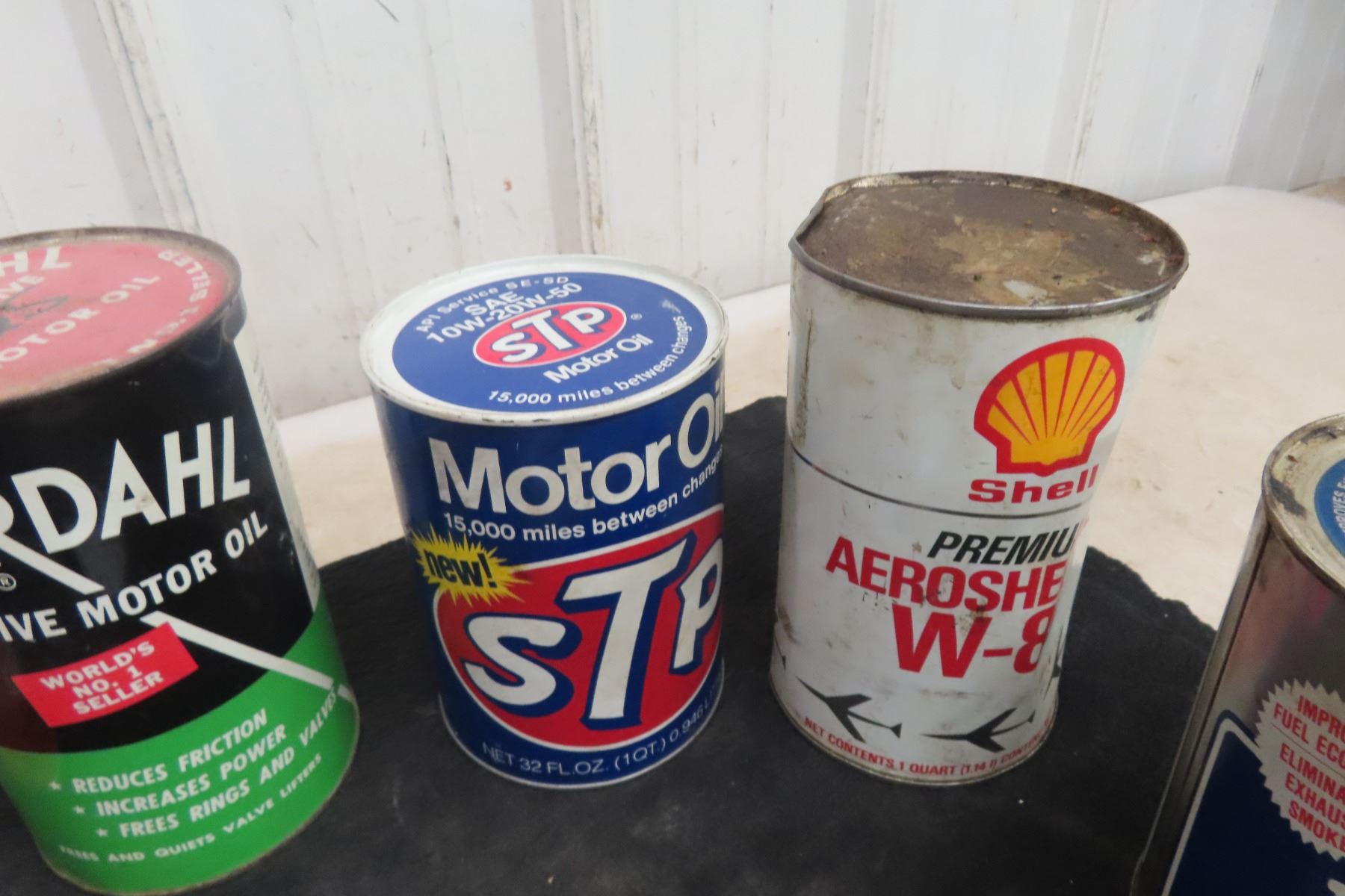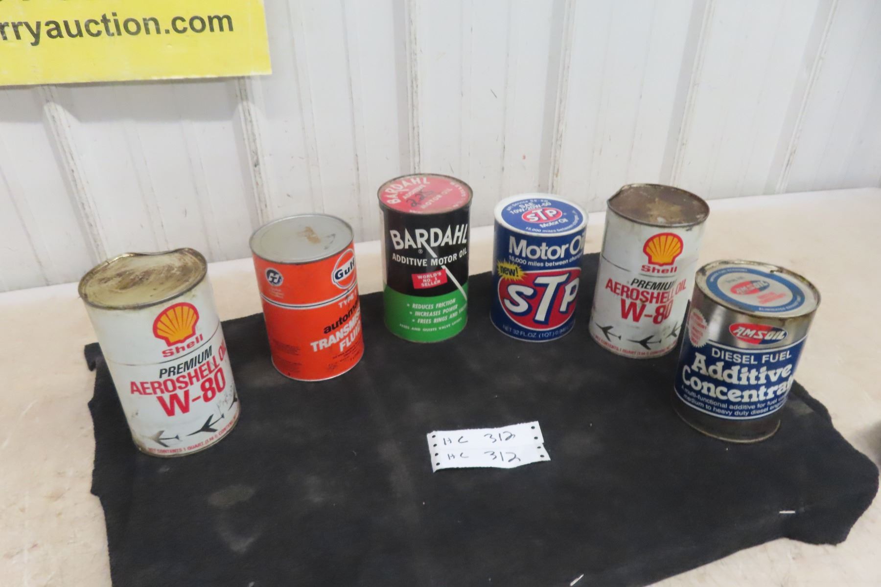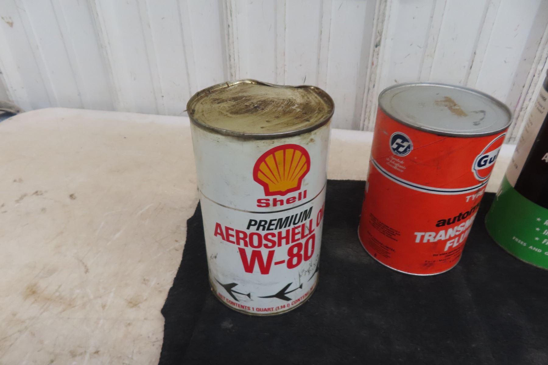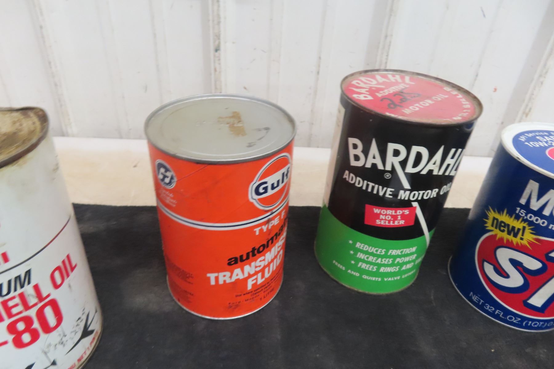 (6) Quart Cans, 5 with Product : Shell, Motor Oil, Gulf, AMS Oil, Barochl.