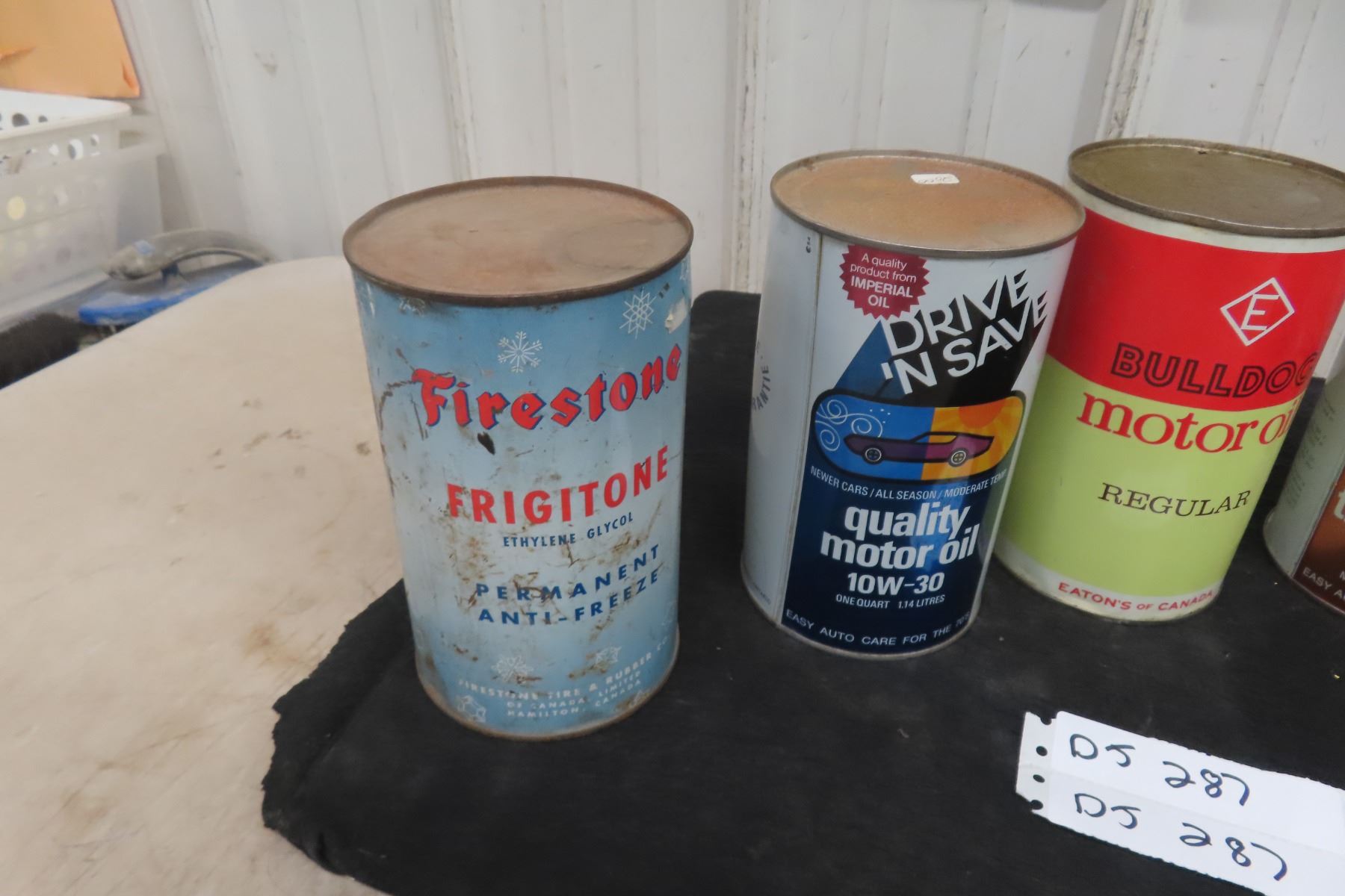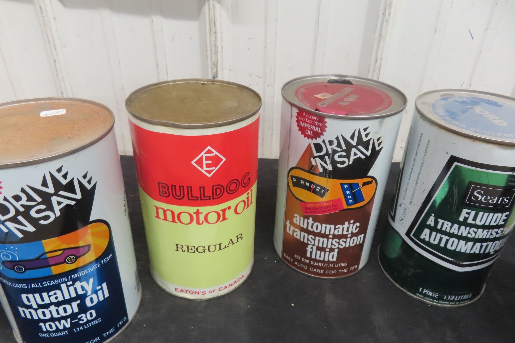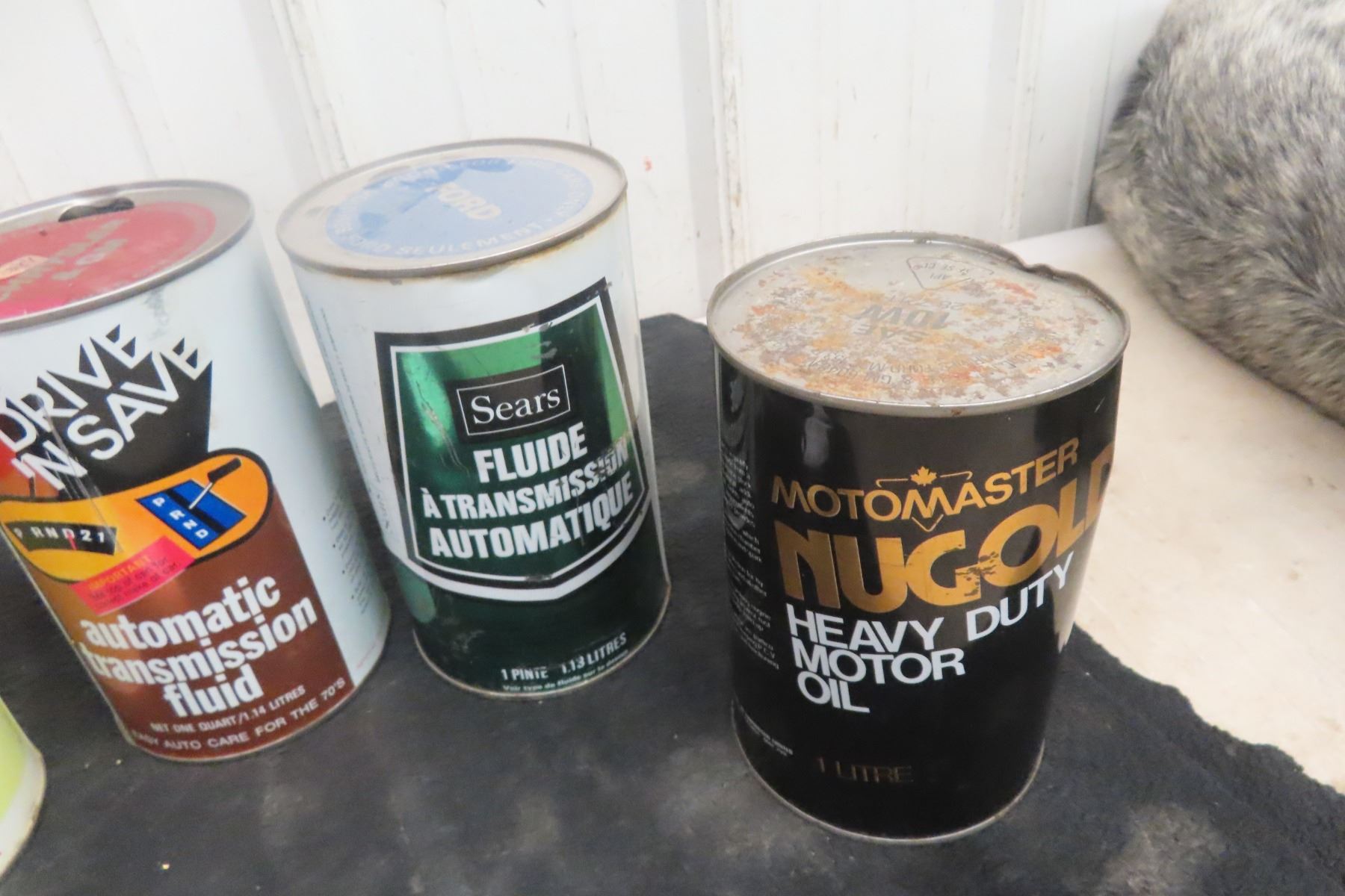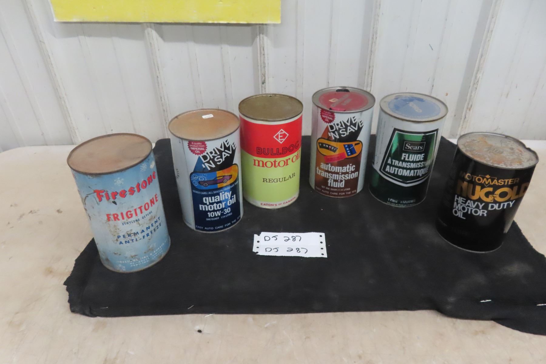 (6) Quart Oil Cans, 4 with Product : Bulldog, Sears, Motomaster, Firestone, Drive n Save.