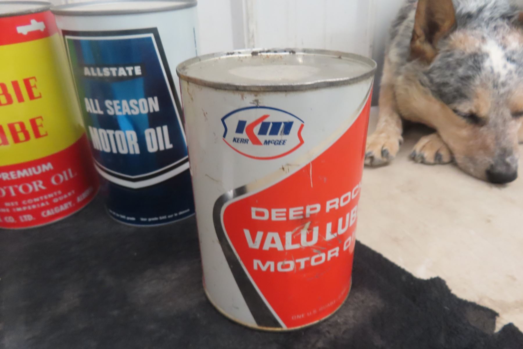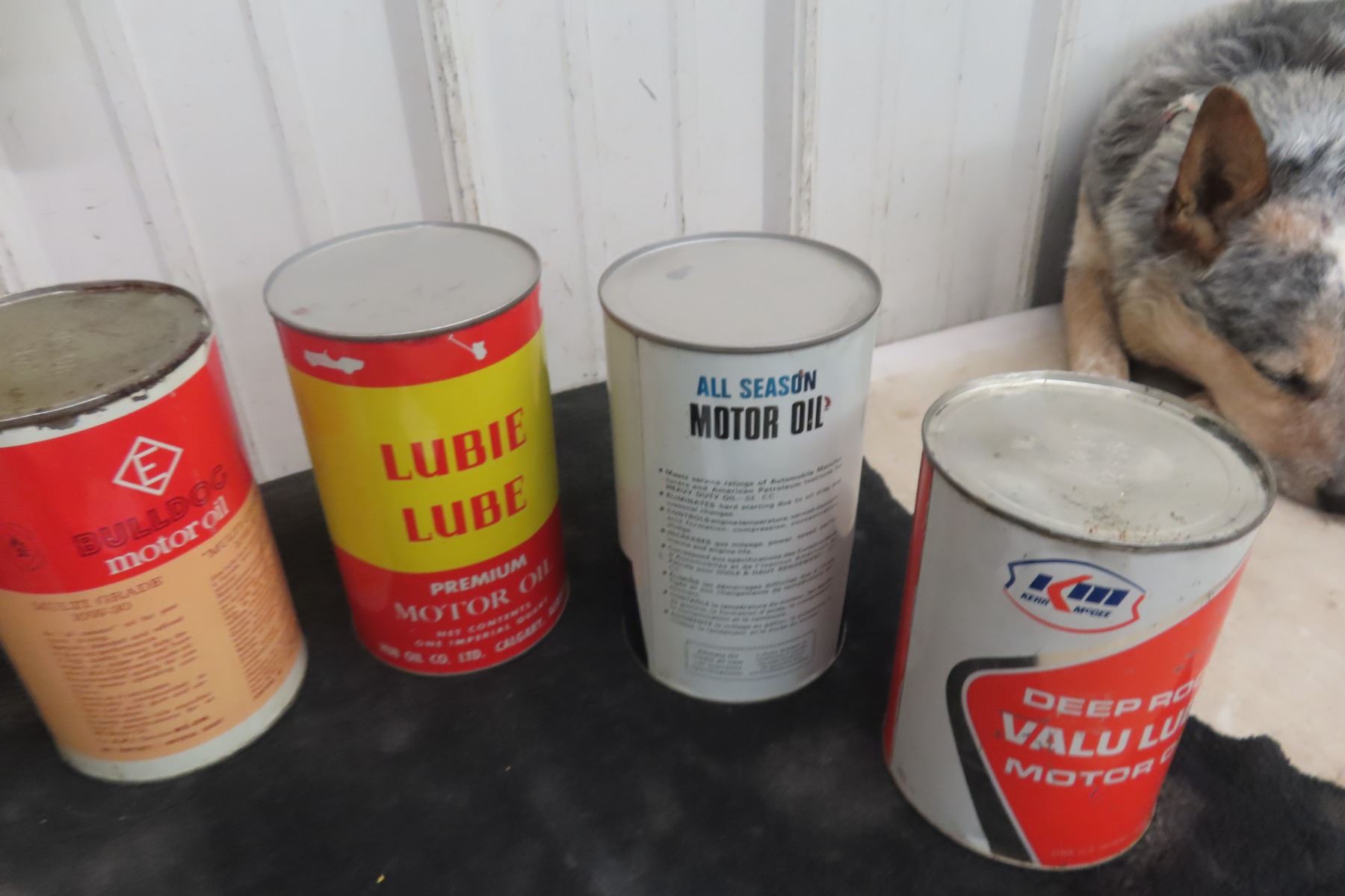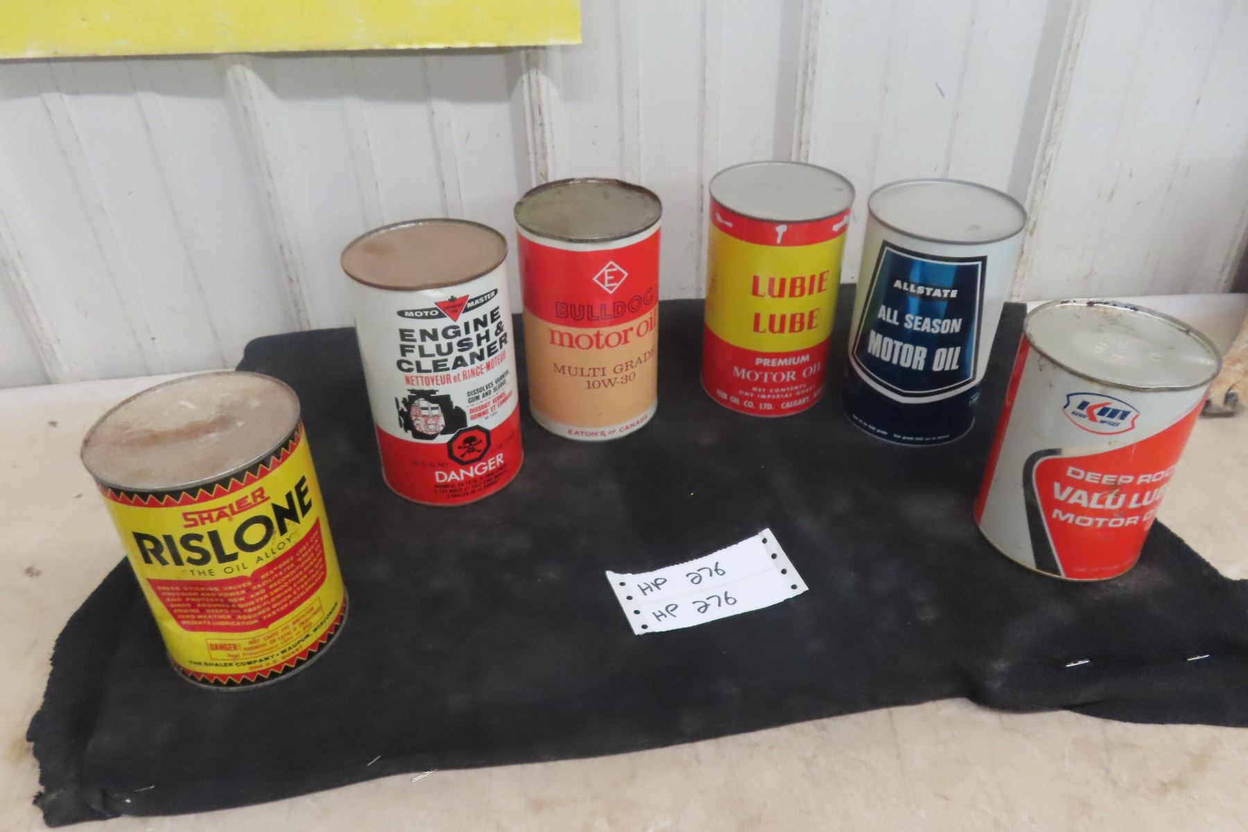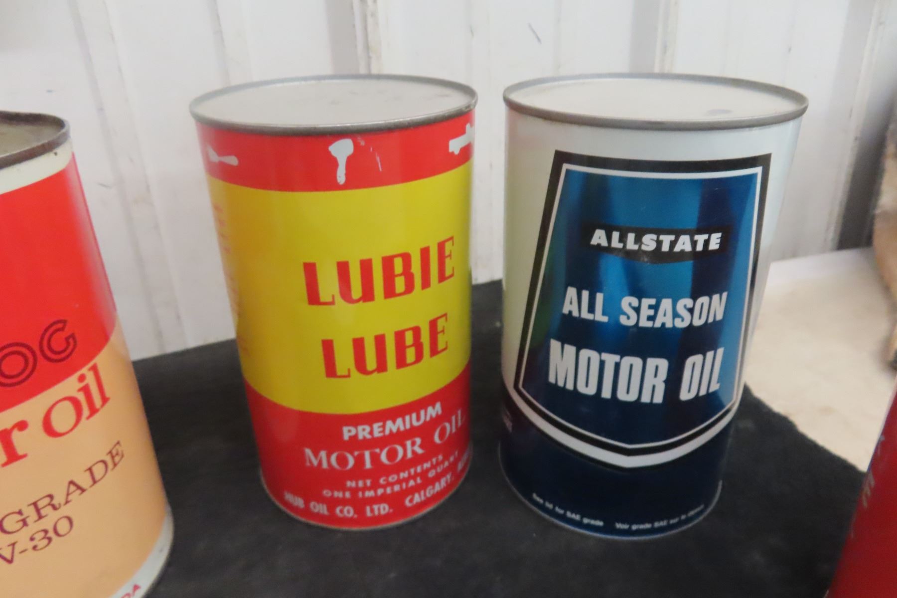 (6) Quart Oil Cans, All with Product: Bull Dog, All State, Lubie Lube, Kerr McGee, Motomaster, Shaler.