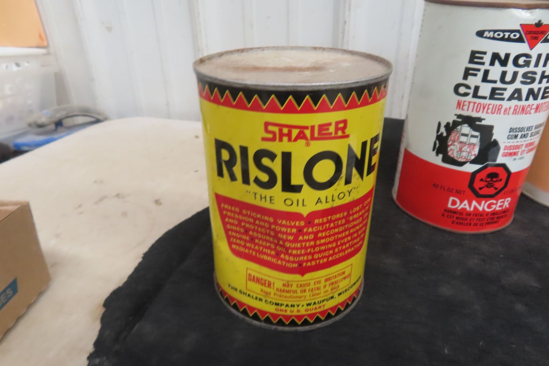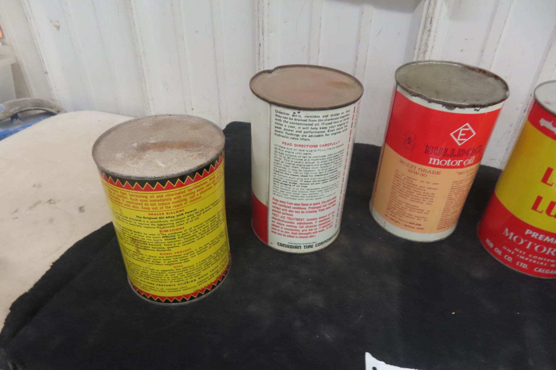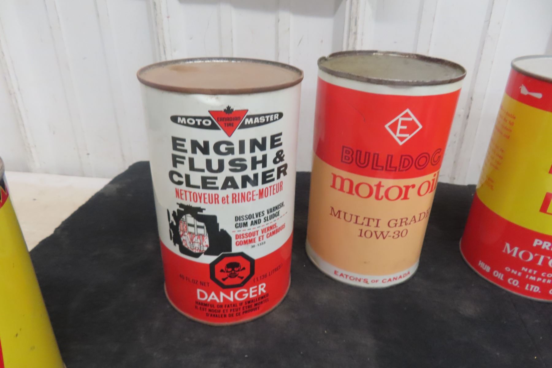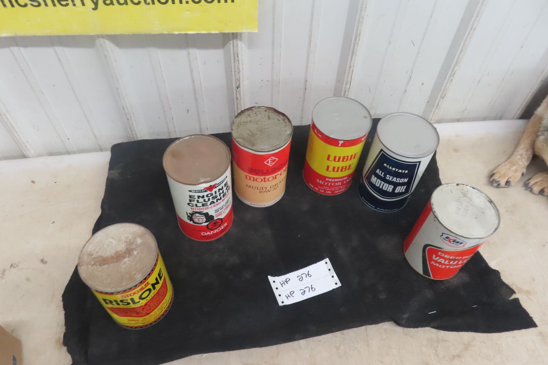 (6) Quart Oil Cans, All with Product: Bull Dog, All State, Lubie Lube, Kerr McGee, Motomaster, Shaler.