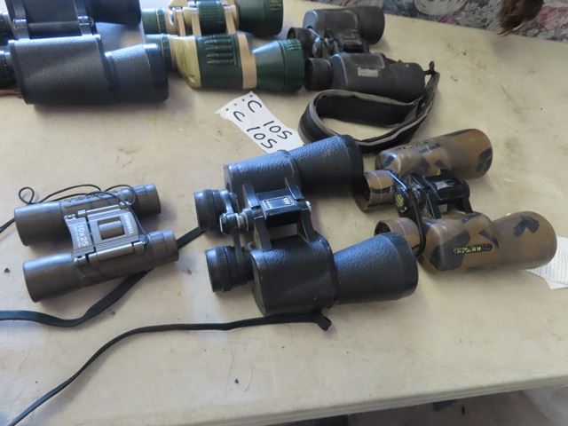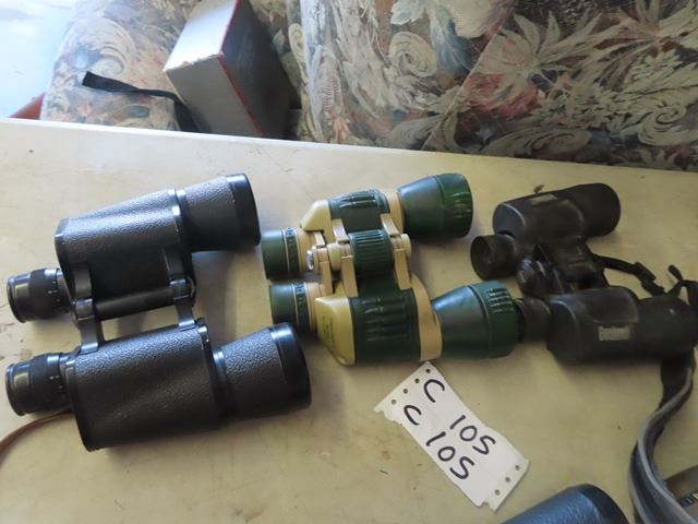 6 Sets of Binolculars- 2) are Bushnell 10x 50 Bushnell 10 x 42,  Russian 99990x 99990, Tasco 7x 50 & Bushnel 10 x 25