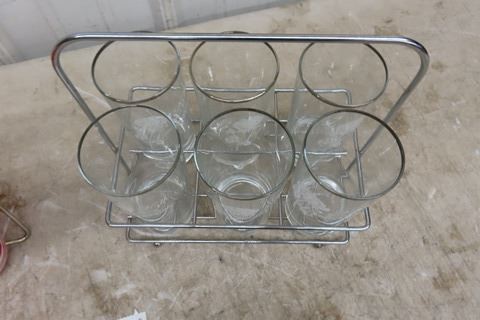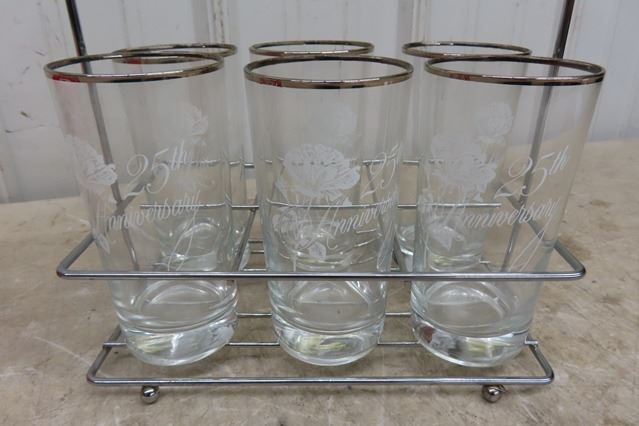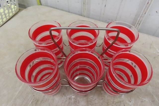 6 Vintage Red + White Striped Drinking Glasses with Chrome Holder, 25th Anniverssary Drinking Glasses with Chrome Holder