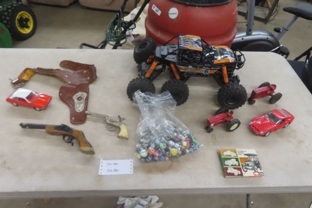 6 Wheel Drive Battery Operated Toy, Die Cast Pinto, 2 Die Cast Tractors, Bag of Marbles, 2 Toy Guns,