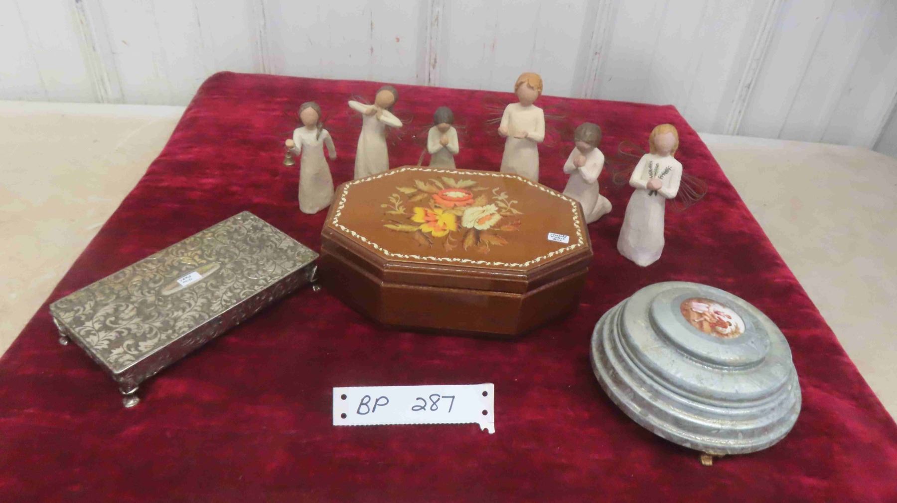 6 Willow Tree Dolls Tallest is 5 3/4'' , 2 Trinklet Boxes Very Old , 1 Musical Jewelry Box