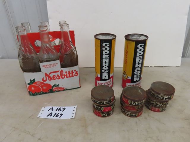6 Wishing Well Bottles in Nesbitts Cardboard 6 Pack, 2 Copenhagen Snuff Dispensers, 9 Small Copenhagen Tins