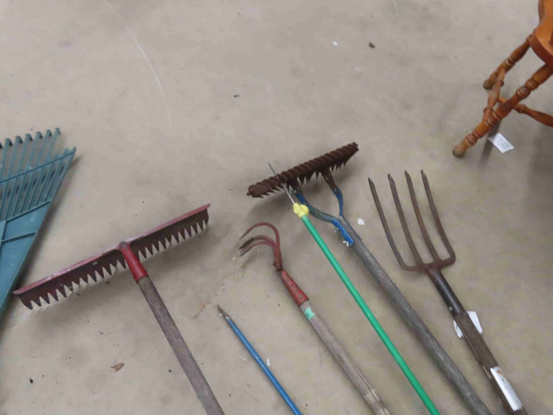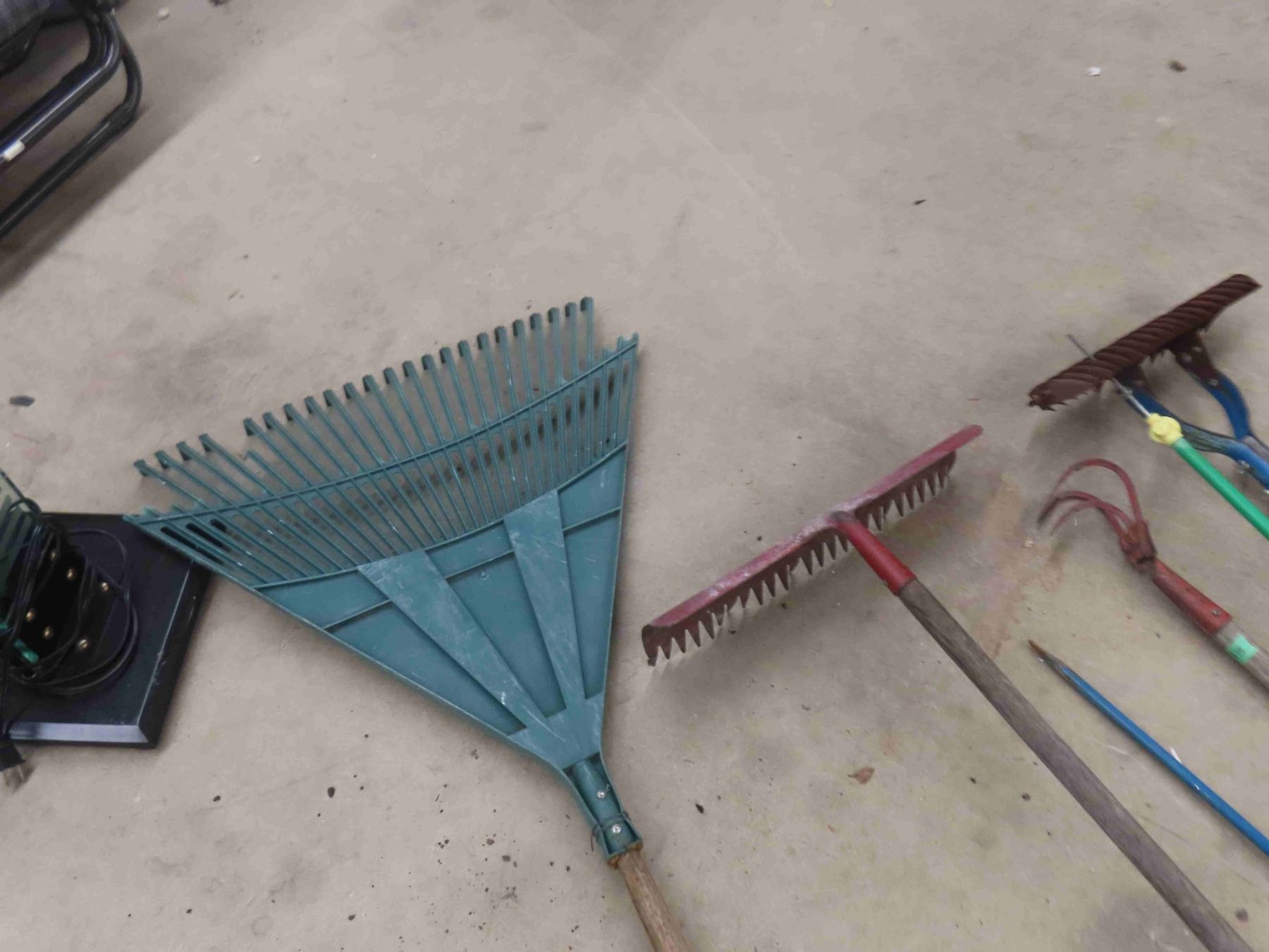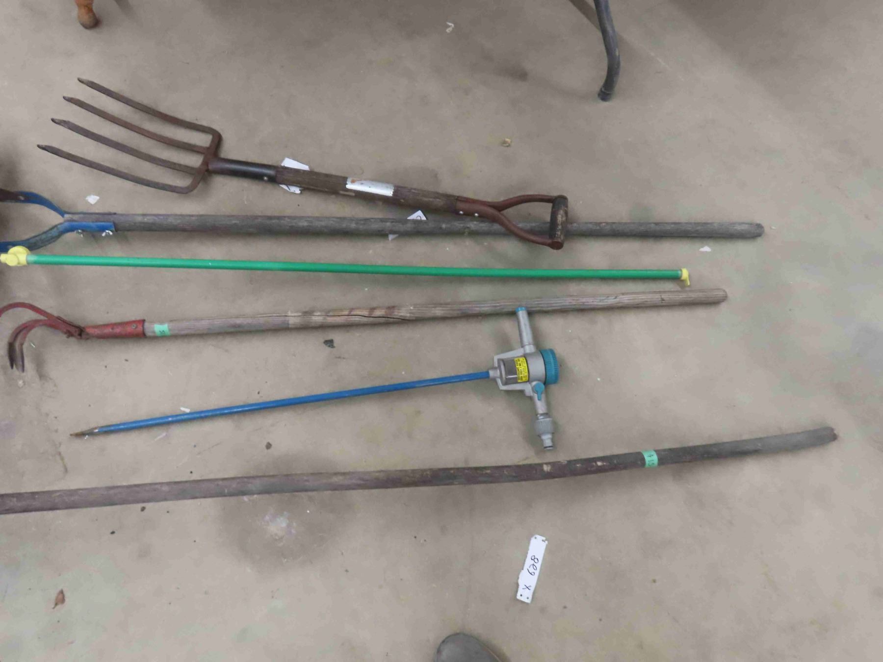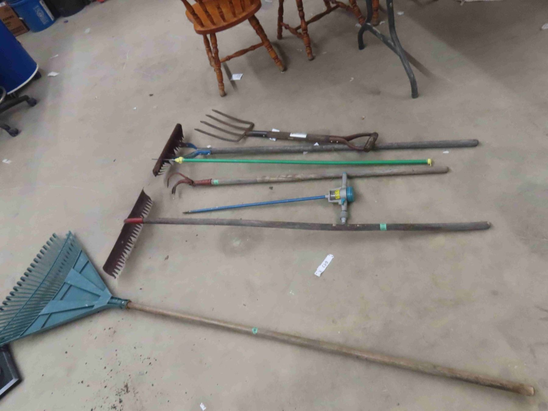6 Yard Items ; 3 Rakes, Scuffler, Potato Fork, Water Sprayer