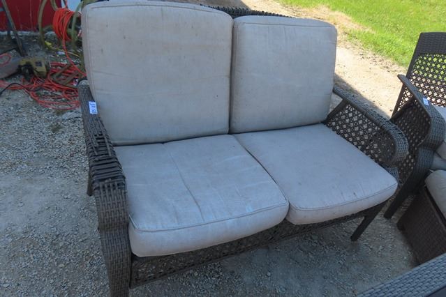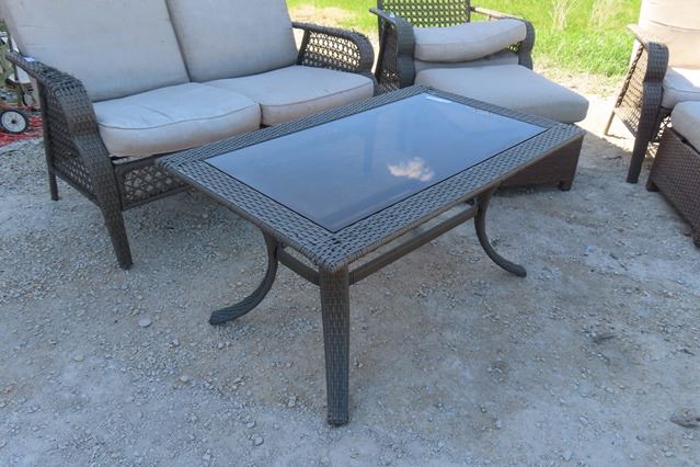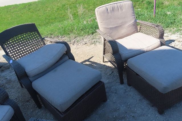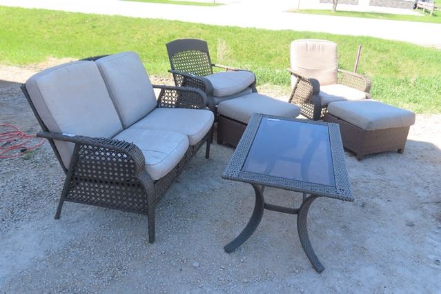 6 pc Sunroom Furniture ; Seatee, 2 Chairs with Ottomans, Coffee Table - some wear see last picture