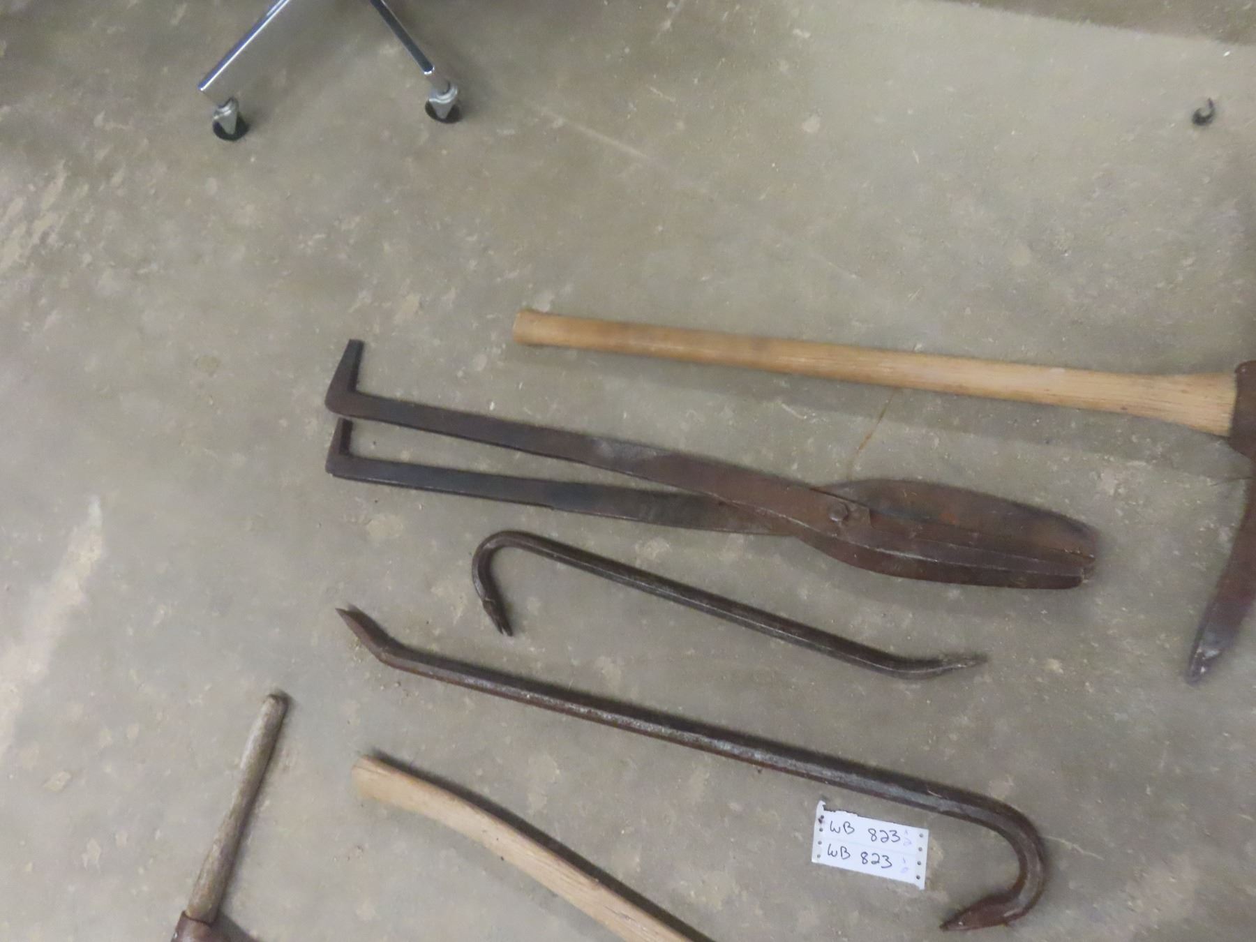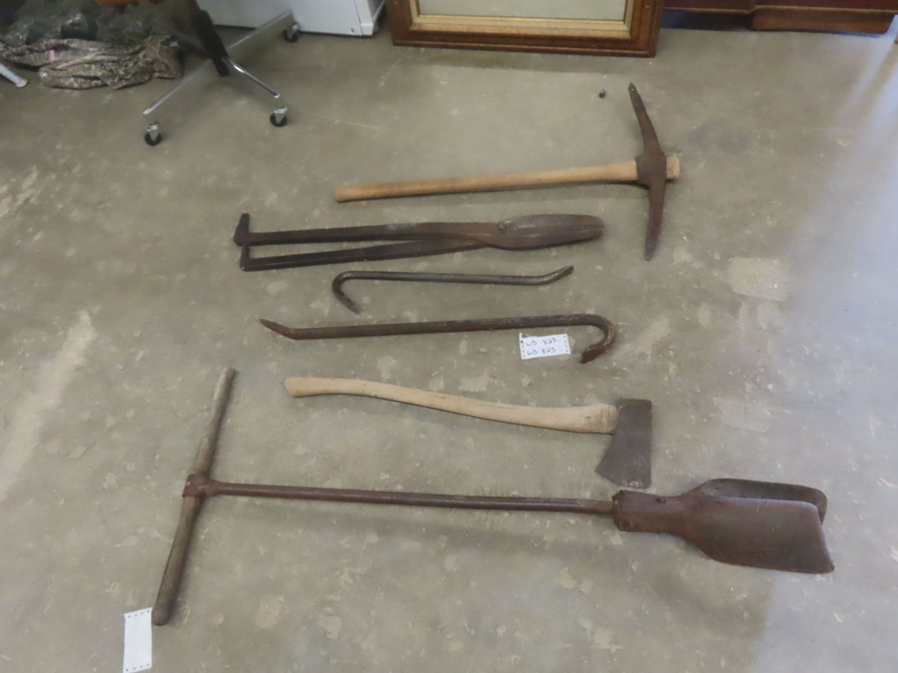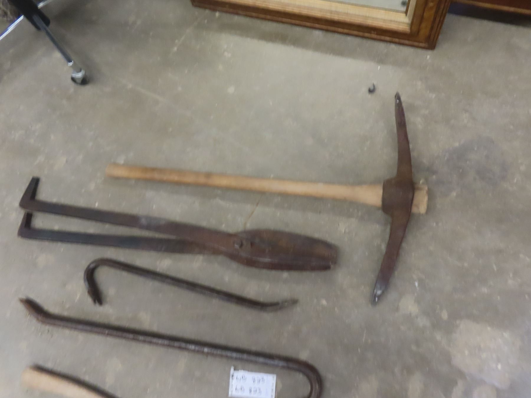 6x Hand Tools, Post Hole Digger, Axe, 2 Wrecking Bars, Pliers, Snips