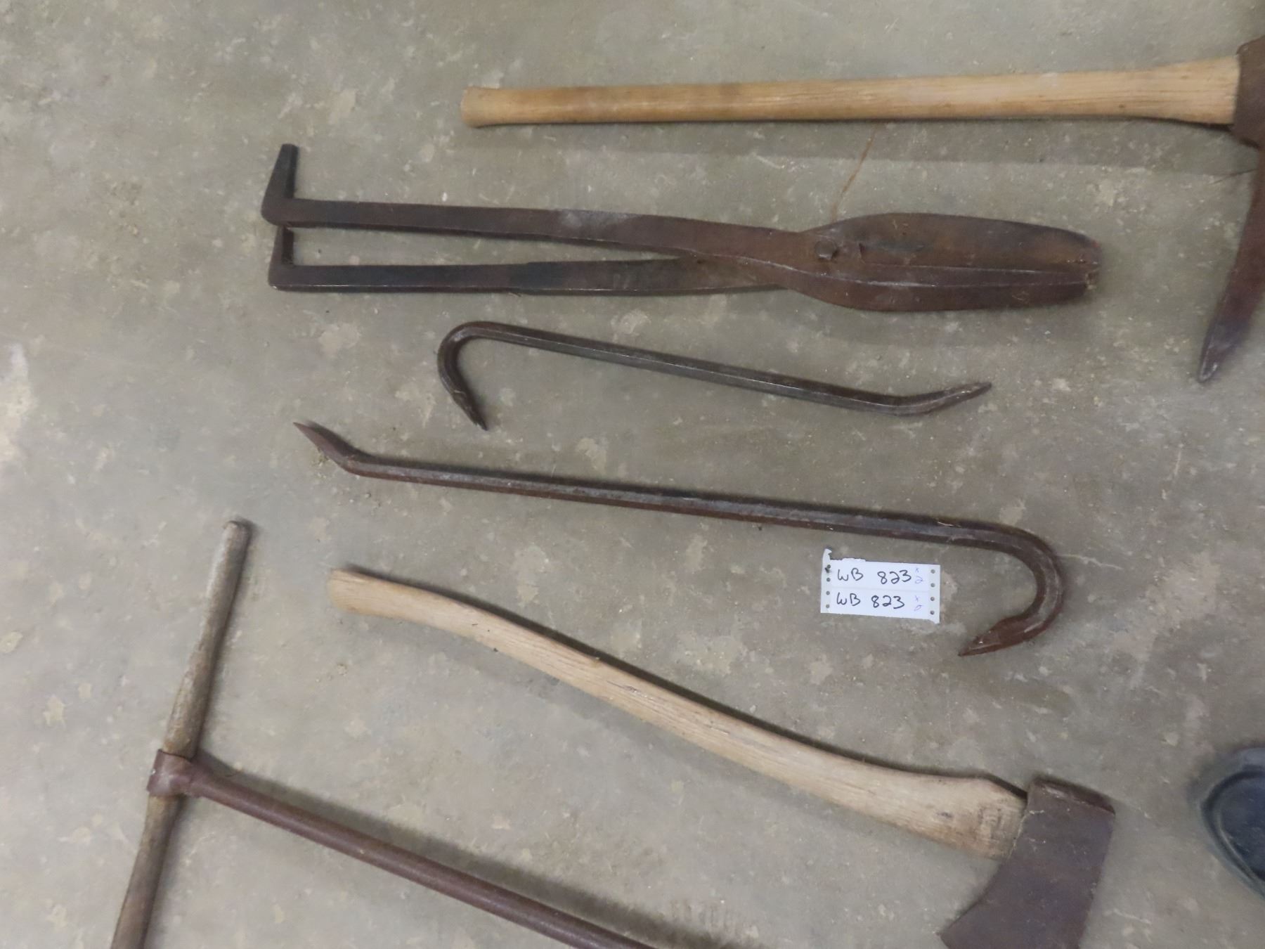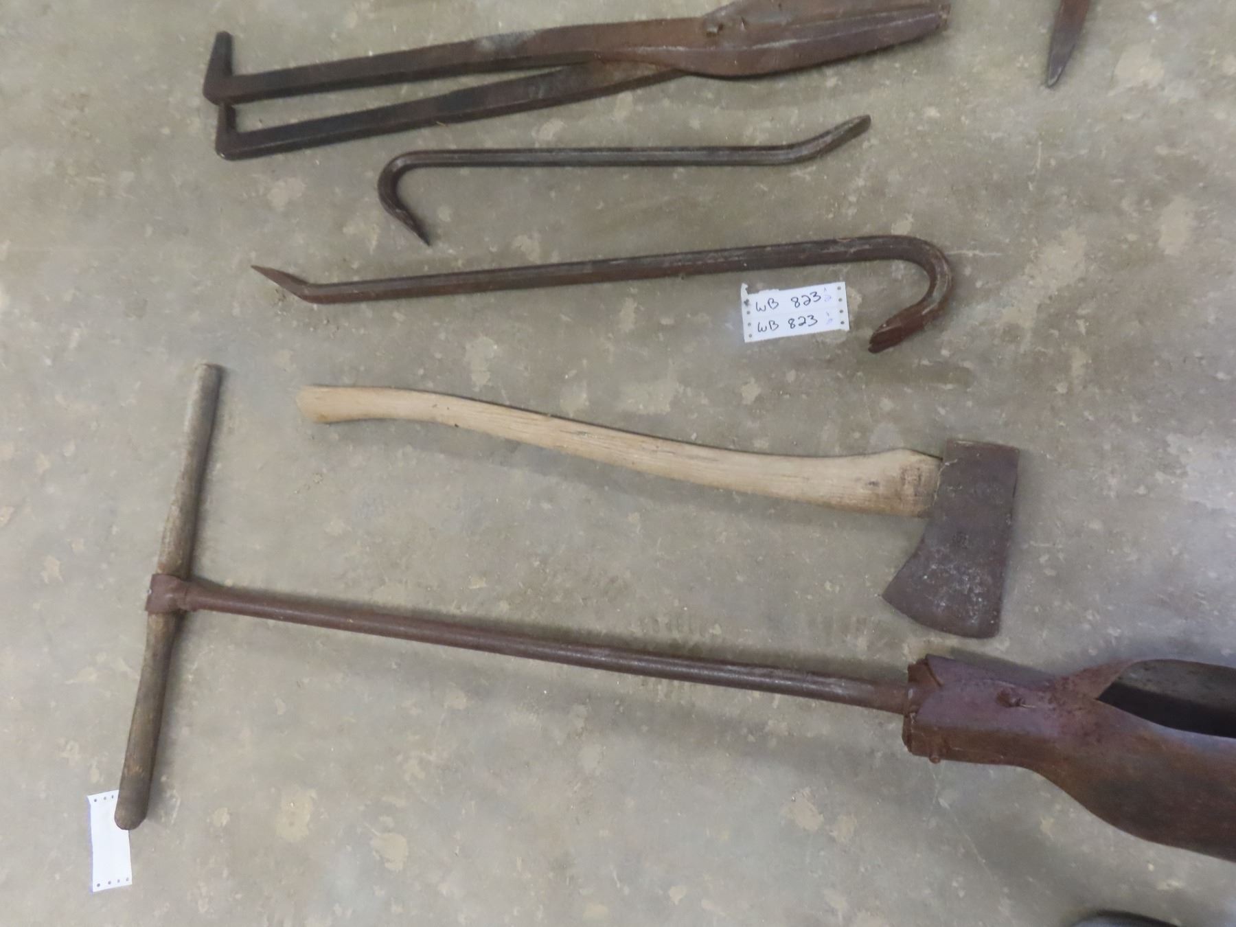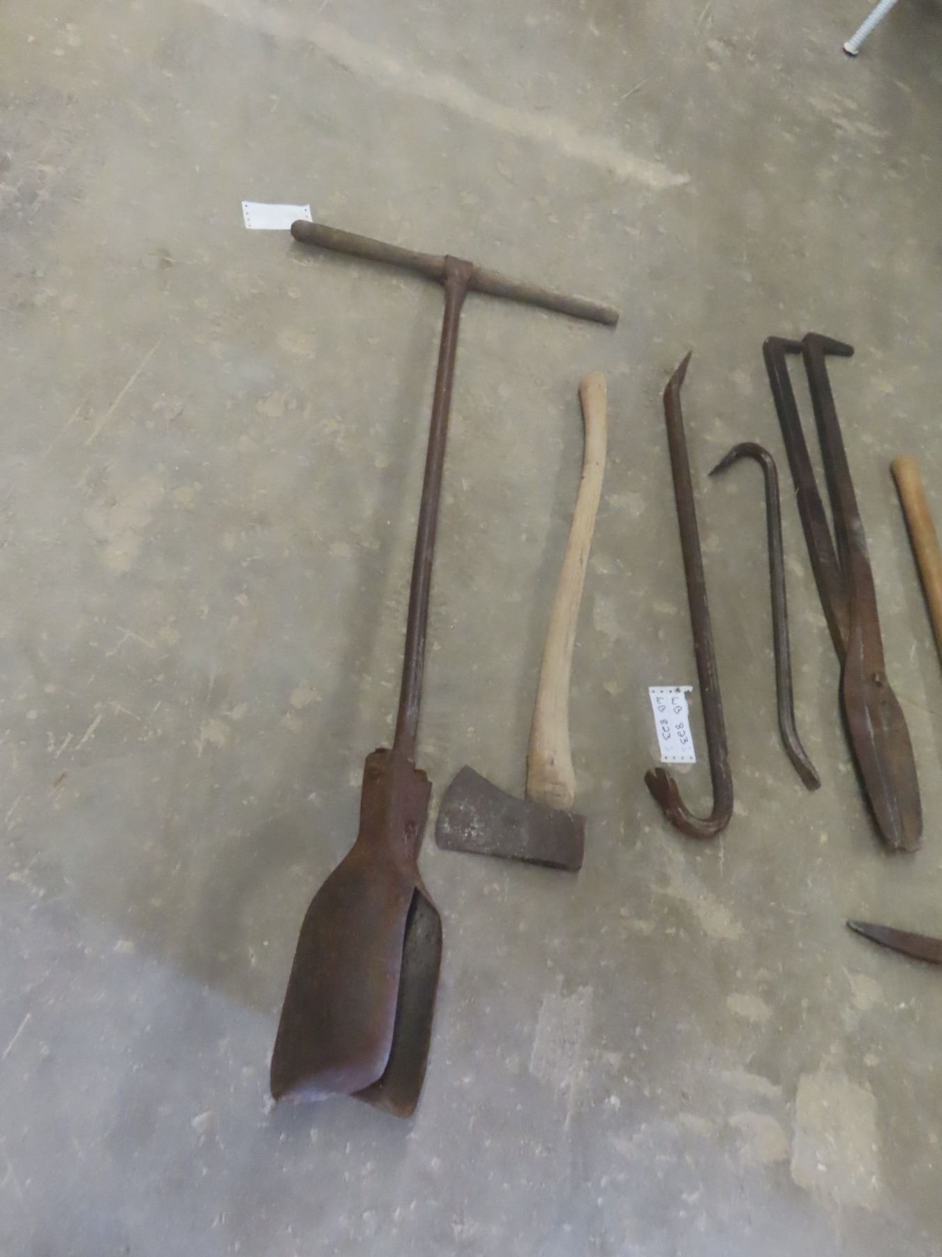 6x Hand Tools, Post Hole Digger, Axe, 2 Wrecking Bars, Pliers, Snips